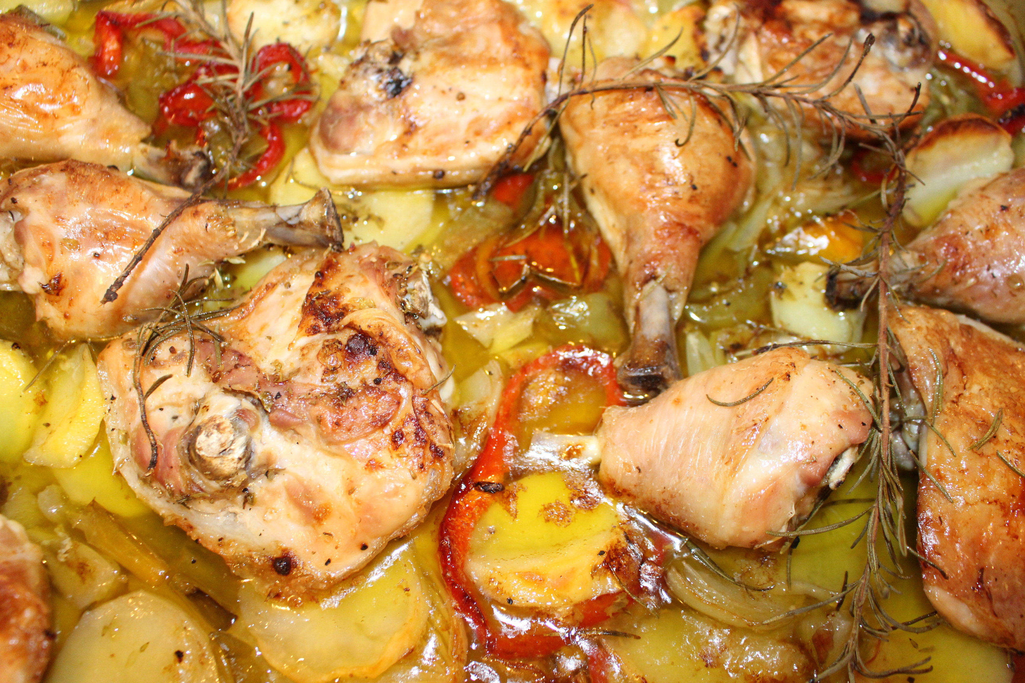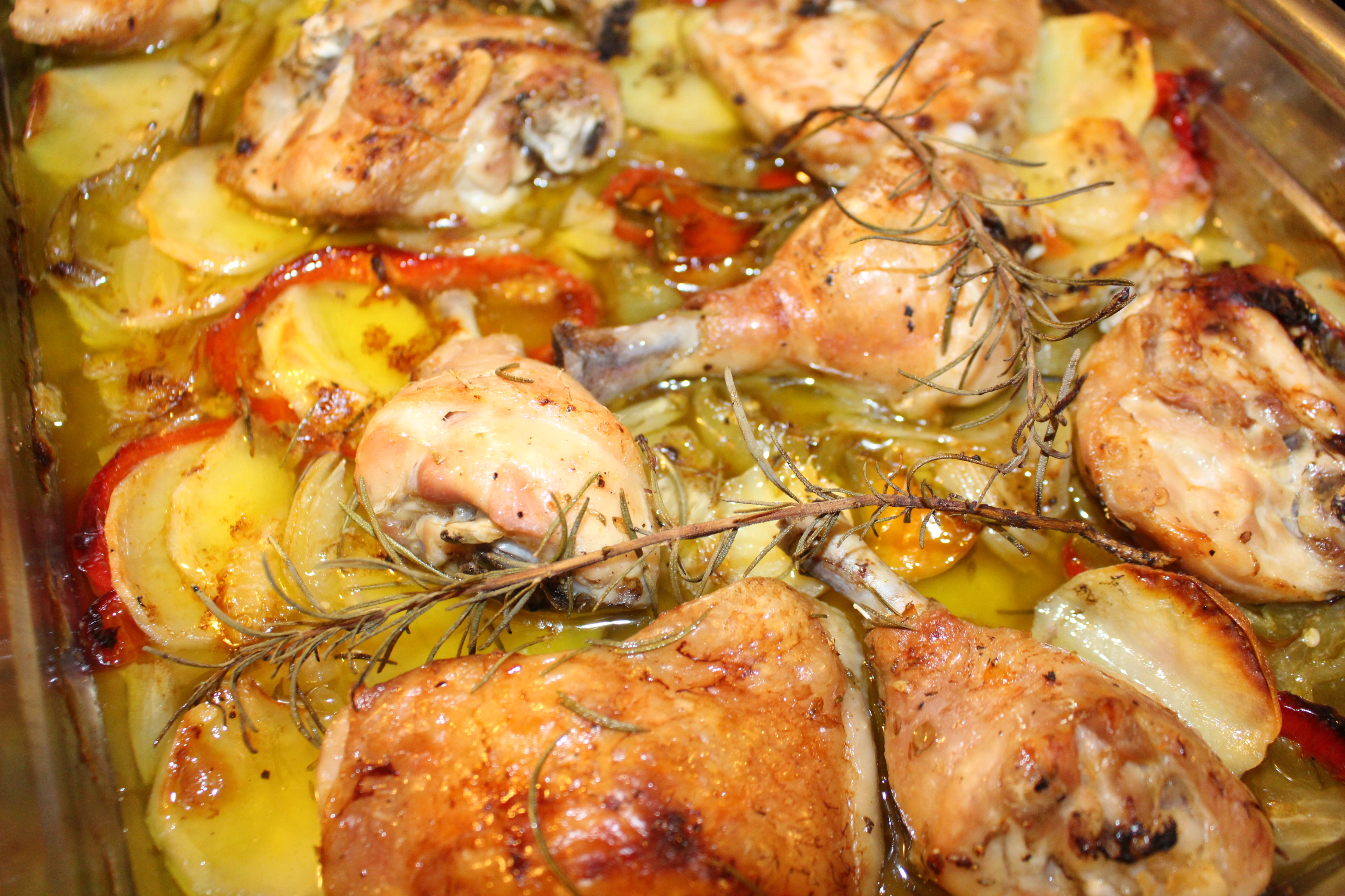 A mitad del horneado saco la bandeja y riego los ingredientes con un buen chorro de brandy, doy la vuelta a los contramuslos y los dejo hasta que veo que el pollo esta dorado y con la piel crujiente.
