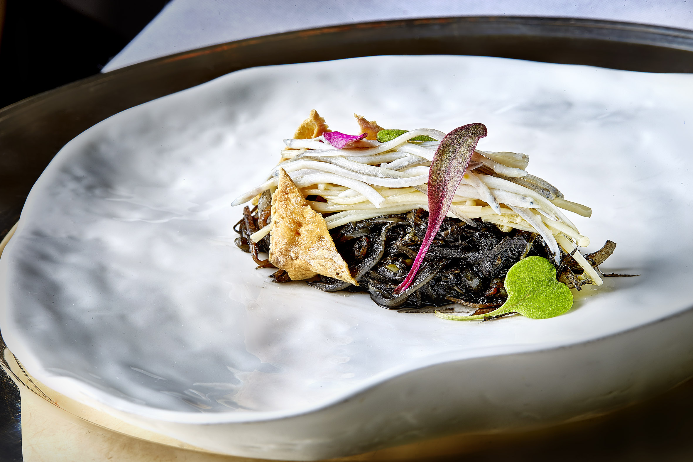Txoco encebollado en su tinta con setas crujiente de quinua y angulas