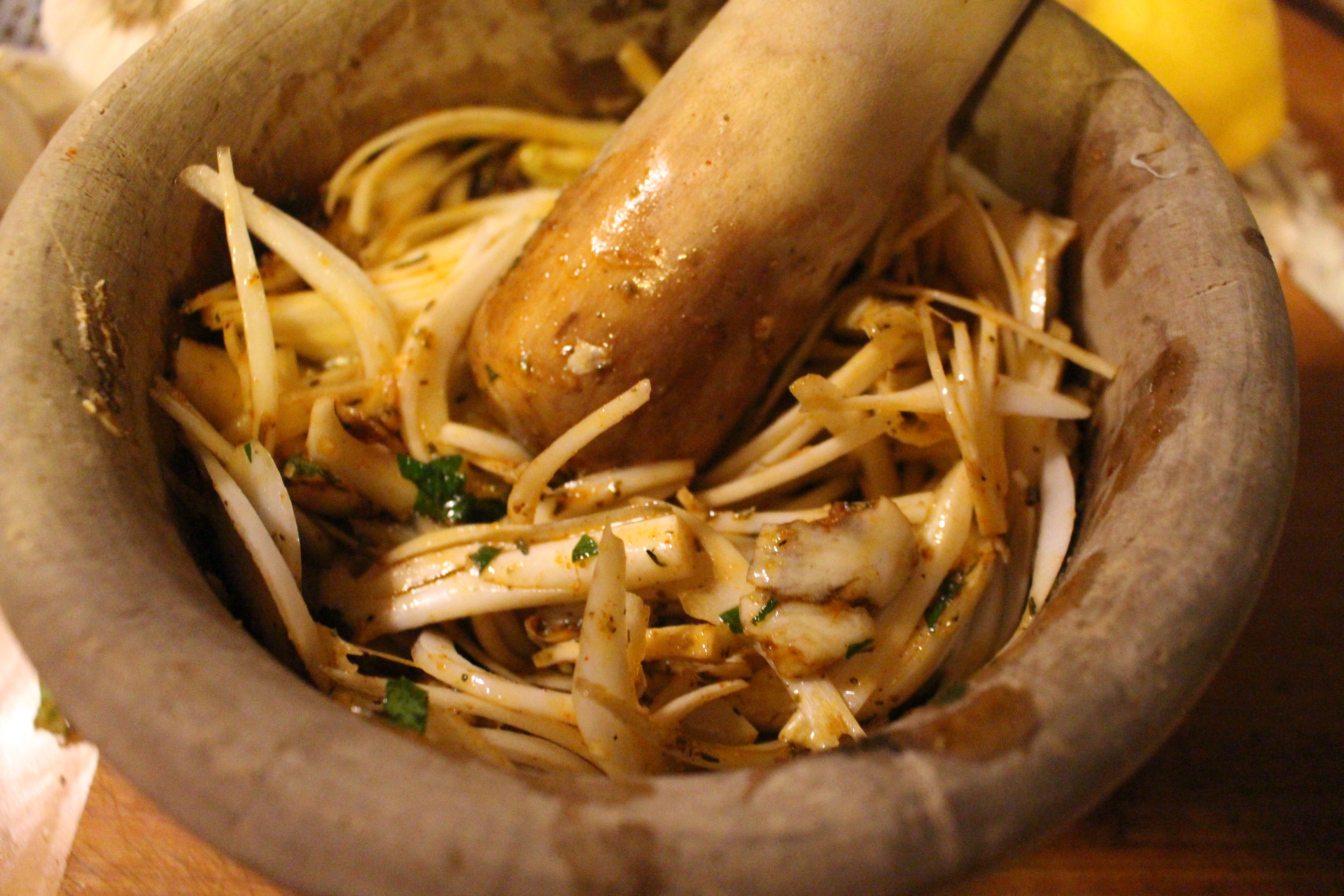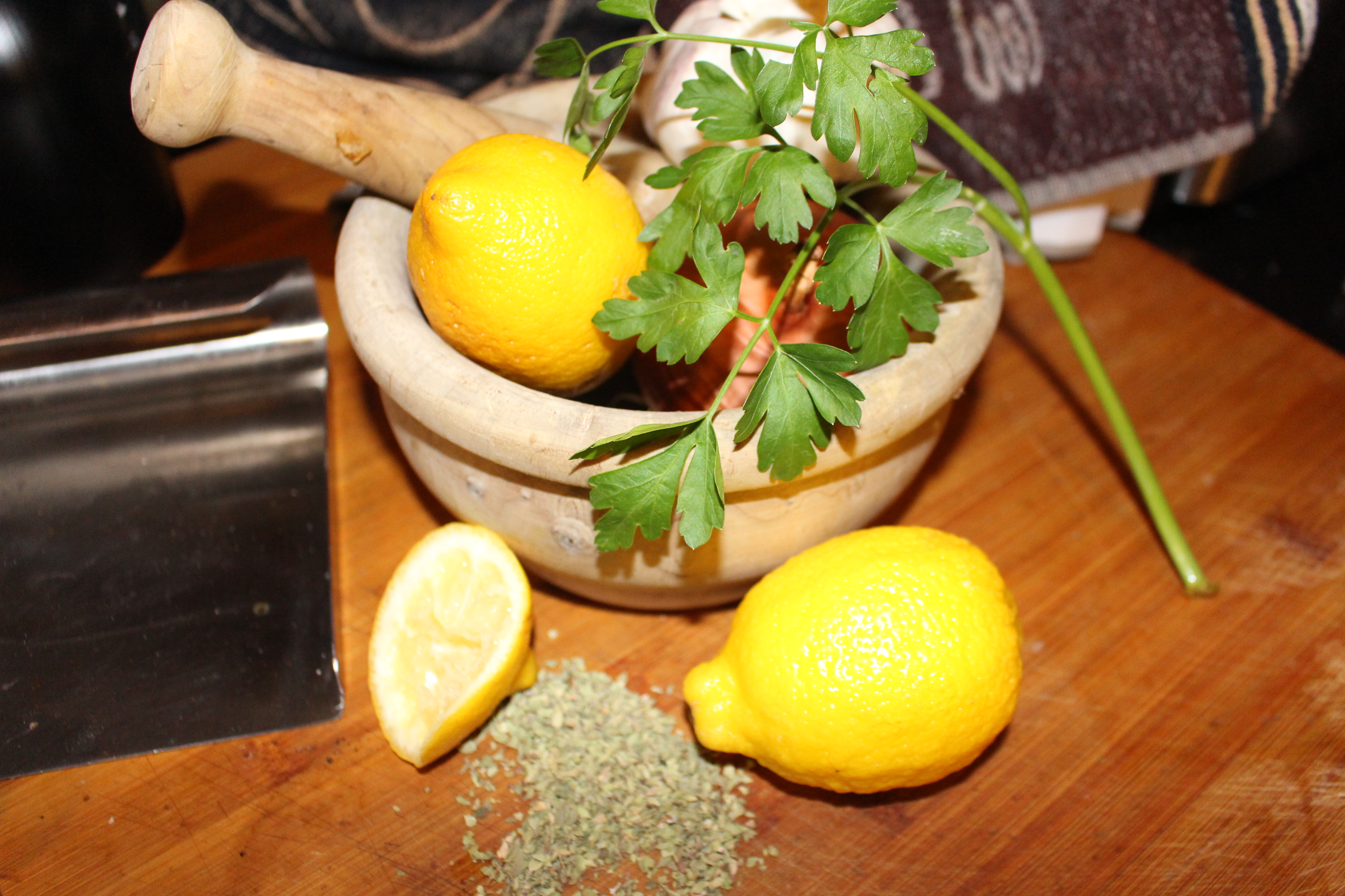En un mortero trituro los dientes de ajo y voy añadiendo las hierbas, orégano, tomillo, romero, perejil picado. Le he puesto un poco de Pimentón de la Vera, añado la cebolla cortada en juliana, la ralladura de limón, el zumo, un chorro de vino blanco, el aceite de oliva, la sal y la pimienta.