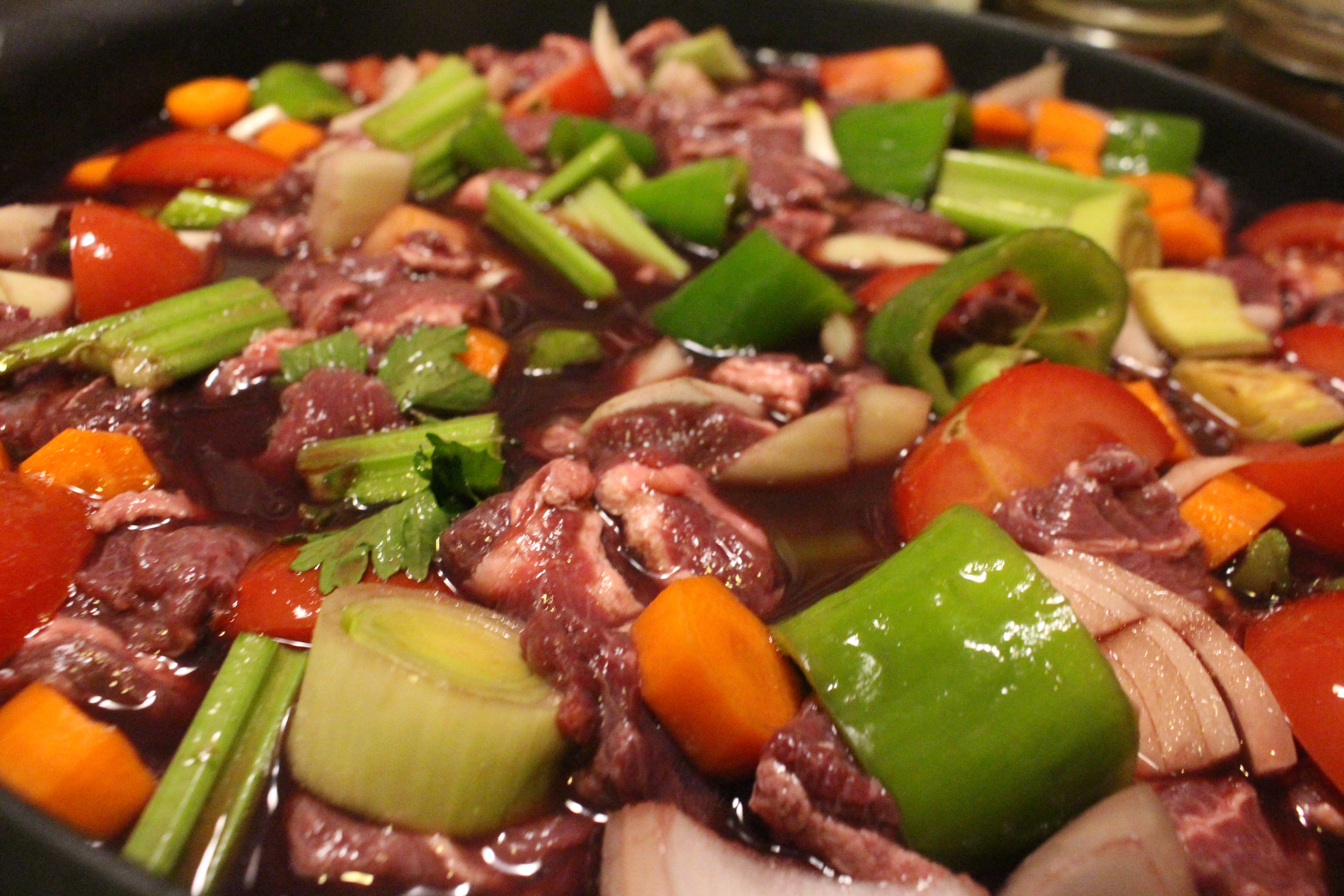Vamos con las verduras: troceamos la cebolla, las zanahorias peladas, el apio en rama los tomates y los dientes de ajo.  Reducimos el caldo de carne y el vino tinto de calidad media  y lo añadimos a la cazuela con la carne y las verduras. Guardamos todo en la nevera para que maride durante 10 horas, según las indicaciones del maestro Berasategui.