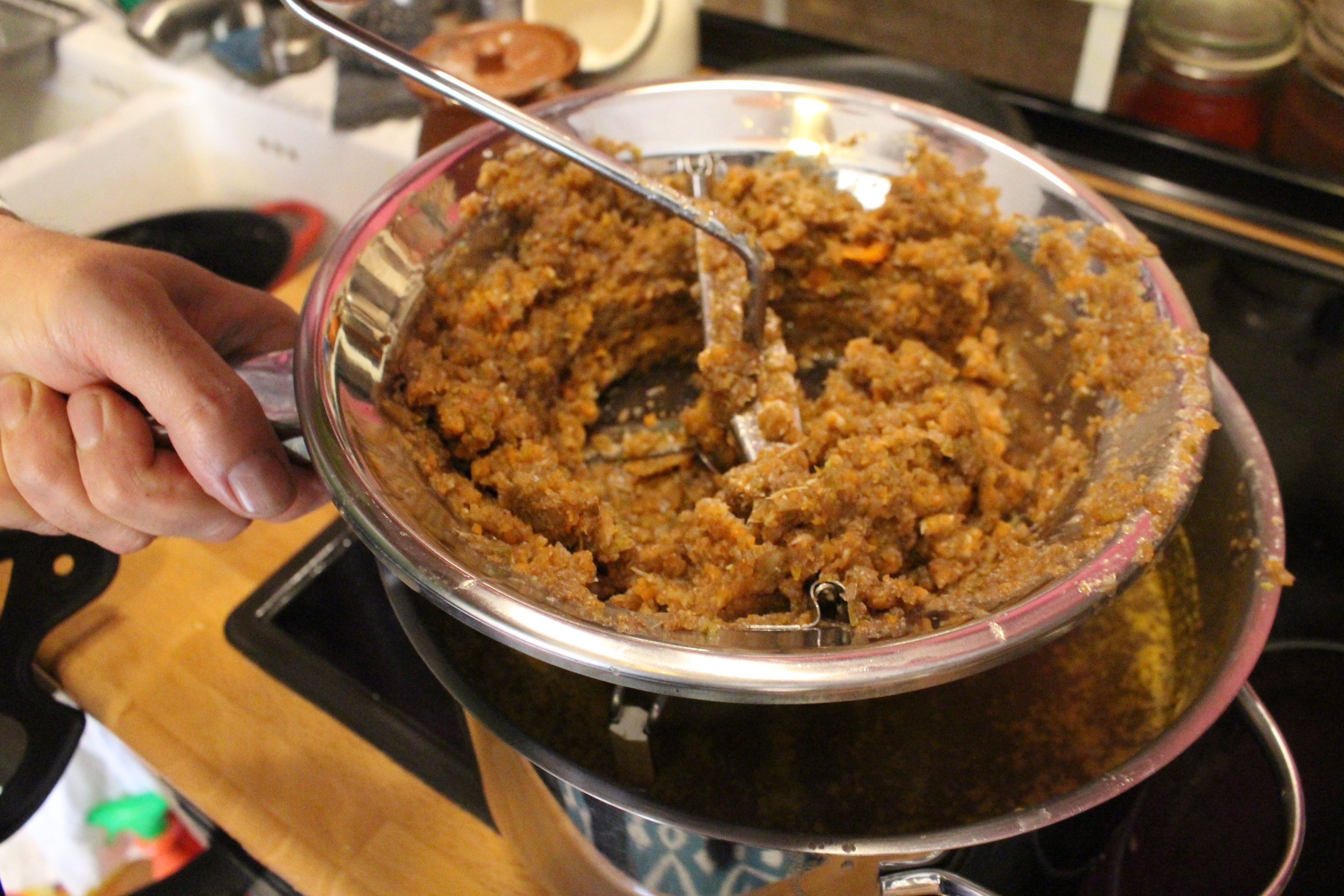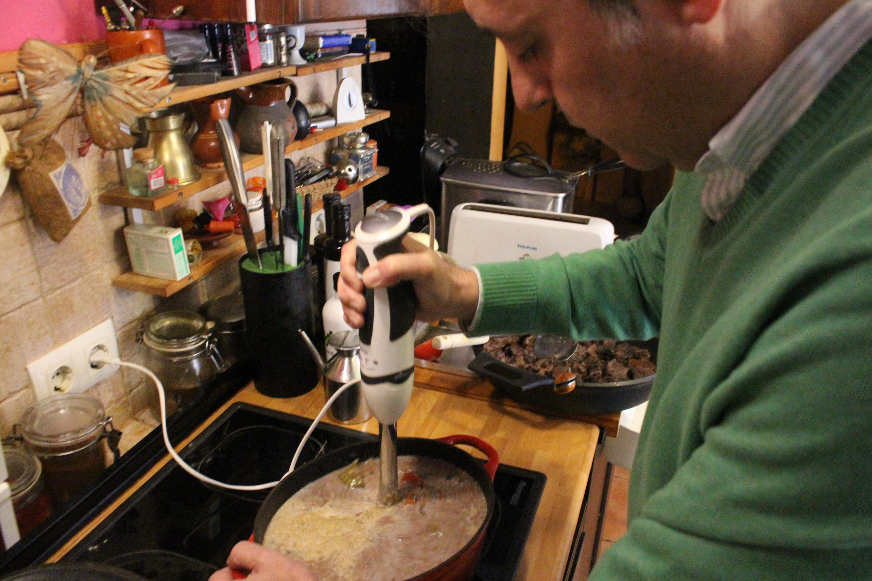 Retiramos del horno y separamos las verduras y el caldo de la carne y lo pasamos todo por la batidora y luego por un pasa puré.