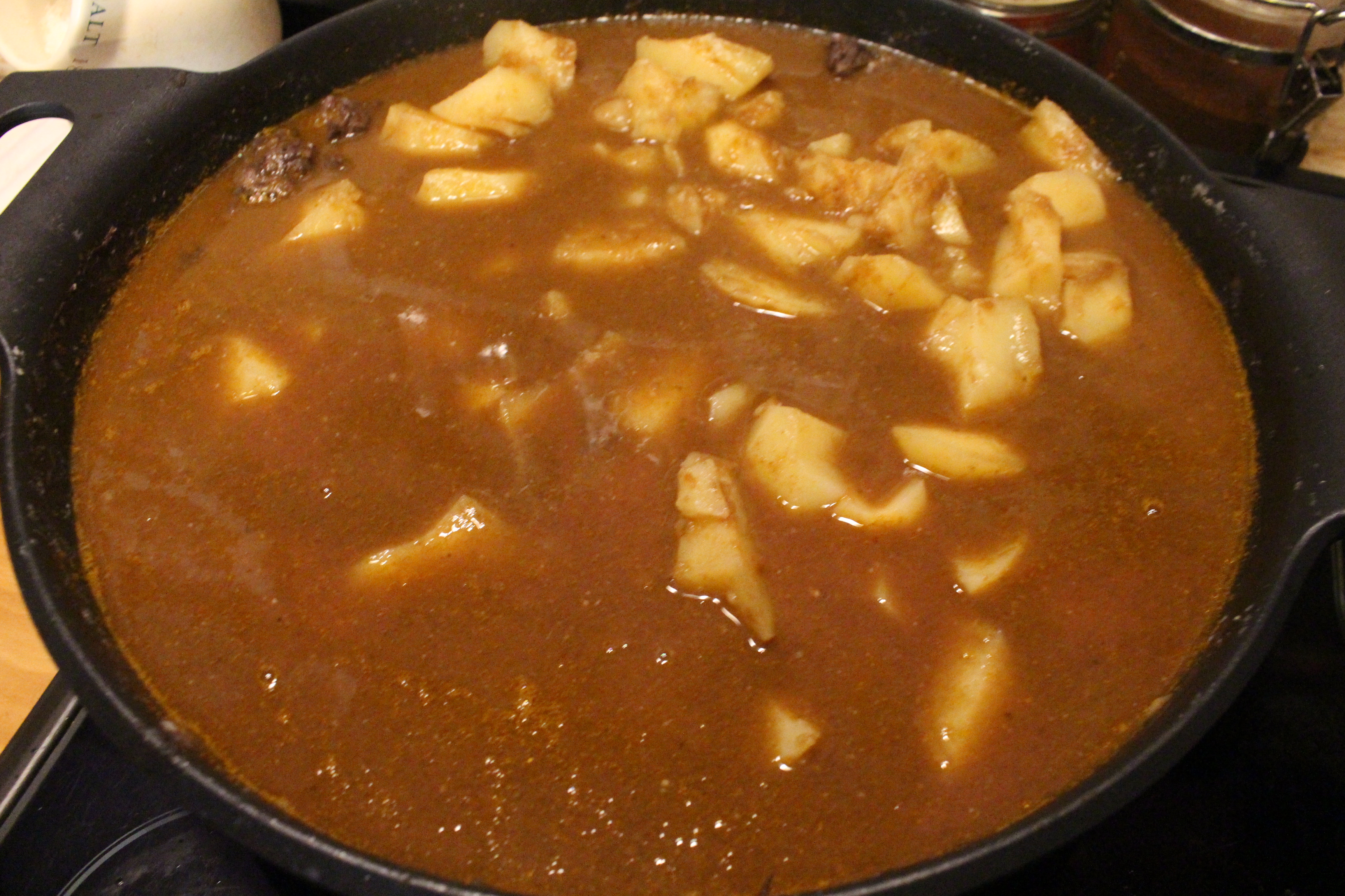 Incorporamos la salsa a la carne, añadimos las patatas cortadas haciendo chasquido, para que suelten la fécula y espesen la salsa y la dejamos cociendo  hasta que quedan blandas. Unos 20 minutos aproximadamente.