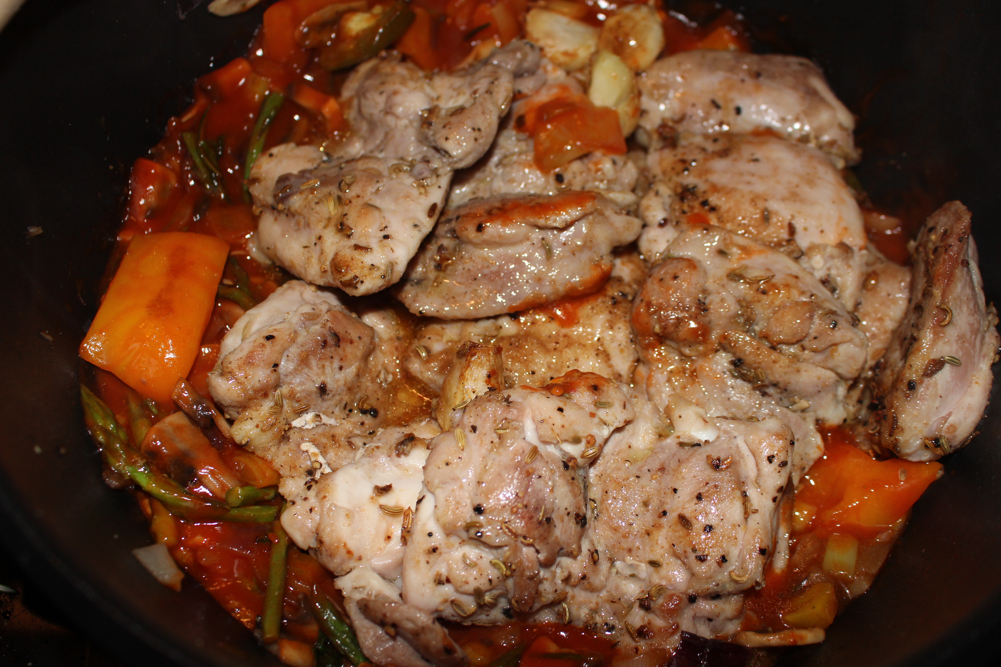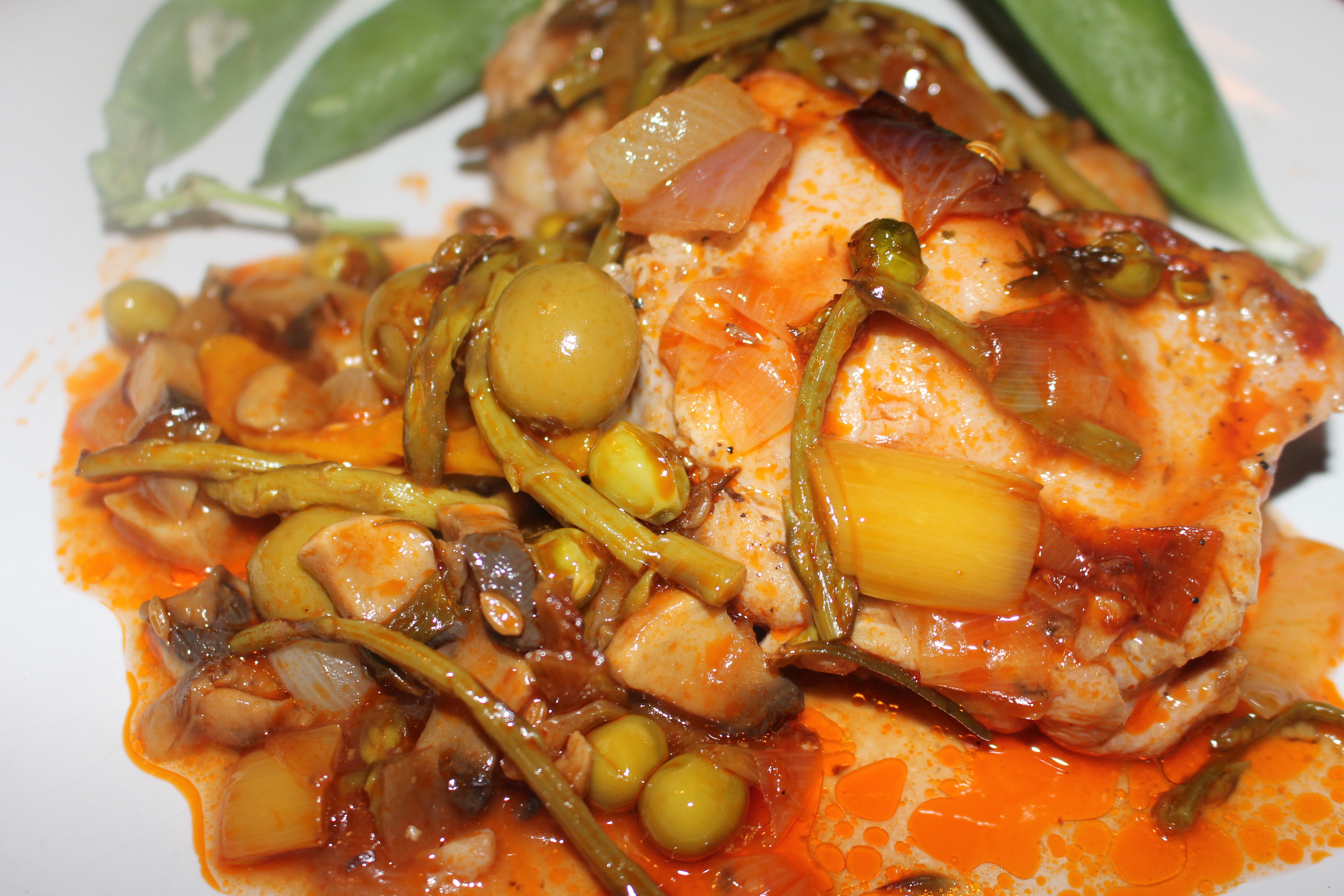 Hoy  he preparado una receta llena de sabores y colores, unos contramuslos de pollo con verduras de temporada que he bañado con cerveza.  Me han traído unos espárragos trigueros salvajes que he añadido al guiso junto con champiñones, pimientos, aceitunas y especias.