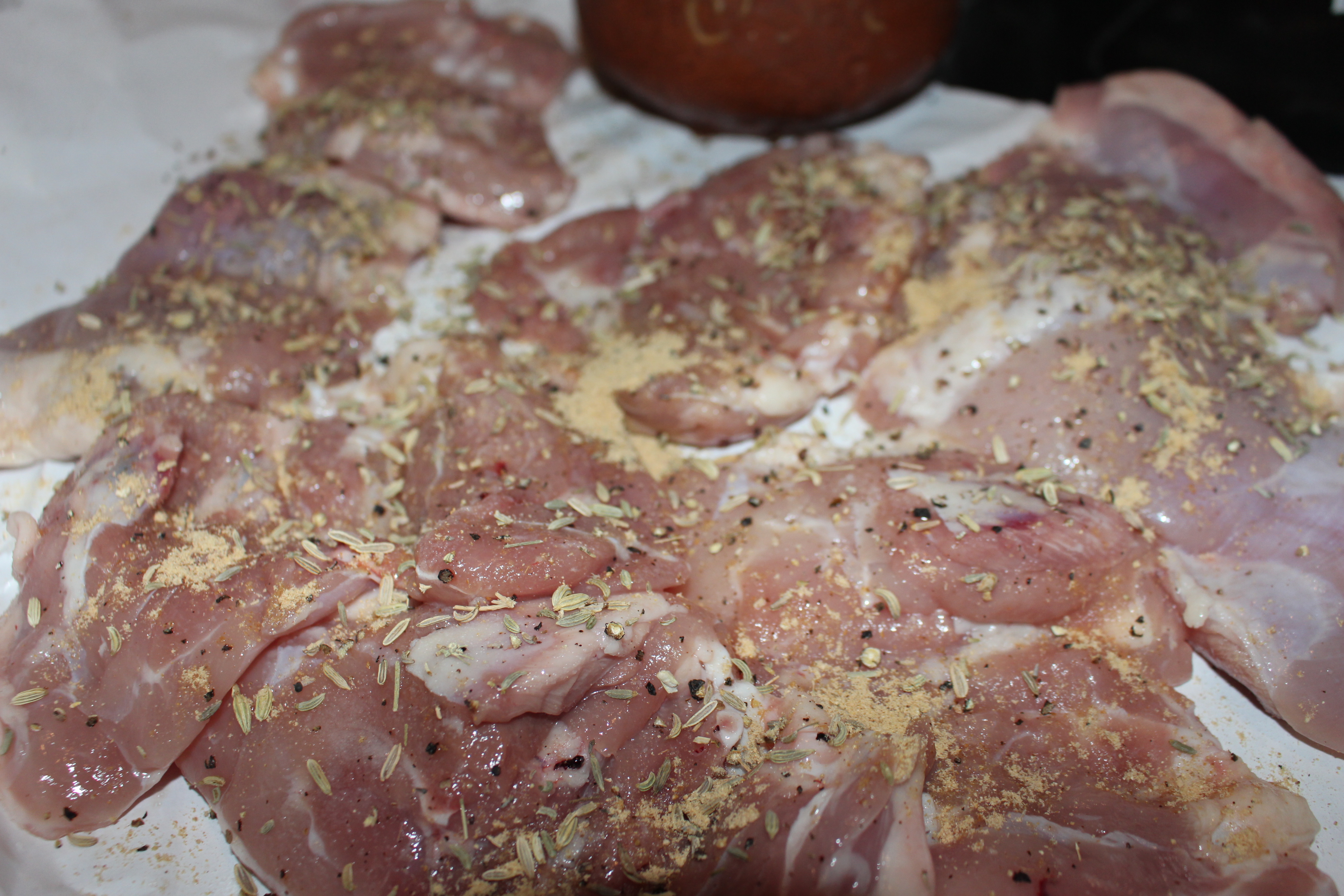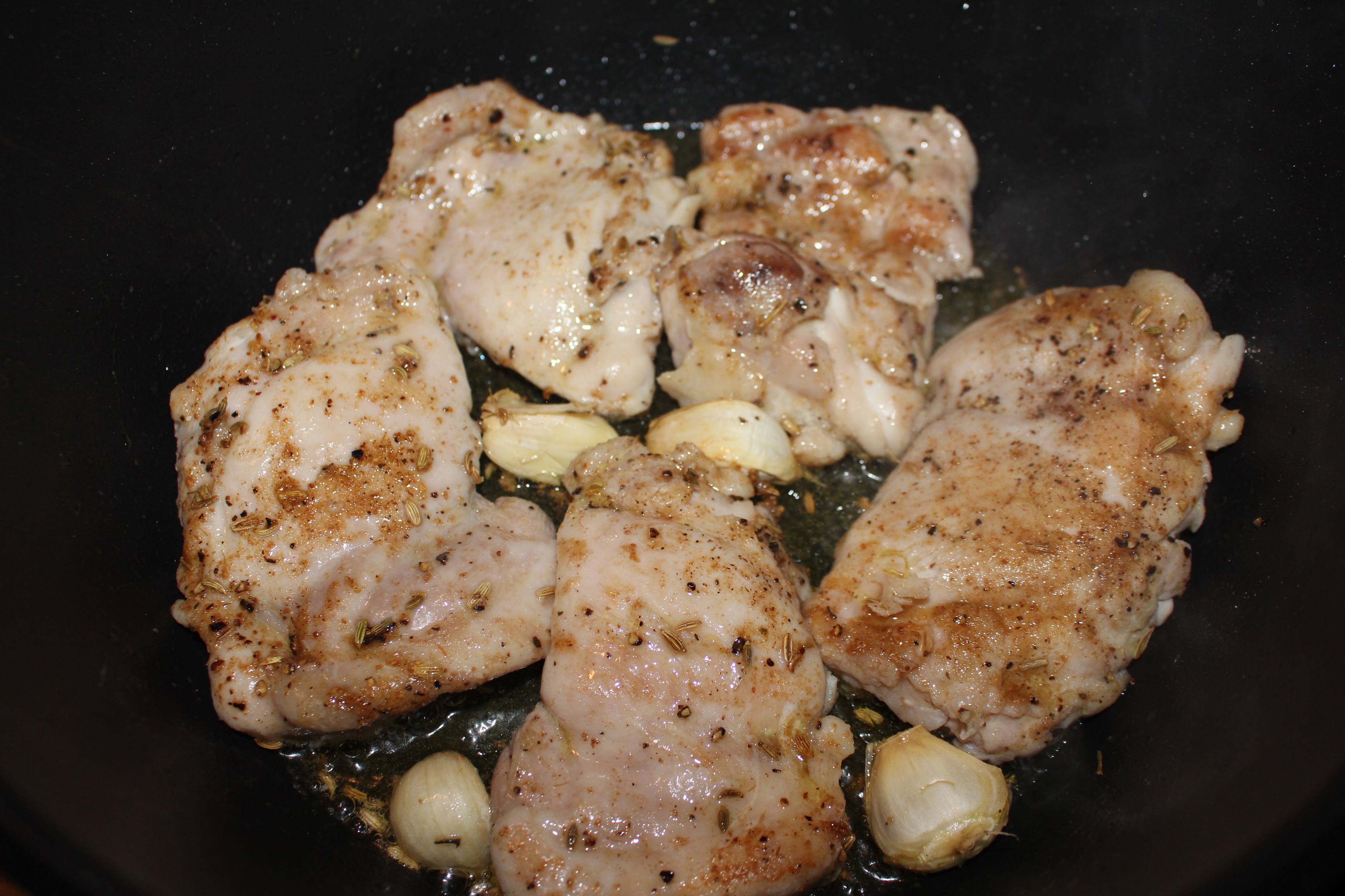 Salpimentó los contramuslos y los especio con hinojo. Los doro en la olla con cuatro dientes de ajo.