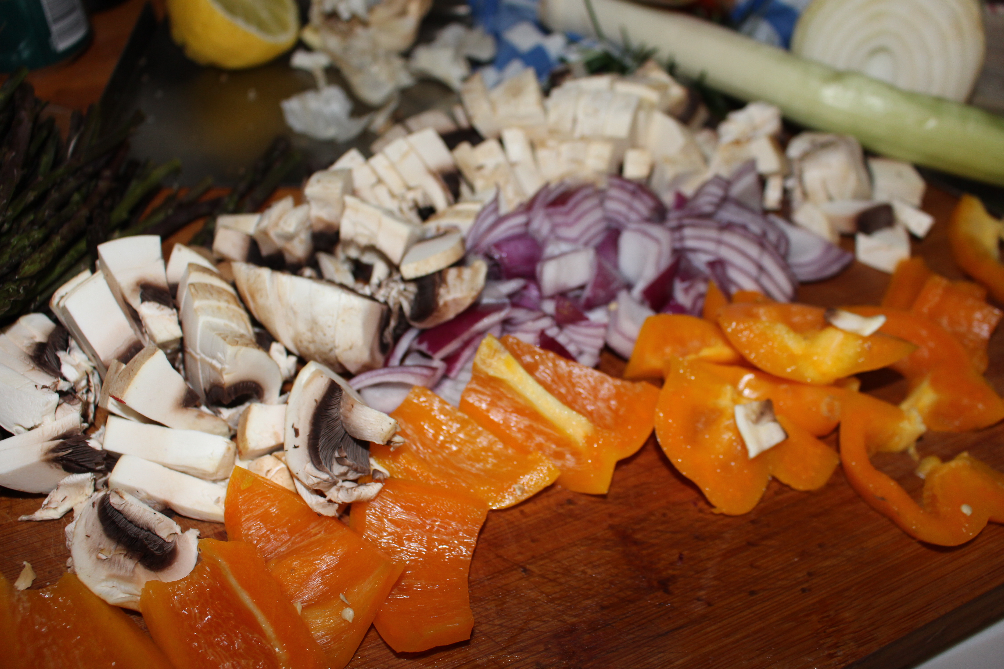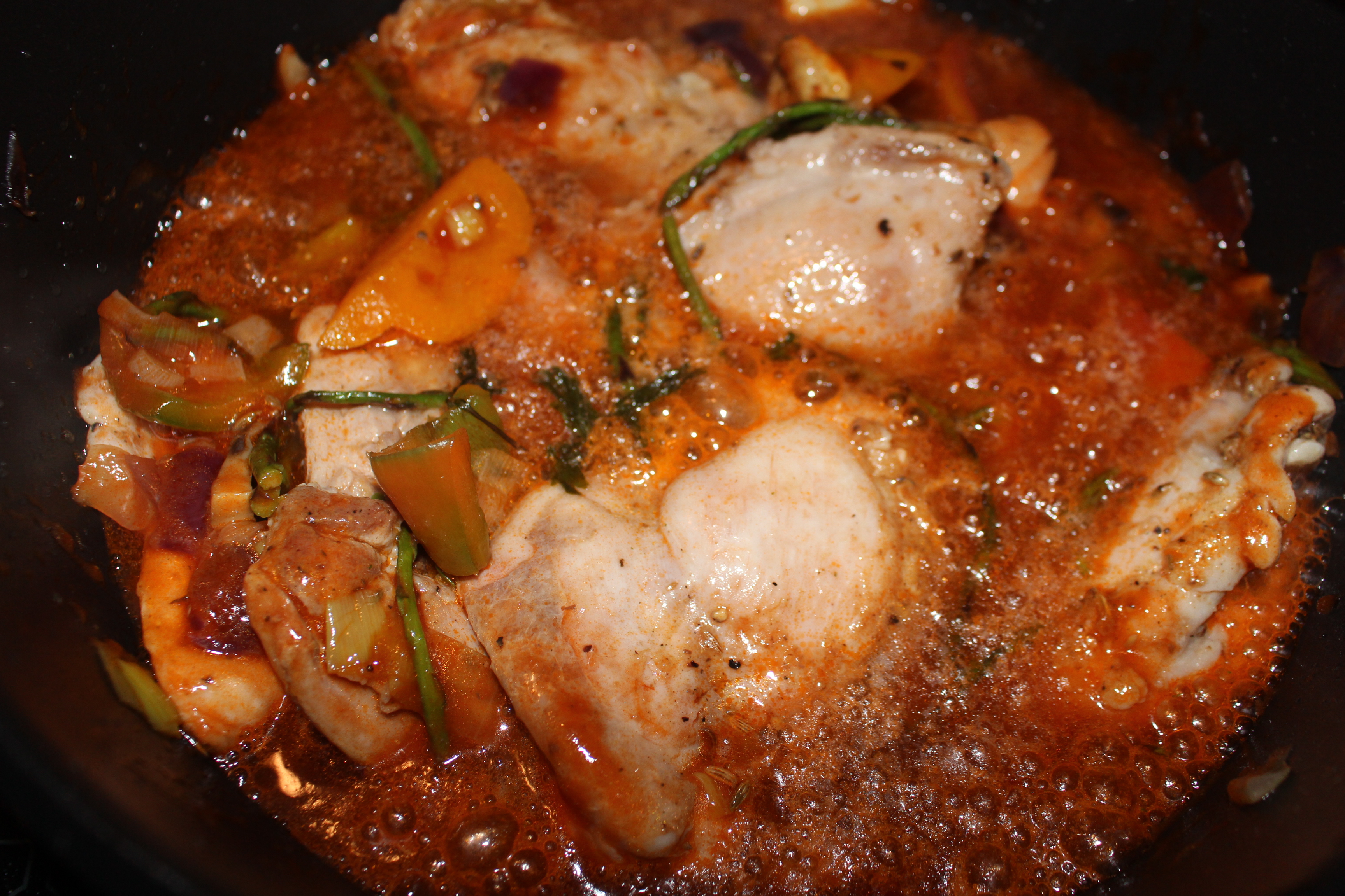 Los retiro y en ese mismo aceite voy pochando las verduras que he cortado en trozos grandes. Junto el pollo con las verduras le doy unas vueltas y lo riego con un bote de cerveza y un vaso de caldo de pollo para que cubra el guiso.