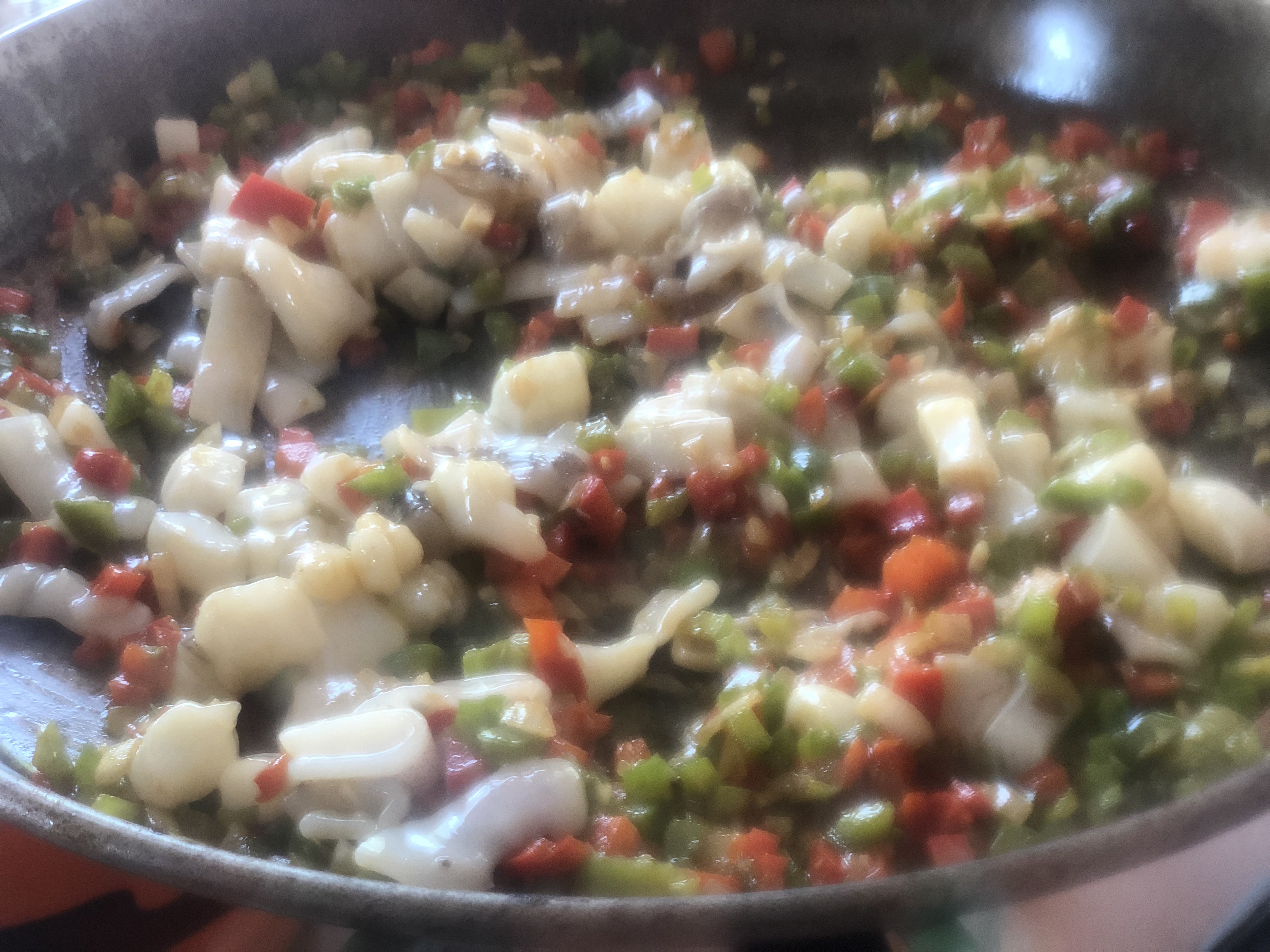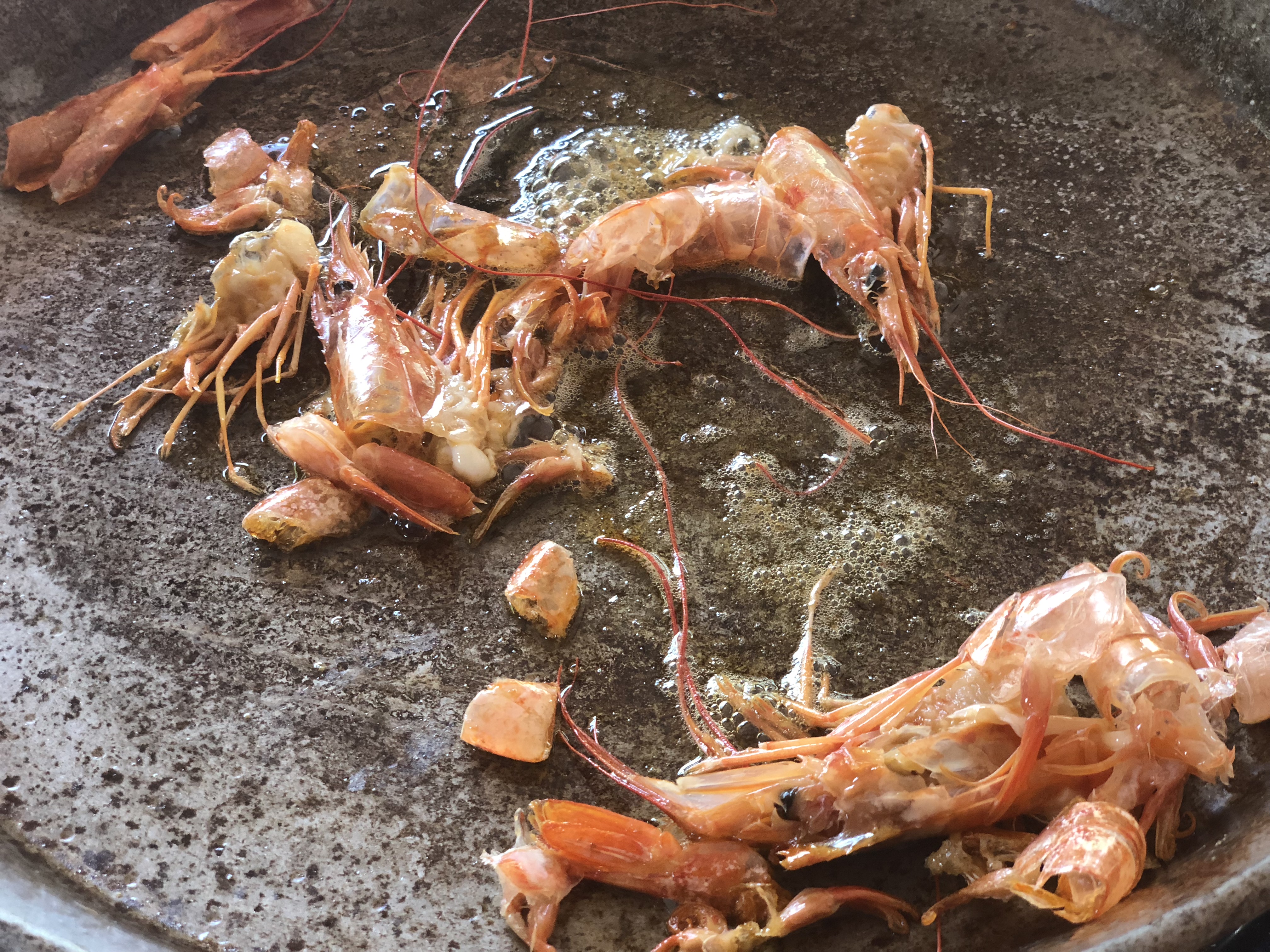 En la paella pongo las cascaras y cabezas de los gambones con un chorro de aceite de oliva para que coja sabor, los retiro y añado las verduras, cuando están pochadas, coloco en la paella los calamares y los chipirones.