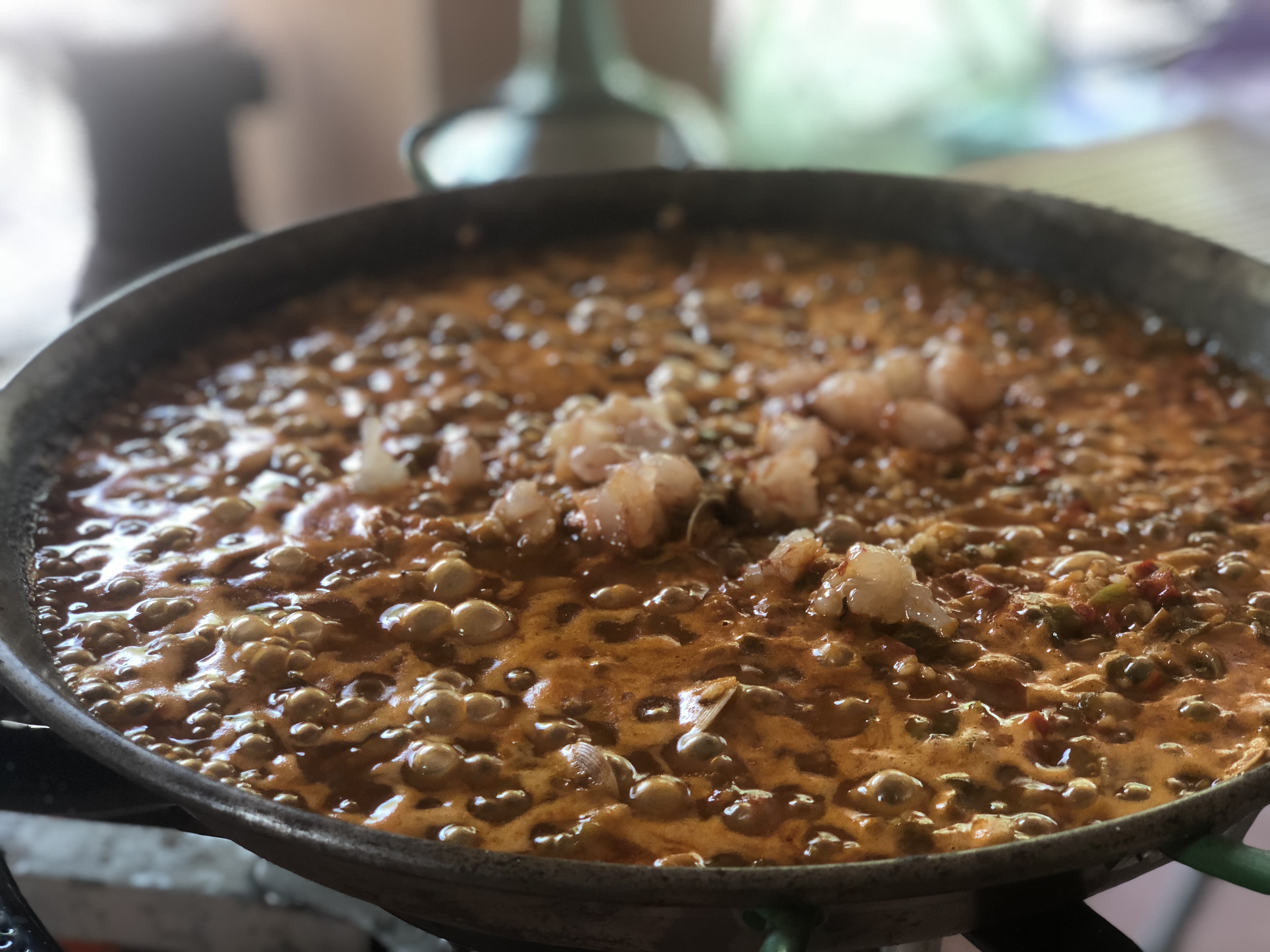 Cuando están tiernos añado el tomate natural y el vino blanco. Dejo que evapore el alcohol. Pongo el arroz y le doy unas vueltas con el resto de los ingredientes e incorporo el fumet. Un poco de hebras de azafrán y una cuchara de pimentón de la Vera. Subo el fuego para que se haga bien por todos sitios. Por último coloco las chirlas y los gambones troceados.