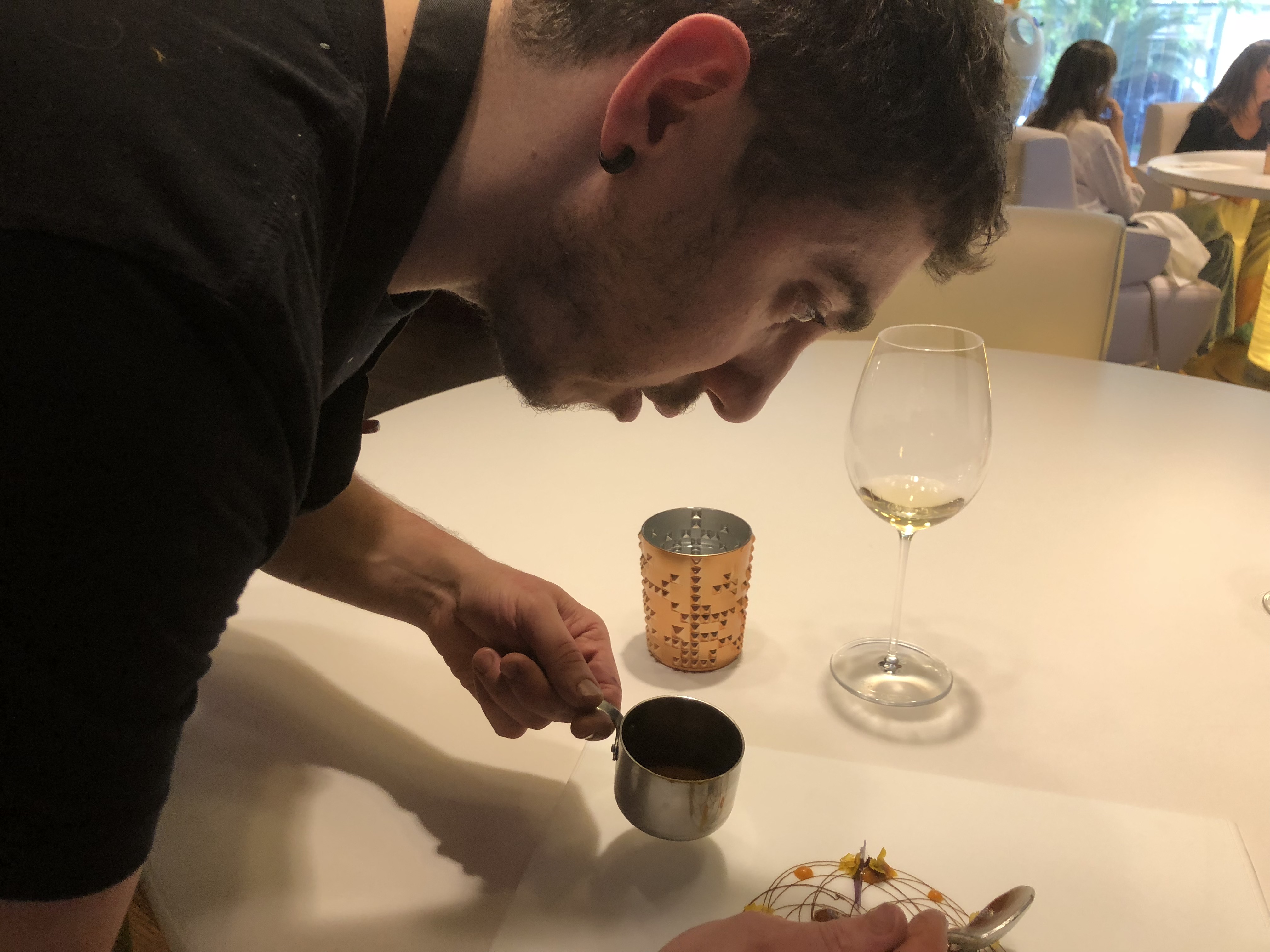 Al Extremo Oriente y Latinoamérica, dos fuentes de inspiración constantes para Dabiz se une el vigor y versatilidad de la riquísima cocina india (que decir de esas lentejas massala con yozu, suero de mantequilla de oveja y clorofila con guarnición de caviar brevemente asado al horno tandoori). El carrusel no para. Viajas a la velocidad de la luz a través de sus recuerdos viajeros por Nápoles a través de un dumpling de vino tinto y ragout de pichón estofado con una base de tomates sicilianos. Tuve el inmenso privilegio que el propio Dabiz preparara en mi propia mano un erizo con caviar cítrico, velo de ragaliz-ajo negro, salsa Bearnesa japonesa y perfume de Bergamota mientras evocaba las sensaciones que le provocó comer con las manos erizos en un mercado japonés. El carrusel sigue sin parar. Tiene destellos patrios y hasta localistas, Dabiz no olvida su condición madrileña, cuando degustas su bocata de calamares o la Spanish Tortilla guisada con callos de bacalao y puntilla de huevo frito. Consigue trasladarte a las parrillas vascas con espectacular cigala de tronco asada y al luminoso sur andaluz con su bolognesa de esencia de carabineros y sashimi tibio de quisquilla de Motril.