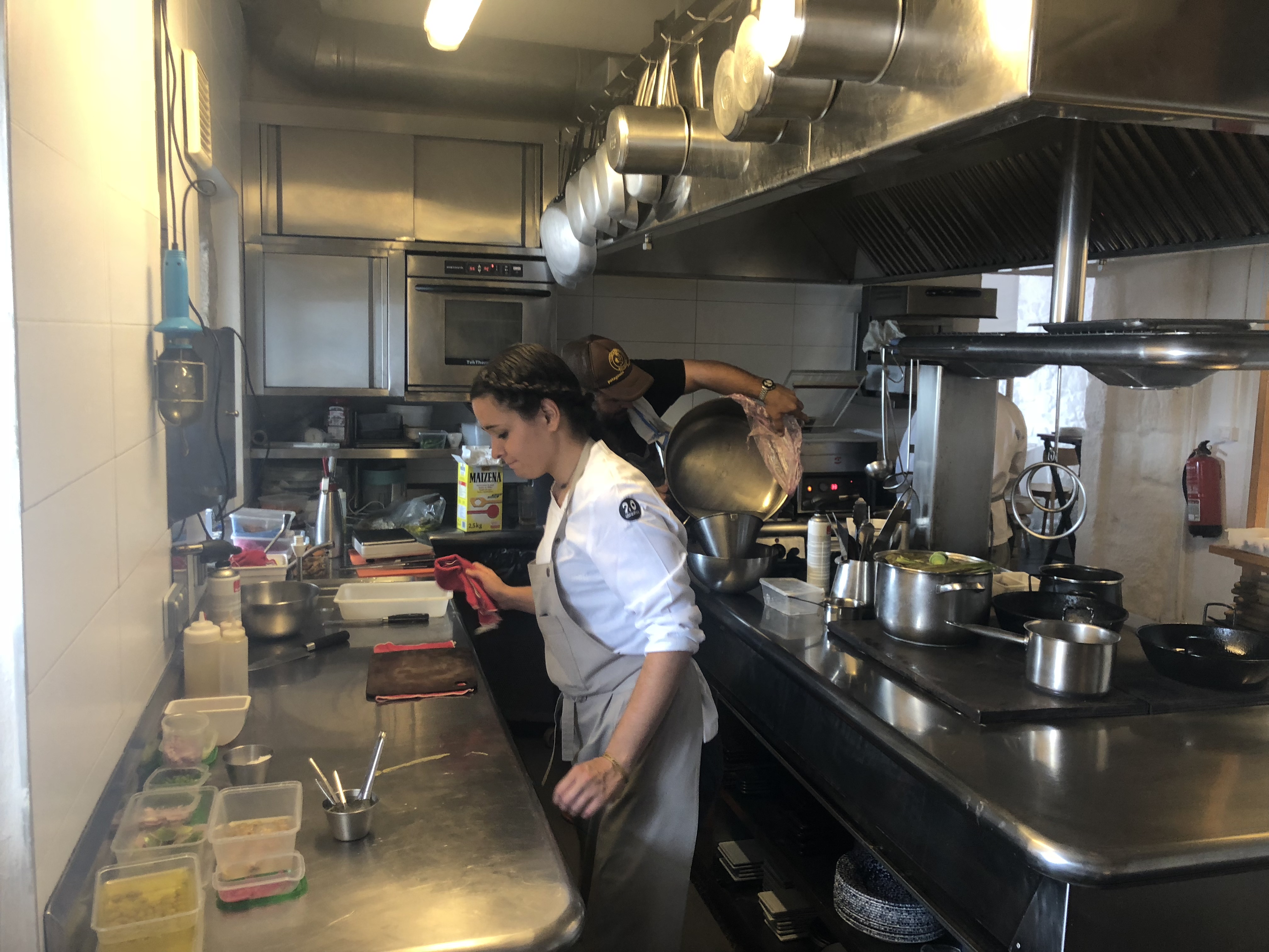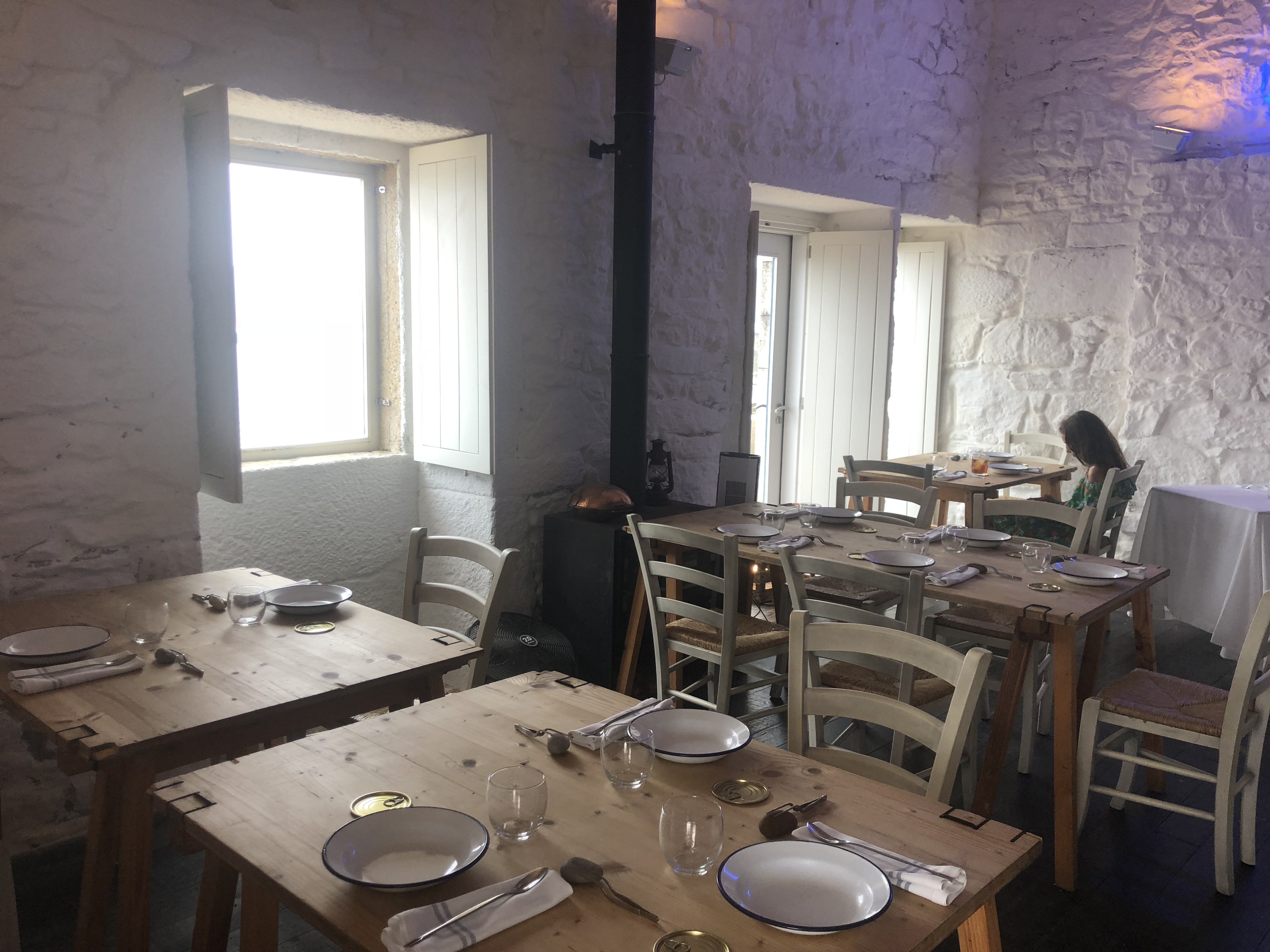 A la preciosa terraza abrazada al paseo marítimo y abocada al mar infinito, se suma un sencillo salón muy luminoso de un blanco impoluto y una ordenada cocina asomada a una larga mesa donde el comensal que quiera puede tener la experiencia de ver como se cocinan los platos que cocina Marcos y su equipo.