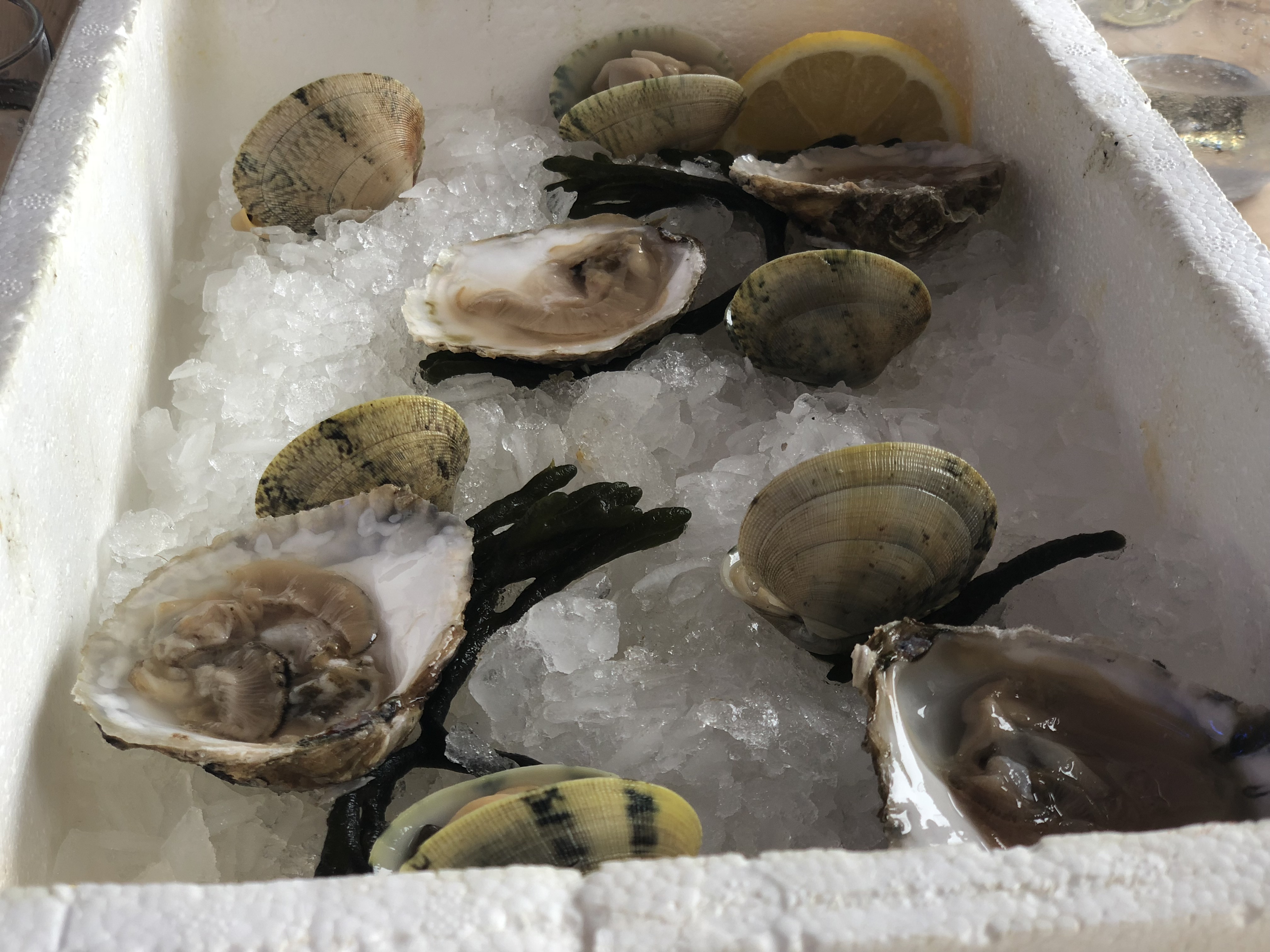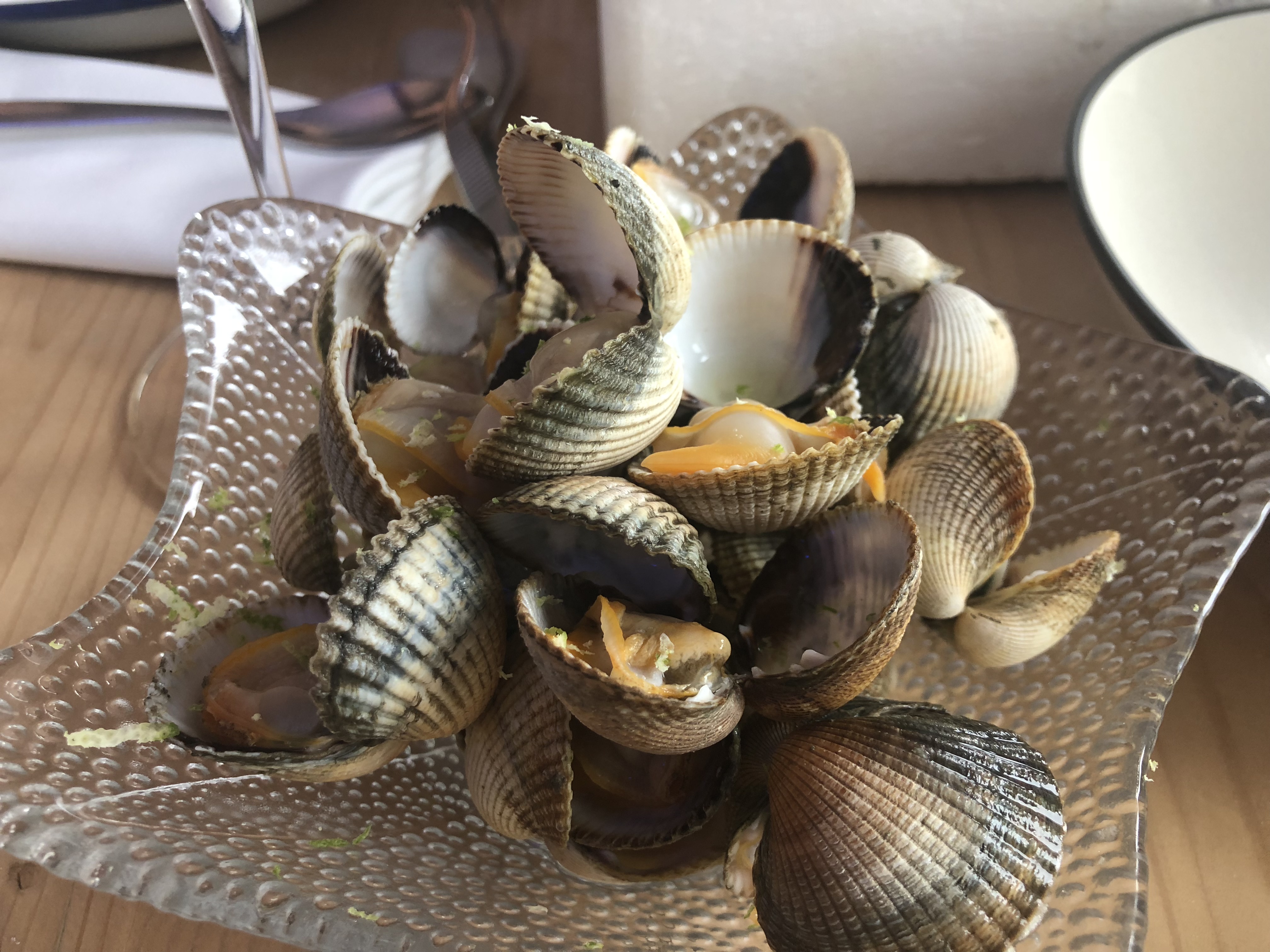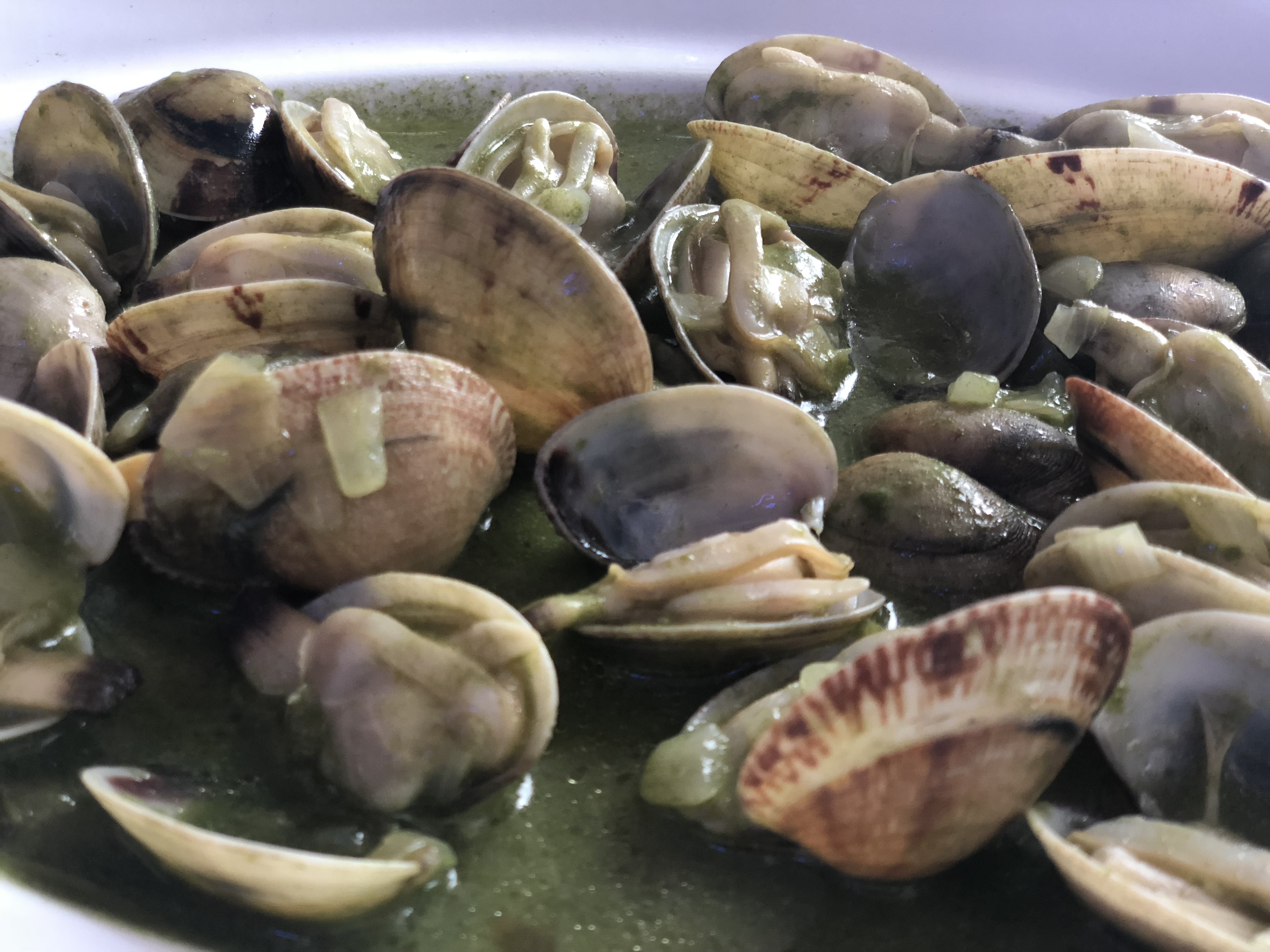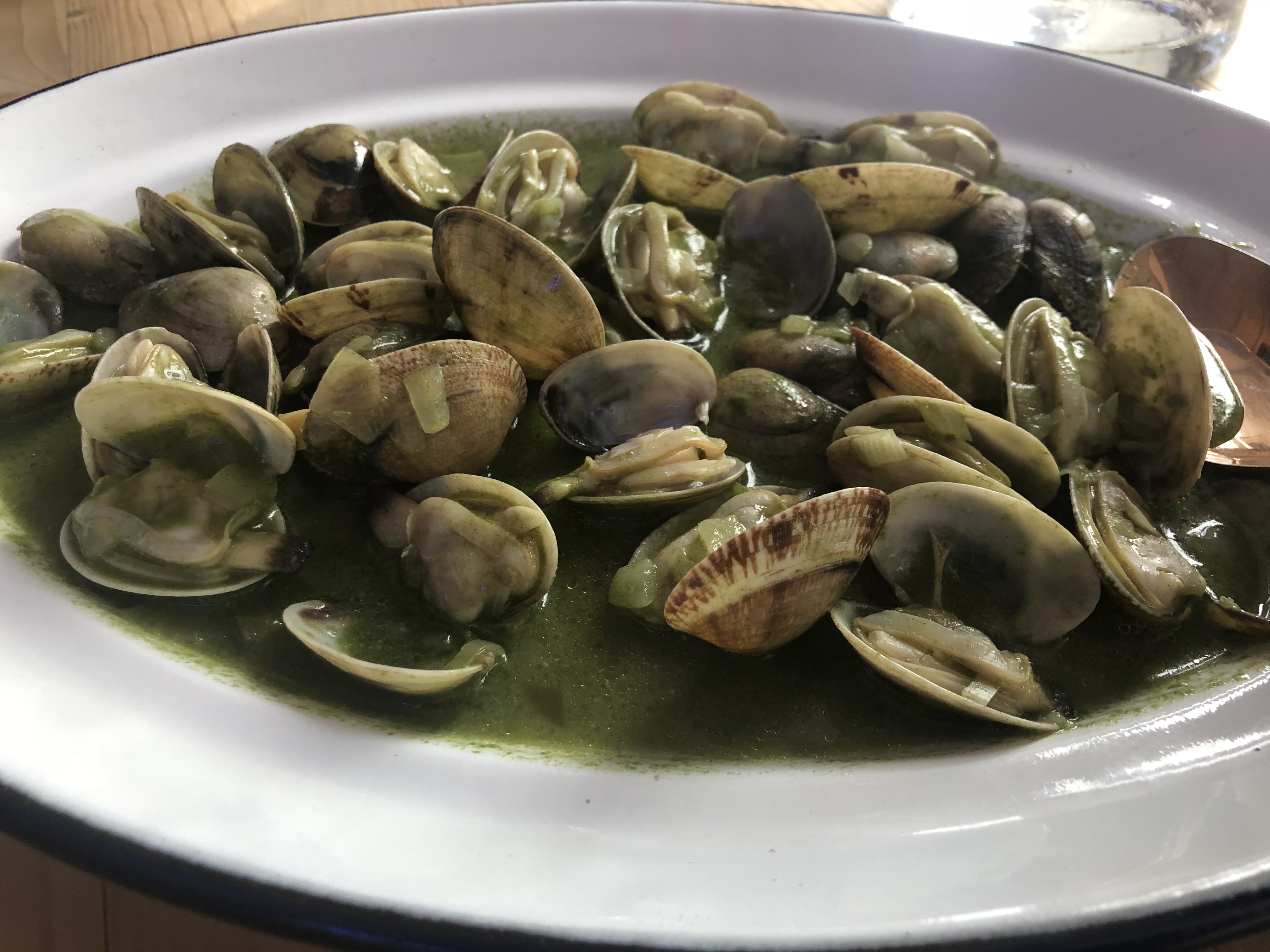 Estando en Carril no podía dejar de degustar sus célebres almejas, al natural y otras almejas babosas en una salsa de jalapeños sabrosísimas. Puedo decir si miedo a equivocarme que son las mejores almejas que he probado nunca. Unas ostras y unos descomunales berberechos con un ligero toque cítrico de lima pusieron el broche a los entrantes. La deliciosa comida la completé, por sugerencia de Andrés, con un pescado fresquísimo del día, un jurel a la brasa, pleno de sabor. De postre una sugerente manzana marca de la casa. Todo por 45€ por persona.