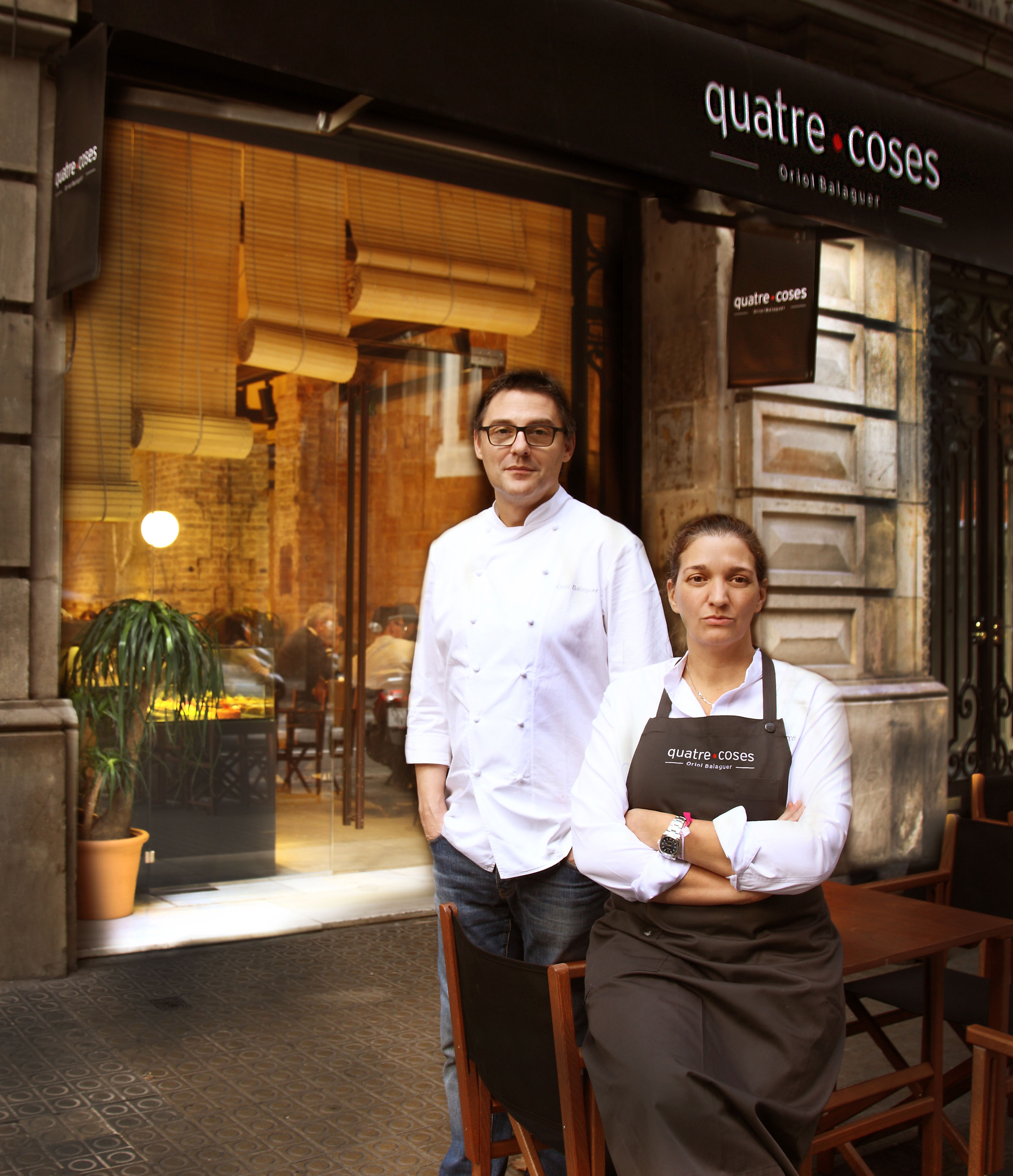 En Quatre Coses Coses Oriol Balaguer comparte cocina, por primera vez, con su mujer Marta Rams. Ambos comenzaron hace más 20 años, en el equipo de Talaia Mar, restaurante dirigido por Carles Abellán bajo la dirección de Ferrá Adrià. A partir de este momento, Balaguer y Rams comenzaron a trabajar juntos la marca Oriol Balaguer y, durante este tiempo, han alcanzado el reto de posicionar la cultura del dulce a través de sus espacios en Madrid –Boutique Oriol Balaguer y La Duquesita– y Barcelona –Boutique OB, Obrador y Classic Line–.