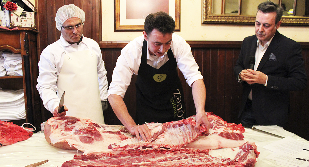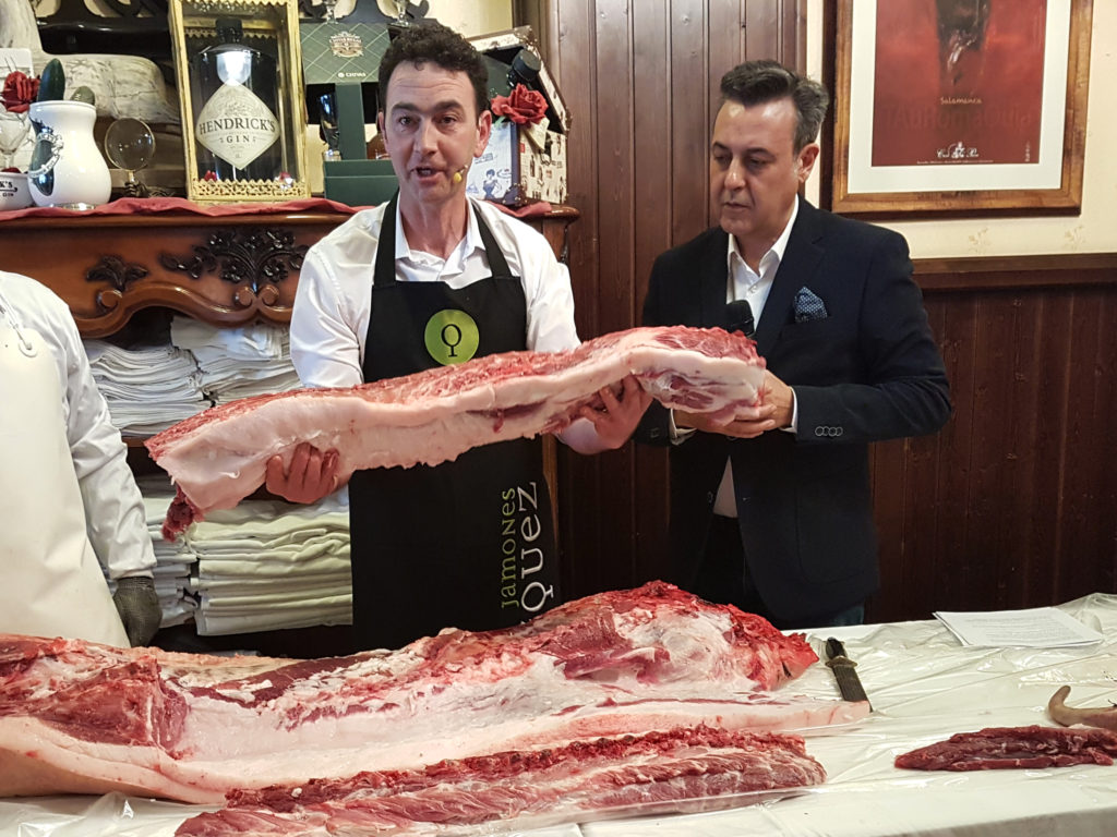 Tras degustar este excelente y único jamón, asistimos a una instructiva exhibición, el despiece de un cerdo ibérico de “Jamones Blázquez”, durante la que pudimos conocer todas y cada una de las piezas del cerdo ibérico que se están comercializando en estos momentos, cada vez con mayor aceptación por parte de los consumidores. El despiece nos permitió descubrir insólitos cortes no suficientemente conocidos ni reconocidos por la opinión pública. A los célebres lomos y solomillos se unen un sinfín de piezas y de cortes plenas de sabor, con ese justo equilibrio entre grasa y carne, que van desde el delicioso lagarto, la pluma o la presa, hasta la ventresca, el abanico o la pata de gallina. Desde aquí os animo a explorar todos estos cortes y muchos más que os alumbraran un mundo desconocido de sensaciones.