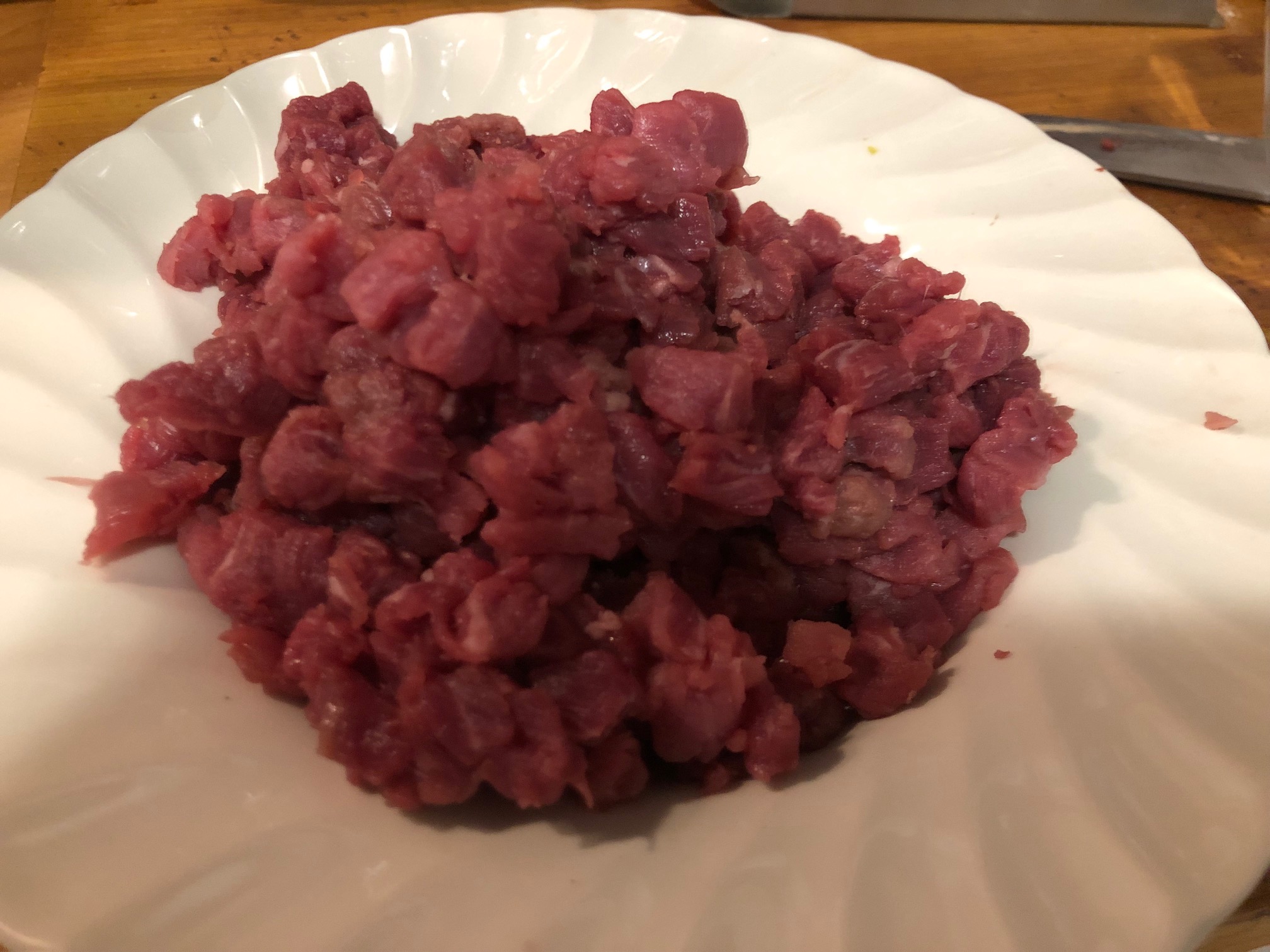 Con mucha paciencia y destreza cortamos el solomillo en trozos pequeños, necesitamos un buen cuchillo. Hay que hacerlo a mano ya que si lo picamos en máquina romperemos las membranas de la carne y perderá toda su intensidad. (Retiramos los nervios, la grasa y las partes blancas)