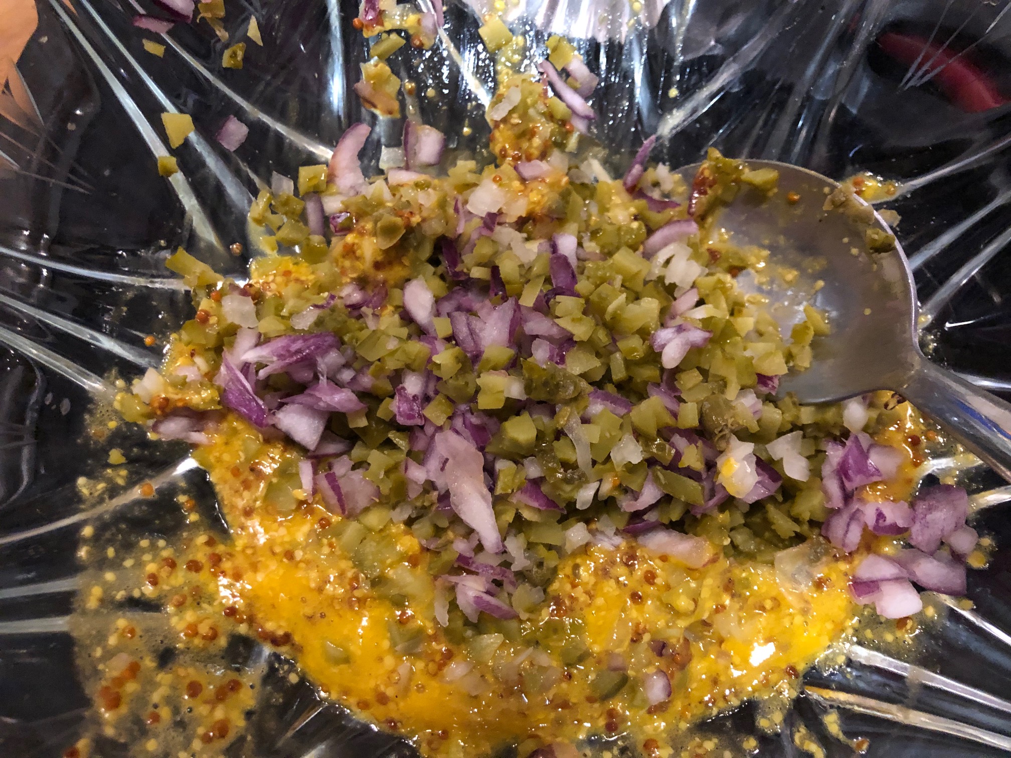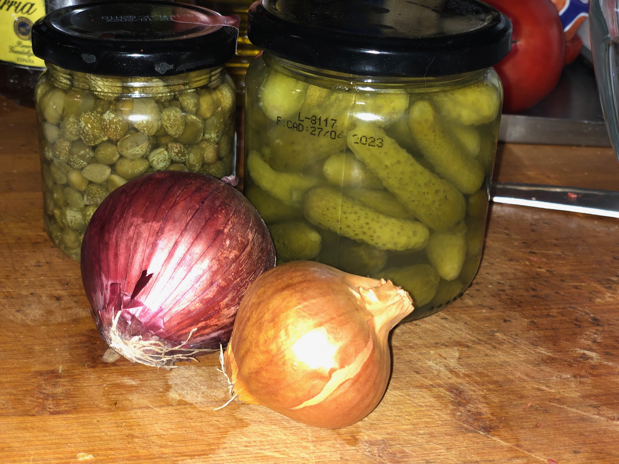 Picamos la cebolla, lo pepinos y las alcaparras y añadimos a la salsa