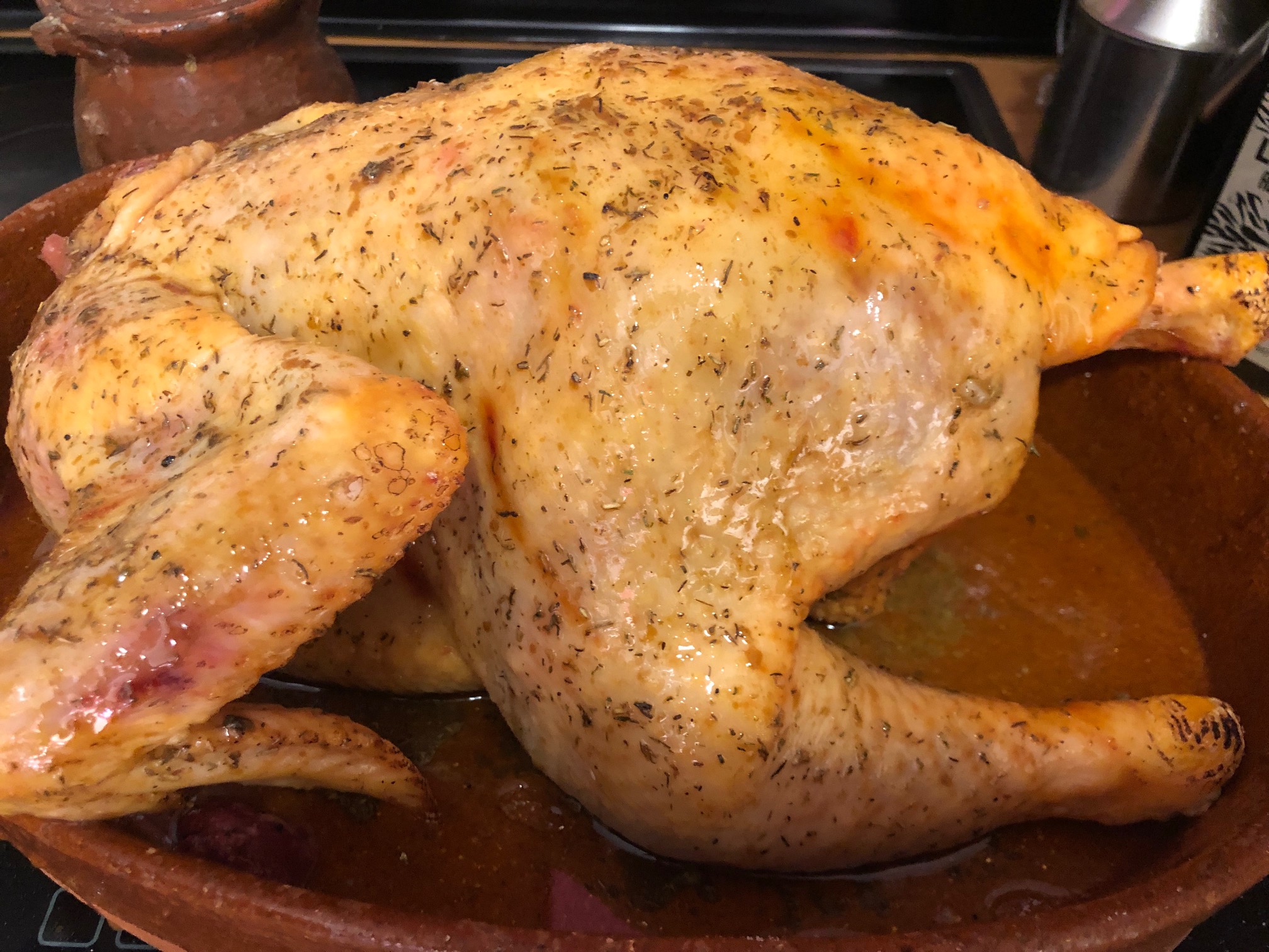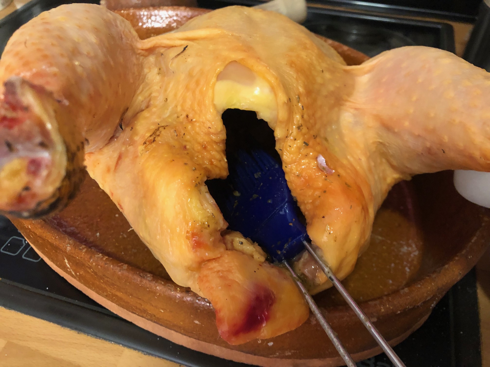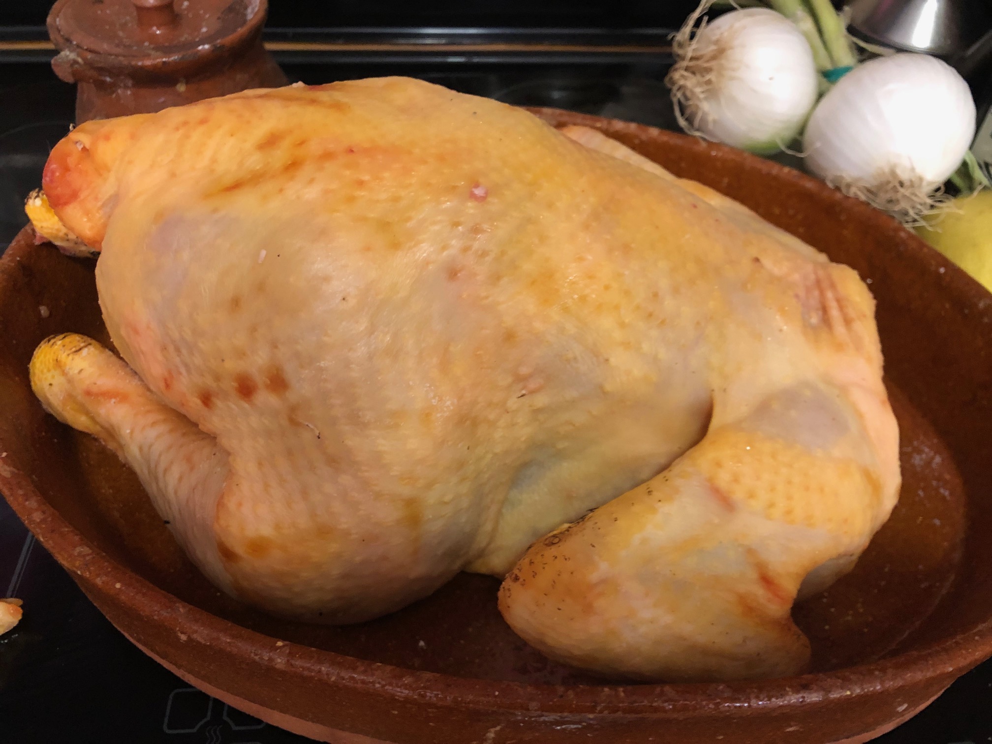 Colocamos en una bandeja de barro con un chorro de aceite de oliva el pollo de corral