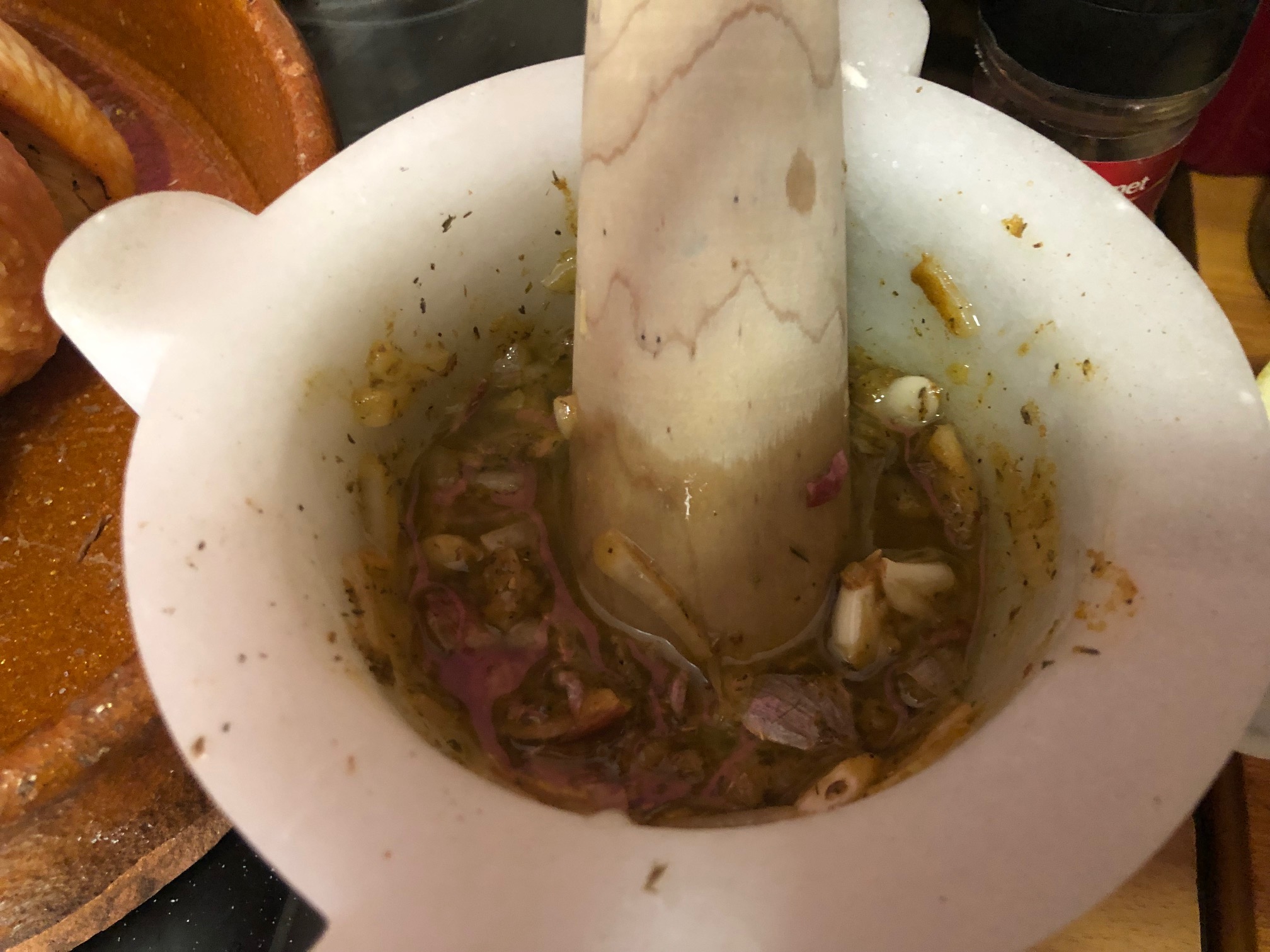 En el mortero añadimos sal y pimienta, los dientes de ajo, cebolleta picada y las especias
