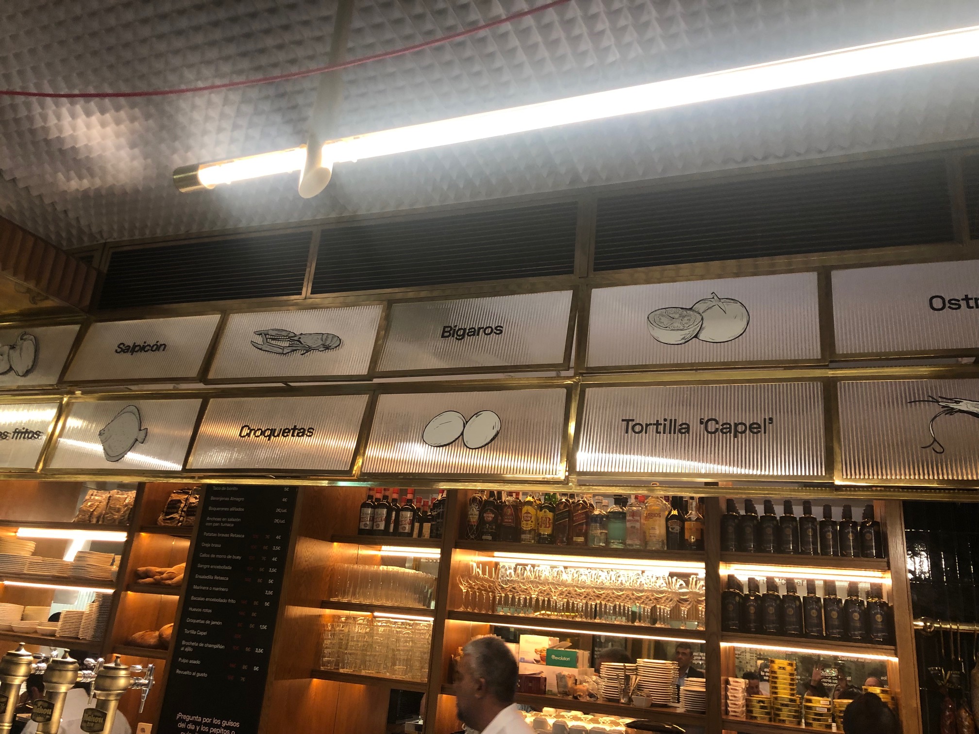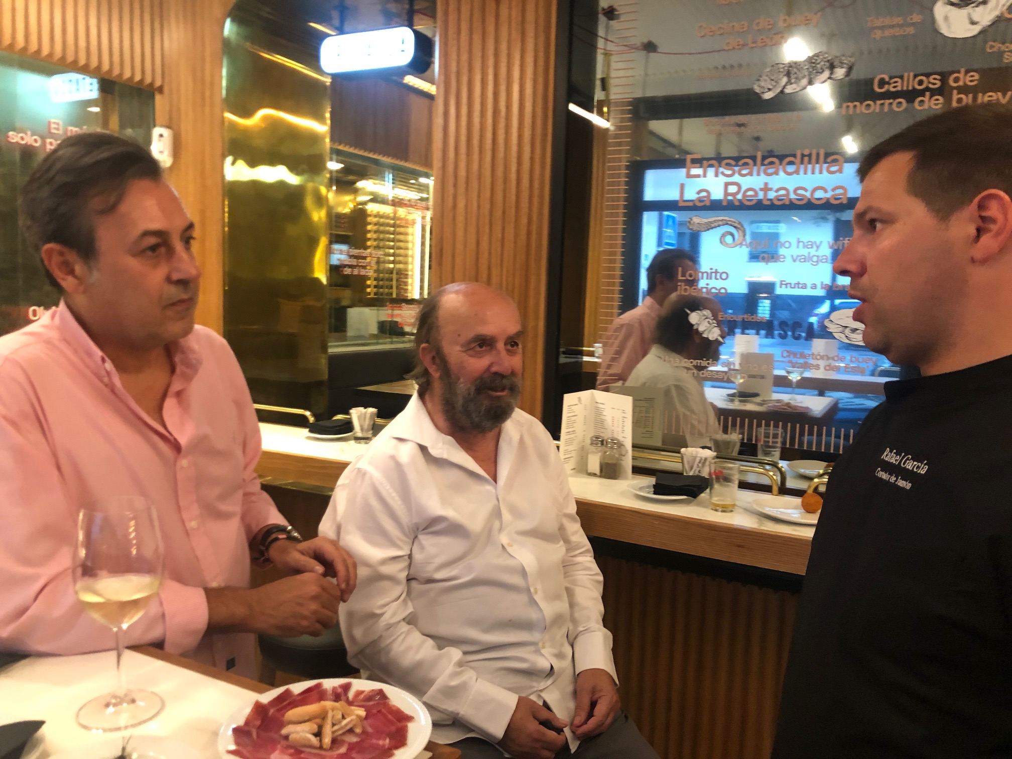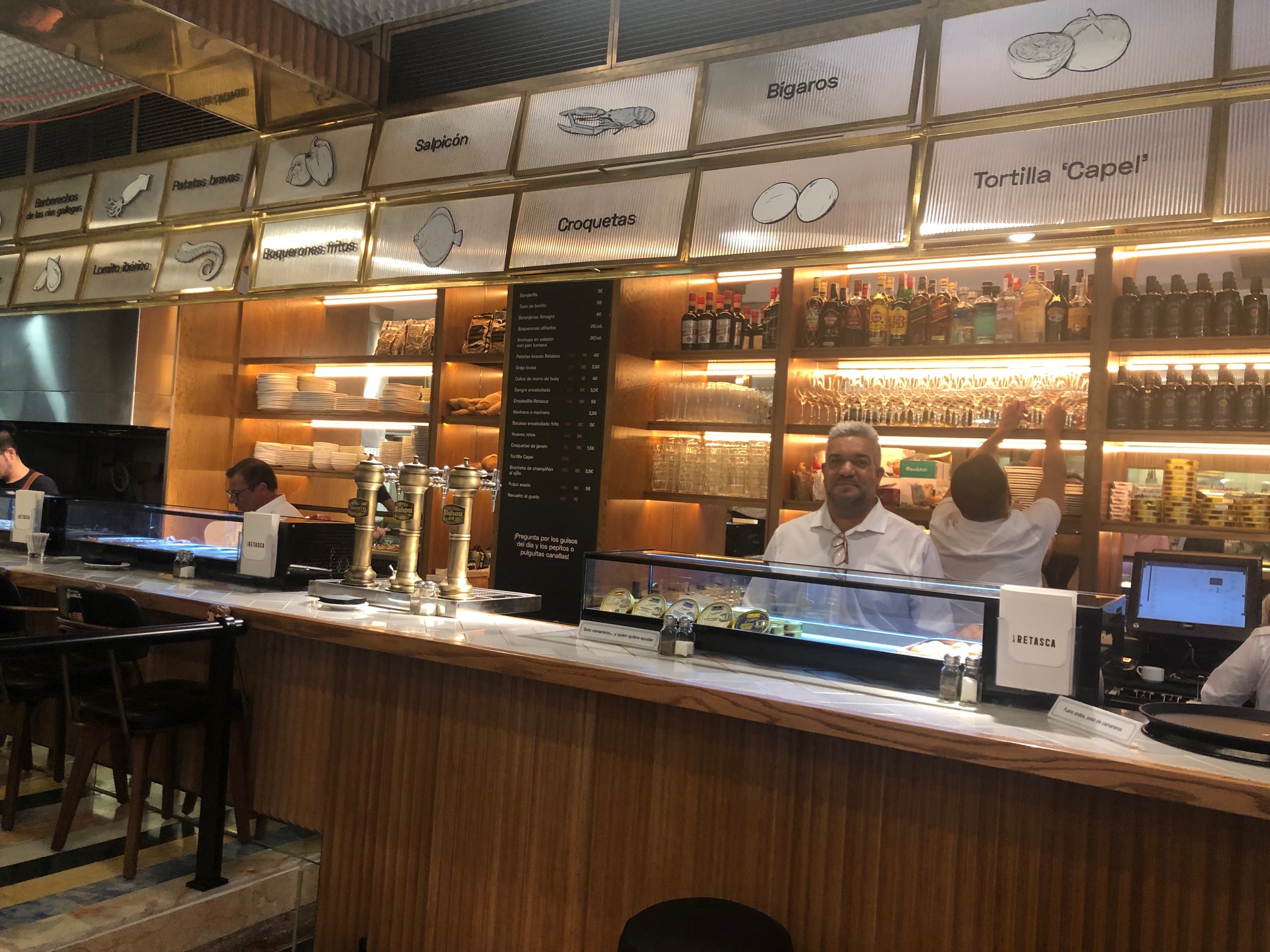 La Retasca evoca la mejor versión de las antiguas tascas capitalinas. Lo veréis en la decoración, lo escuchareis en los camareros que “cantan” los platos y pronuncian ese mítico reclamo de “al fondo hay sitio” que tanto tiempo hacia que no oía. Todo en La Retasca te retrotrae a ese pasado glorioso de las viejas tabernas que llegó a conformar hasta la propia idiosincrasia de los habitantes de la Villa y Corte. La obsesión por el producto y el talento de Juanjo a la hora de interpretarlo se traducen en sencillas tapas y raciones, en guisos del día, también en platos como el chuletón o los codiciados rodaballos y lenguados.