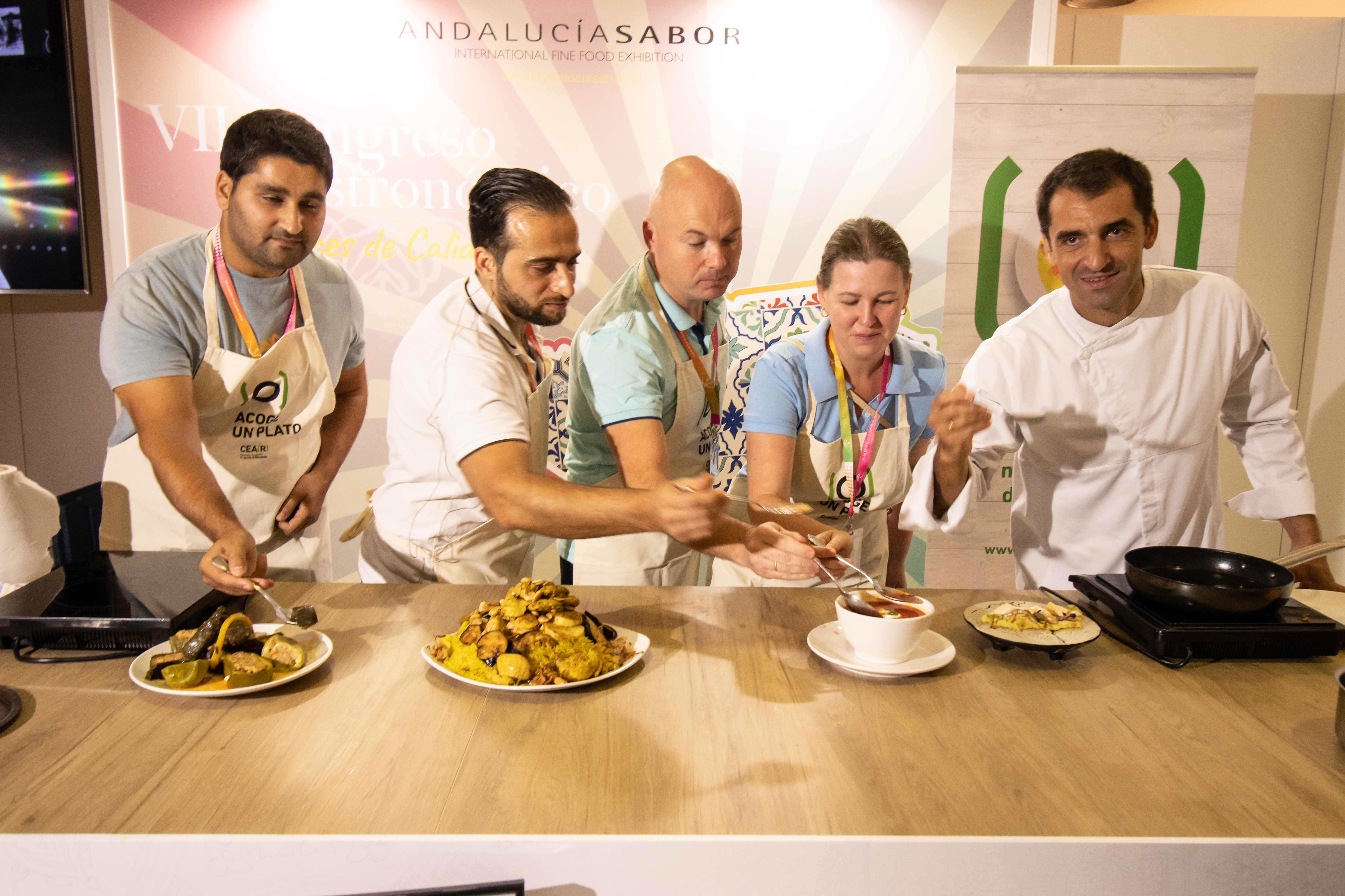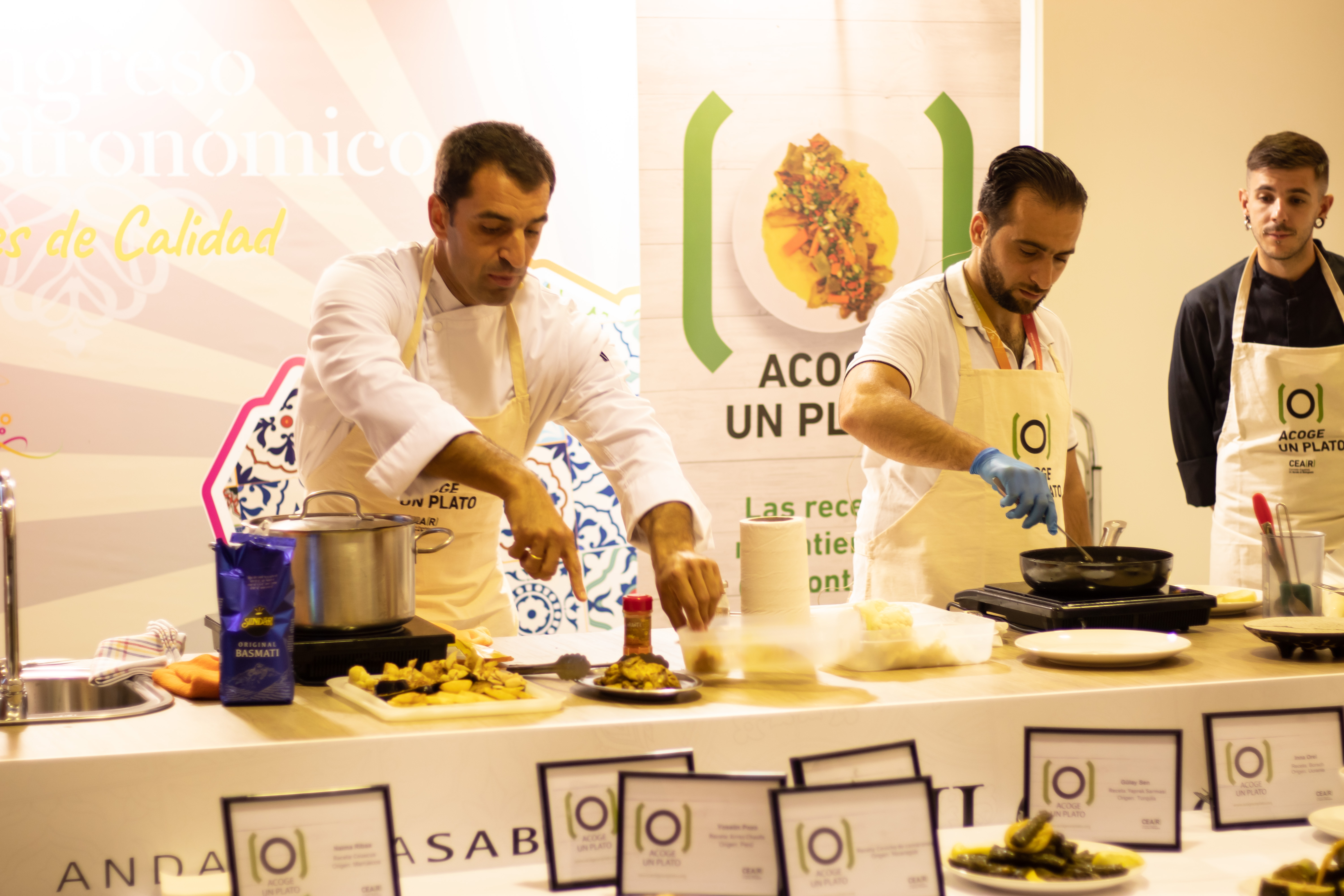 La Comisión Española de Ayuda al Refugiado en Sevilla ha presentado la iniciativa solidaria #AcogeUnPlato, porque las recetas no entienden de fronteras, en Andalucía Sabor 2019. Esta mañana, en una de las citas más prestigiosas de la gastronomía en España, nueve personas refugiadas han recibido al chef Julio Fernández para cocinar una de las recetas y plasmar, a través de la cocina, la situación que viven miles de personas que se ven obligadas a abandonar su país huyendo de la guerra y de la persecución.