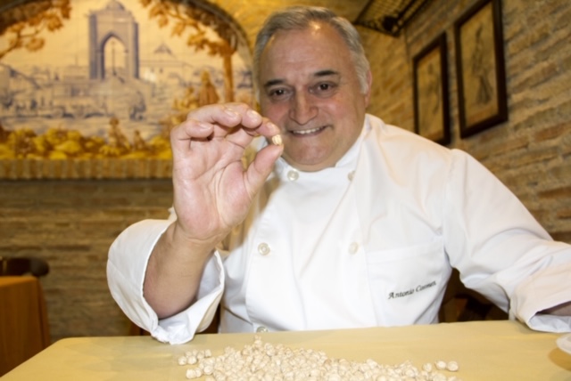 Los garbanzos son los protagonistas del plato estrella de Cruz Blanca de Vallecas: su galardonado cocido madrileño. Antonio Cosmen, fundador del restaurante, sigue manteniendo un alto grado de compromiso con sus proveedores, lo que le permite conservar en este material una distinguida y cuidada calidad.