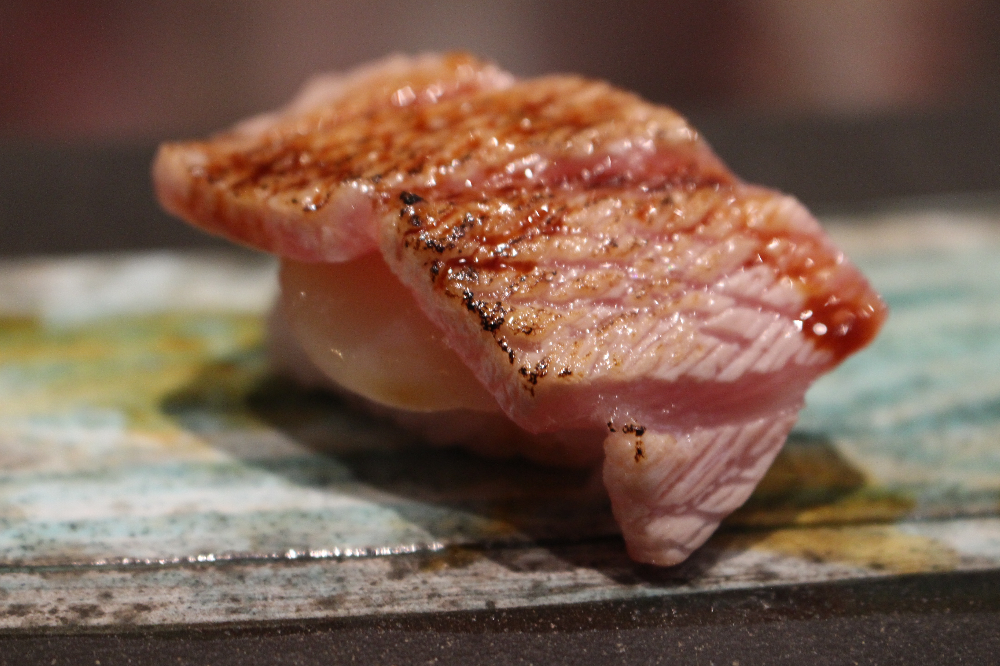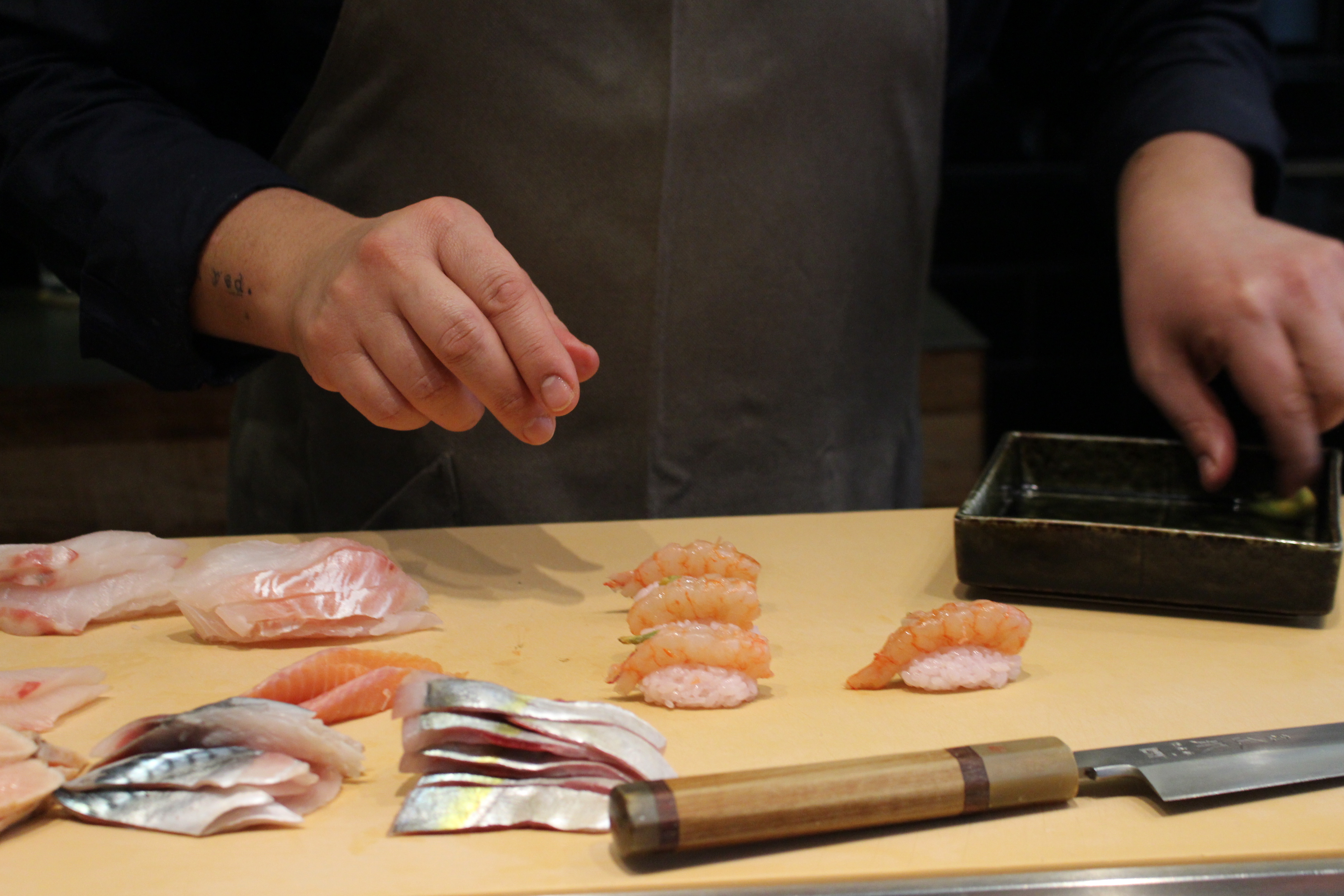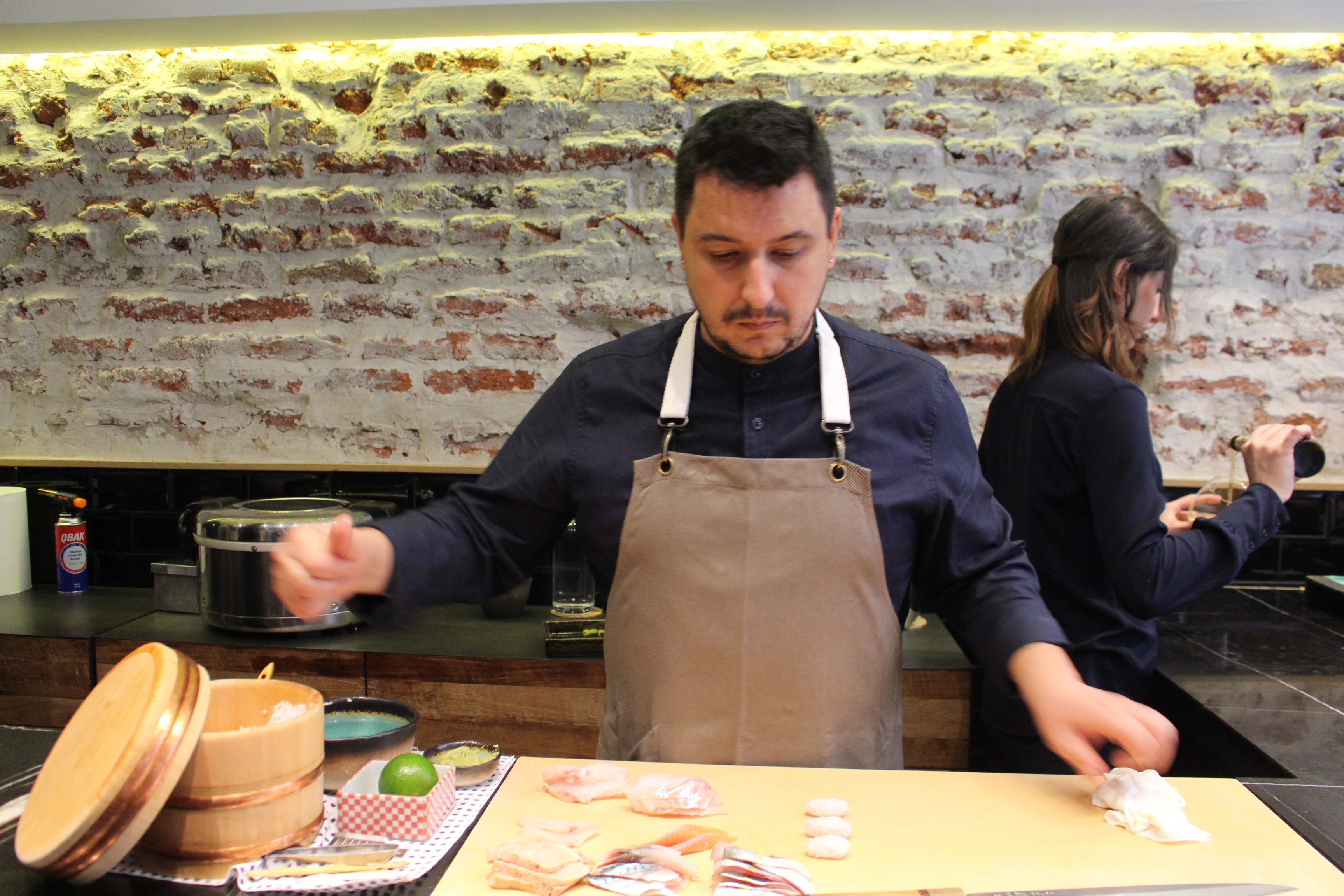 Ver la casi veintena de variedades de pescado, absolutamente fresco, que utiliza Mario; comprobar desde la barra y como si fuera un prestidigitador como de sus manos sale construido ya el arroz soporte de sus deliciosos nigiris o verificar la limpieza y pulcritud de los cortes que practica, es ya de por sí una experiencia sensorial que se antepone al placer gustativo.