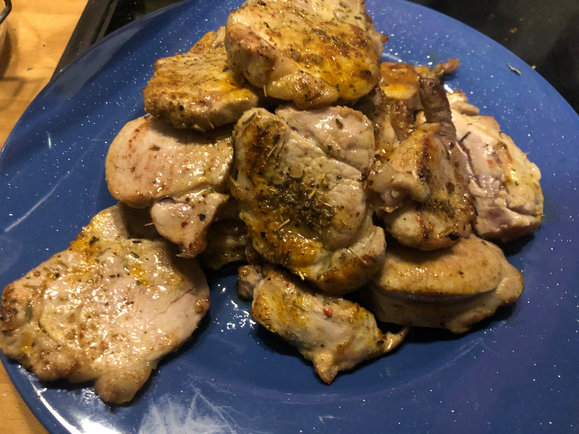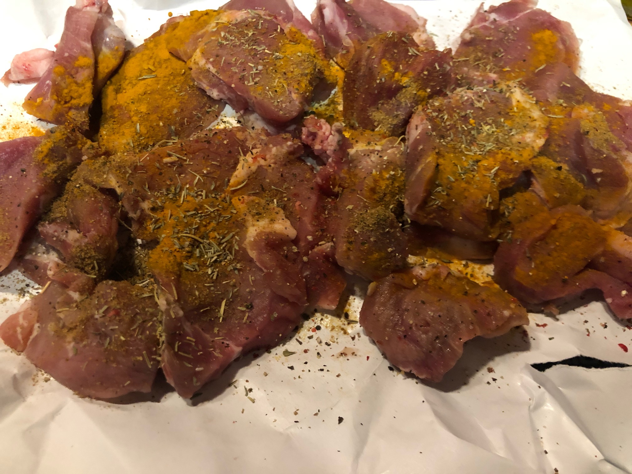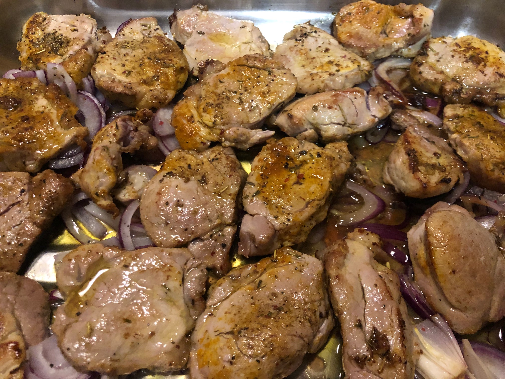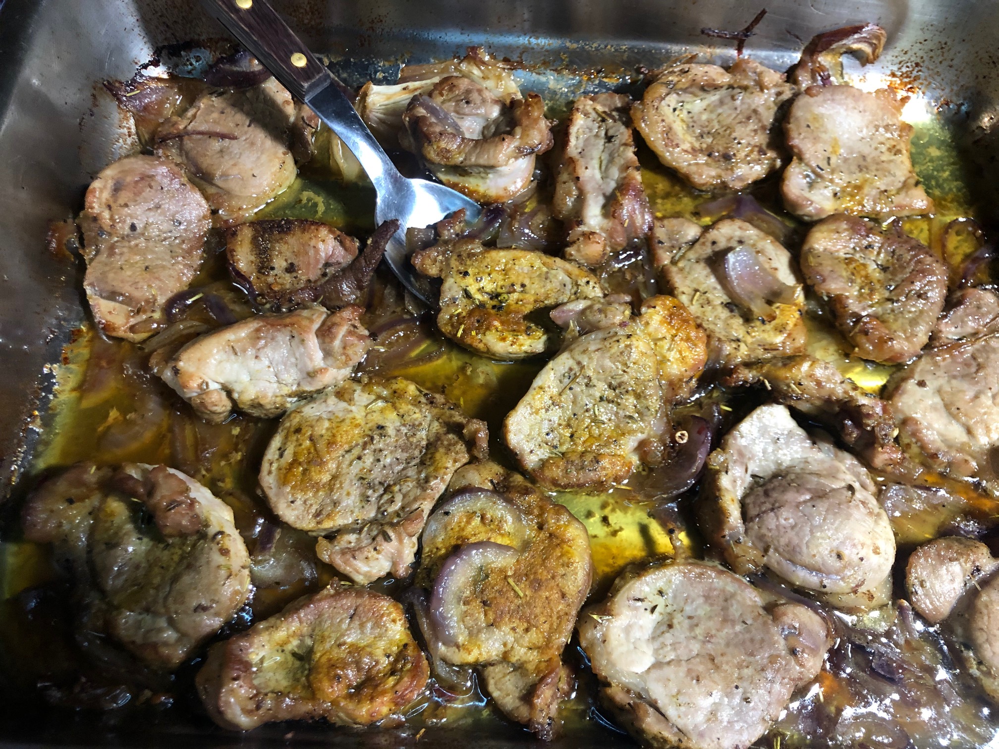 Son unos medallones de solomillo que he especiado con romero, tomillo, cúrcuma y pimentón, les he dado un toque al aroma de brandy y los aso sobre una cama de cebolla roja.