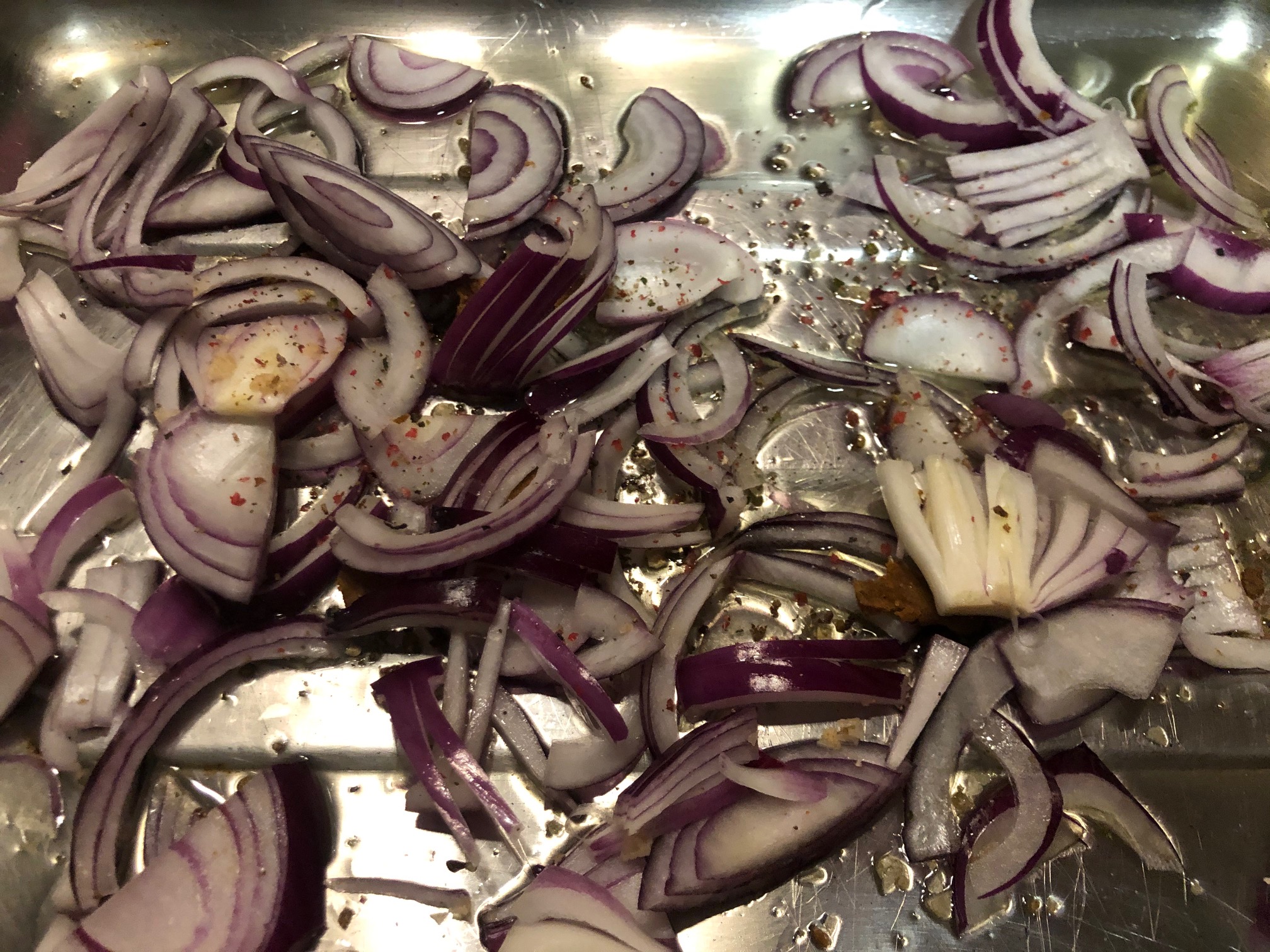 En una bandeja con un poco de aceite de oliva, hacemos una cama de cebolla morada, salpimentamos y la introducimos en el horno 5 minutos a 180 grados