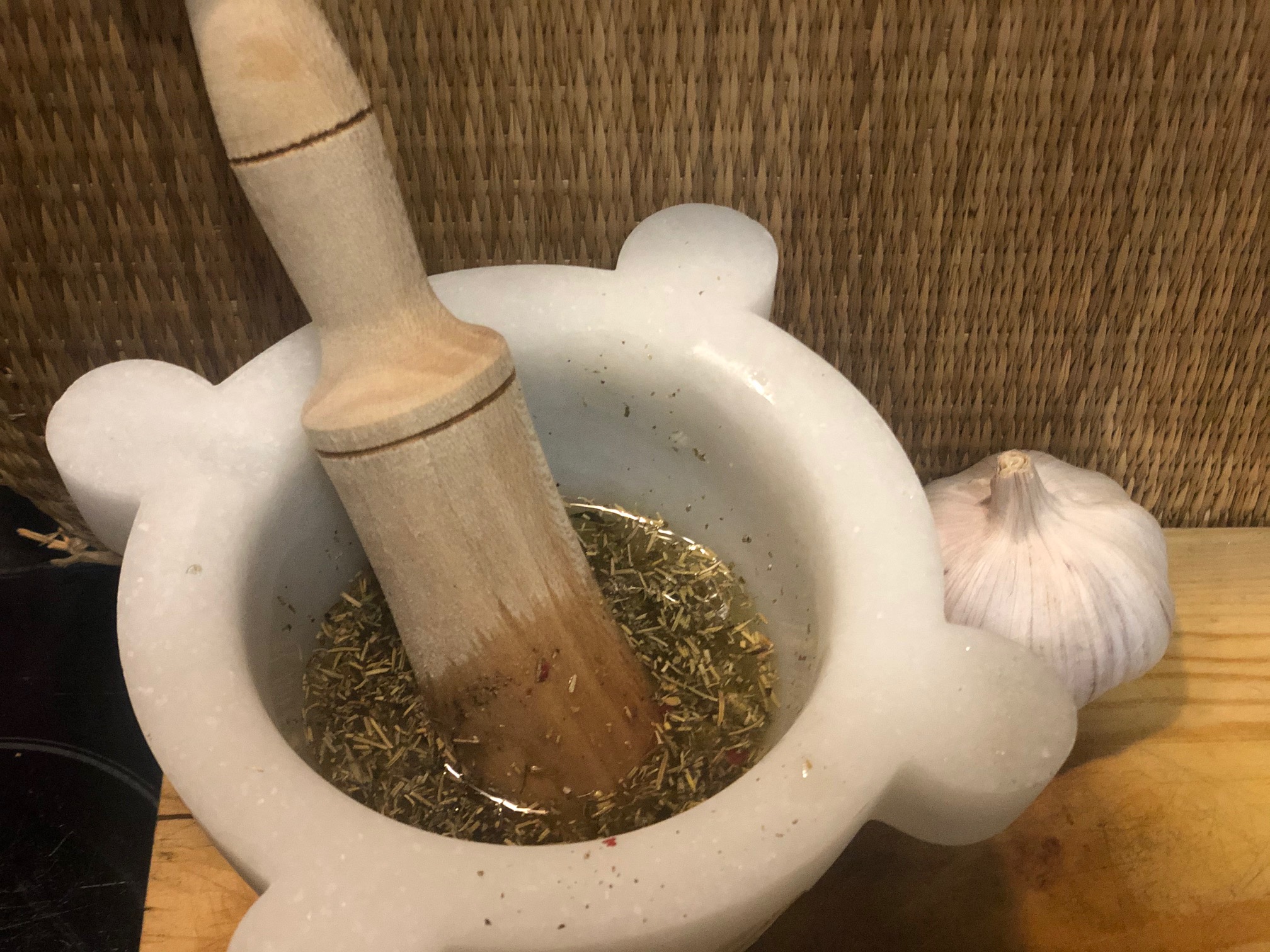 En el mortero hacemos un majado con los dientes de ajo, las hierbas provenzales, el orégano, sal, pimienta negra y el aceite de oliva