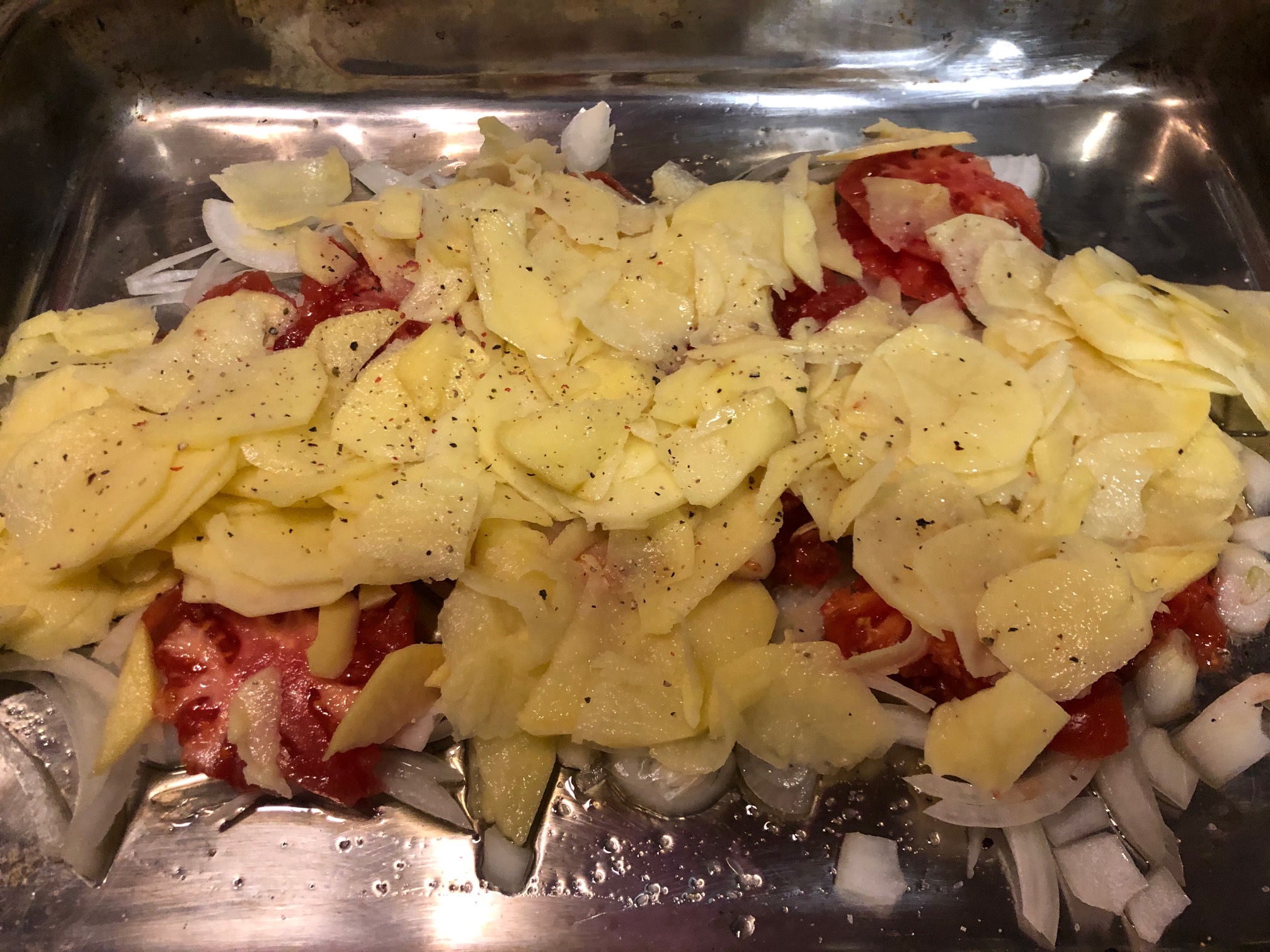 En una bandeja añadimos un chorro de aceite de oliva y hacemos una cama con la cebolla, los tomates pelados y las patatas