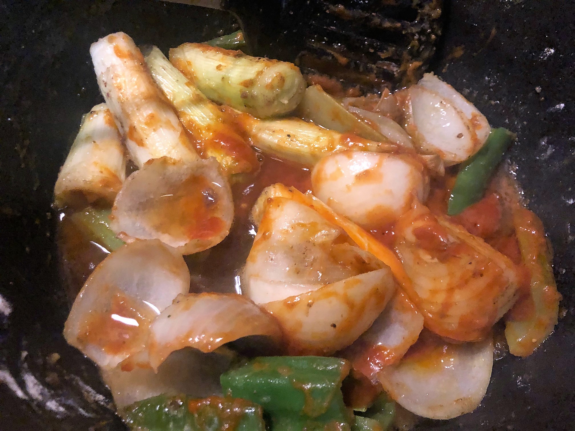 En ese mismo aceite pochamos las verduras cortadas en trozos grandes