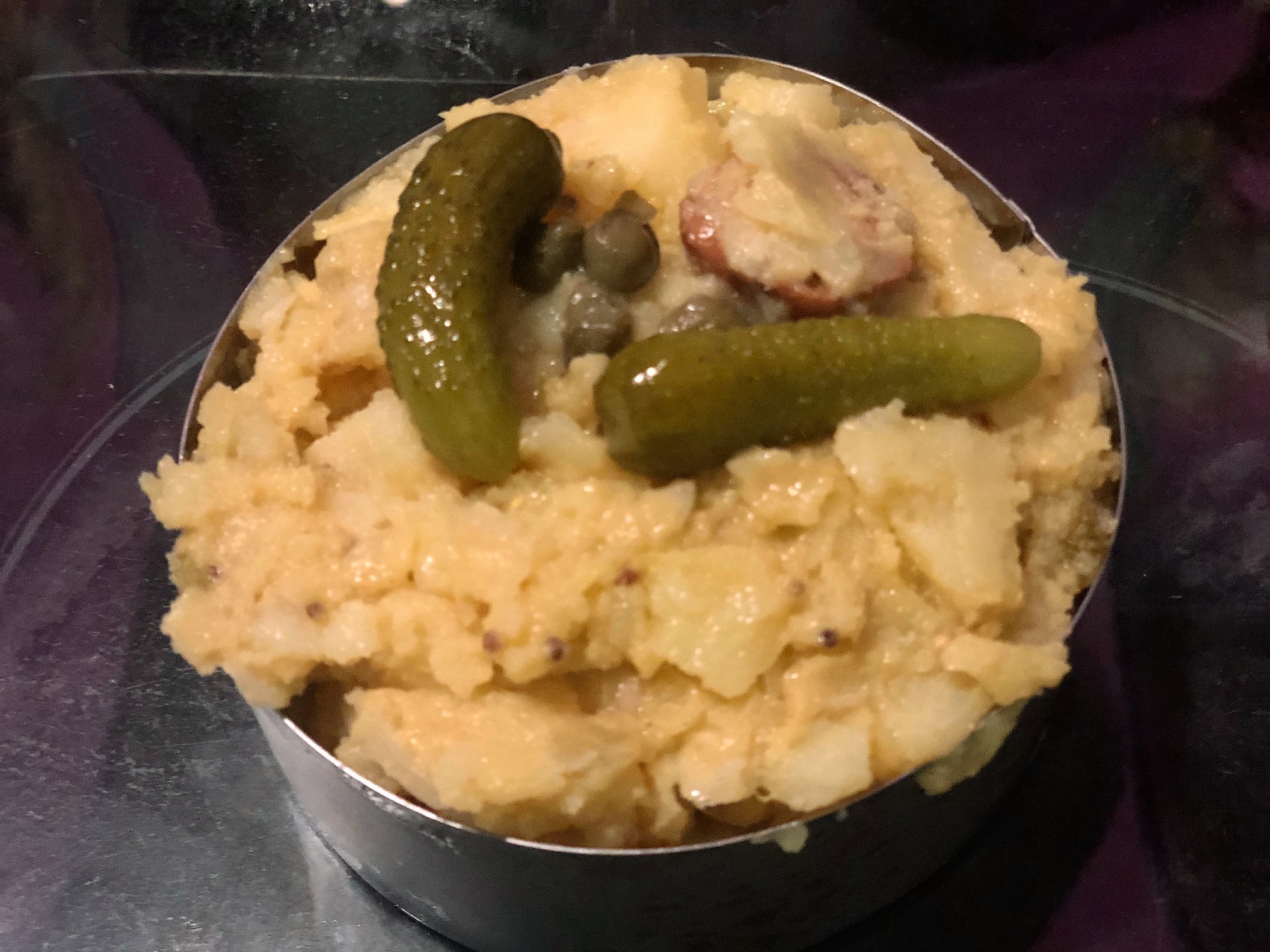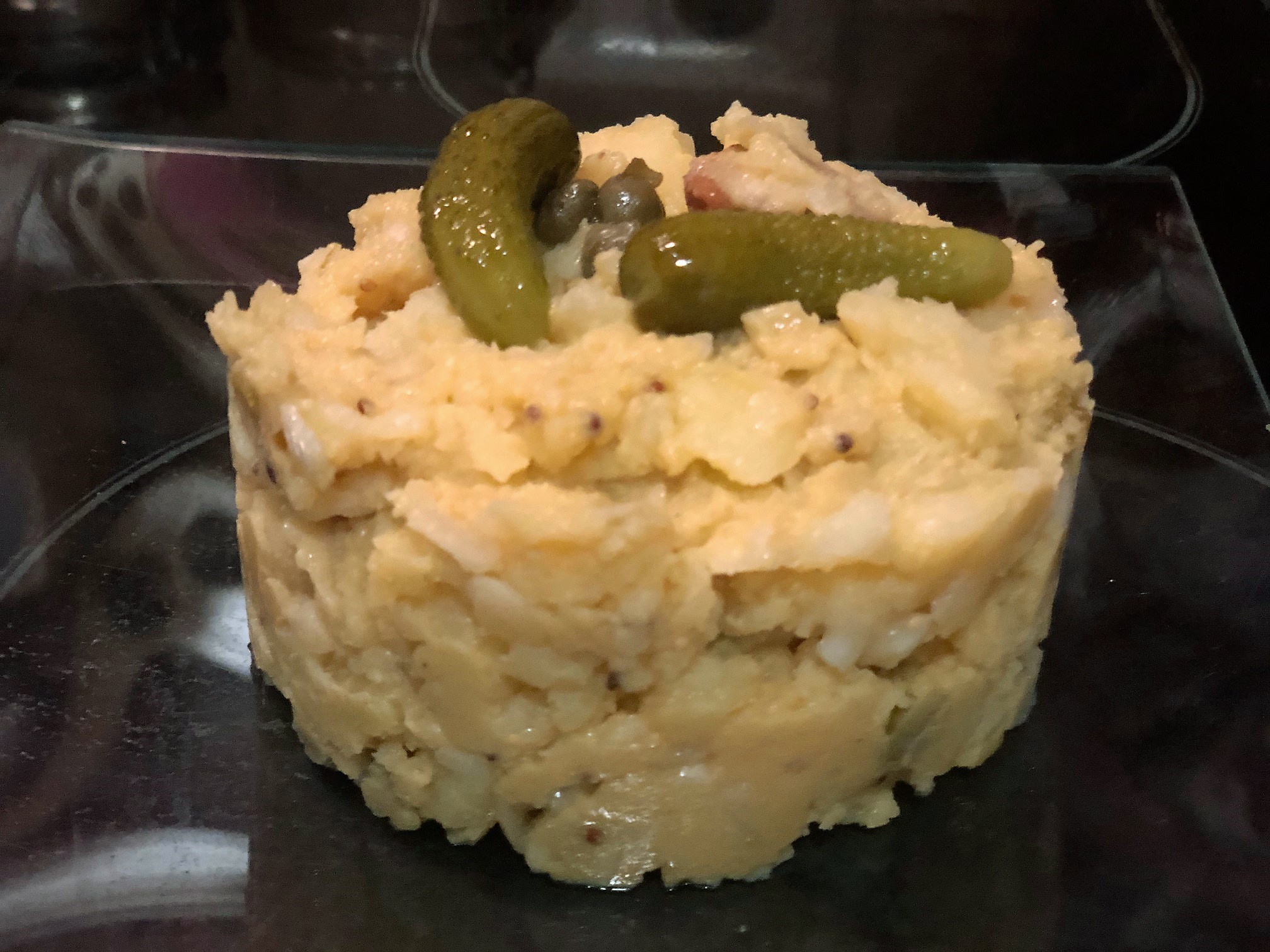 La he puesto en un aro para emplatar y la decoro con unos pepinillos y alcaparras