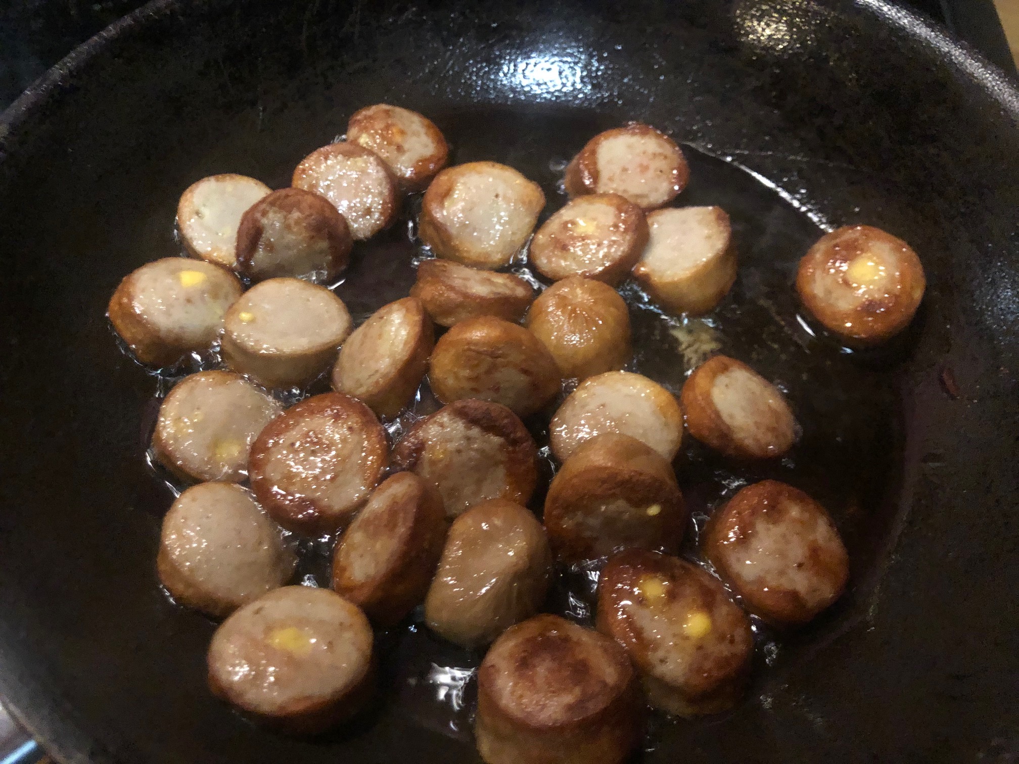 Doramos las salchichas en una sartén (estás iban rellenas de queso, pero podéis elegir la que más os guste)
