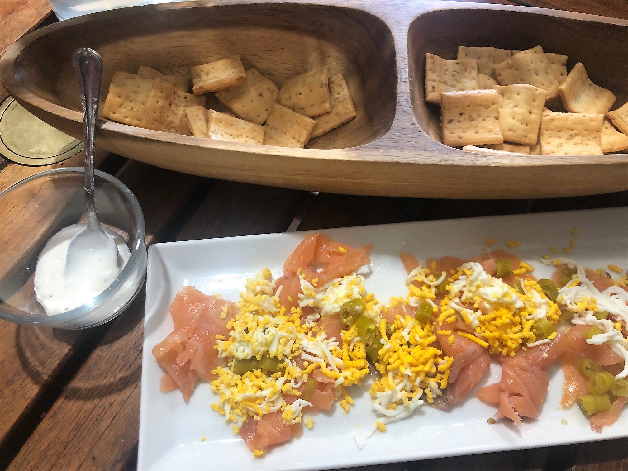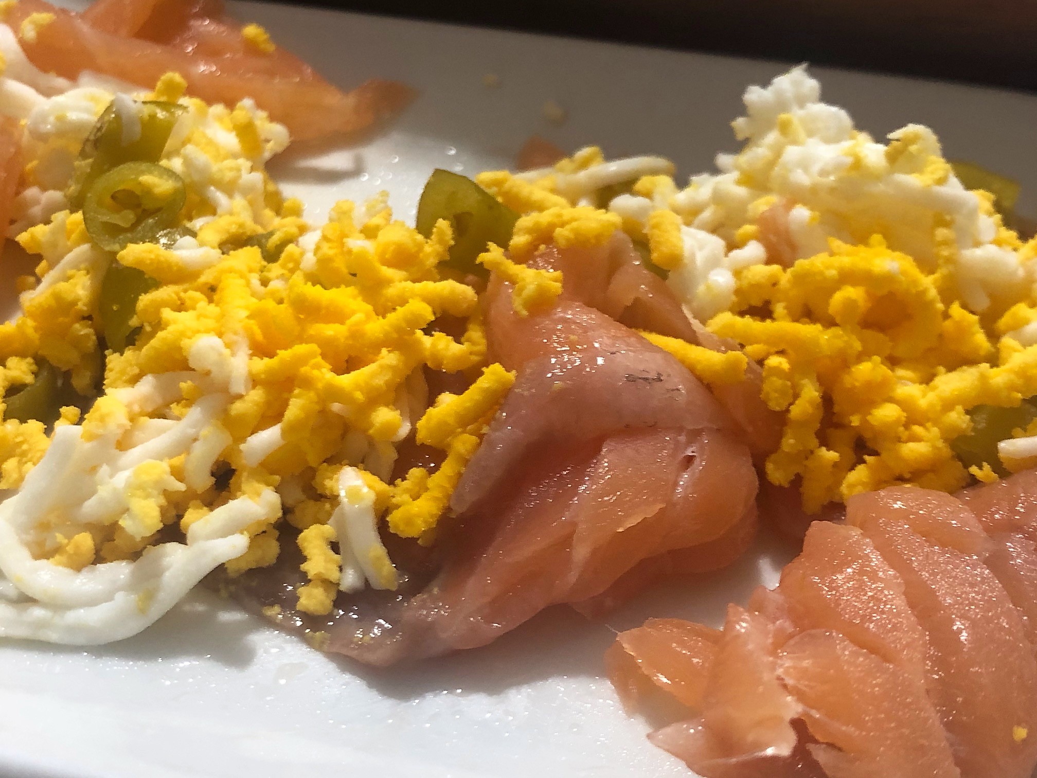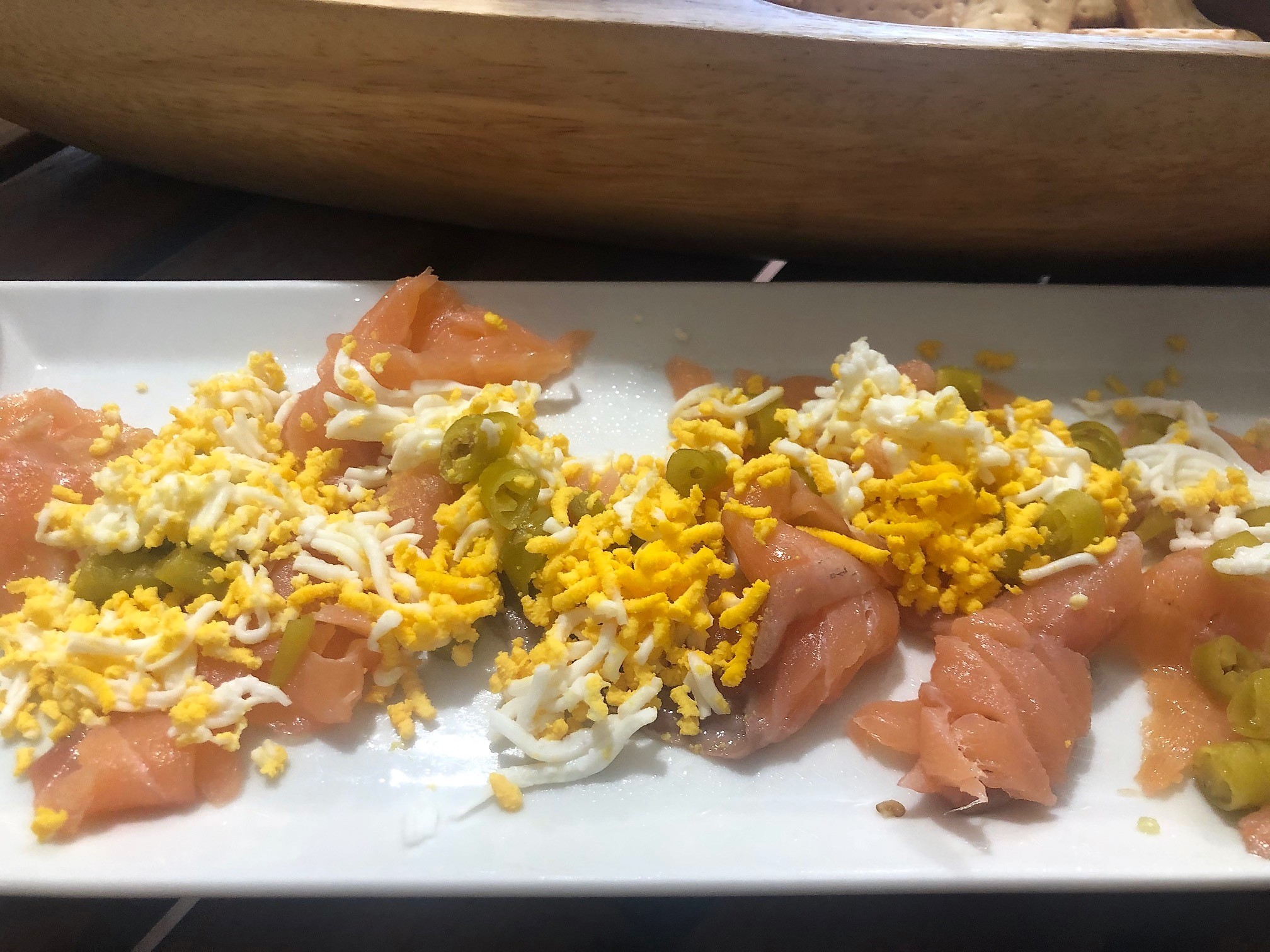Hemos preparado un aperitivo muy sencillo que nos ha encantado. Un salmón ahumado con huevo duro picado, piparras a la vinagreta y una crema de nata ácida.