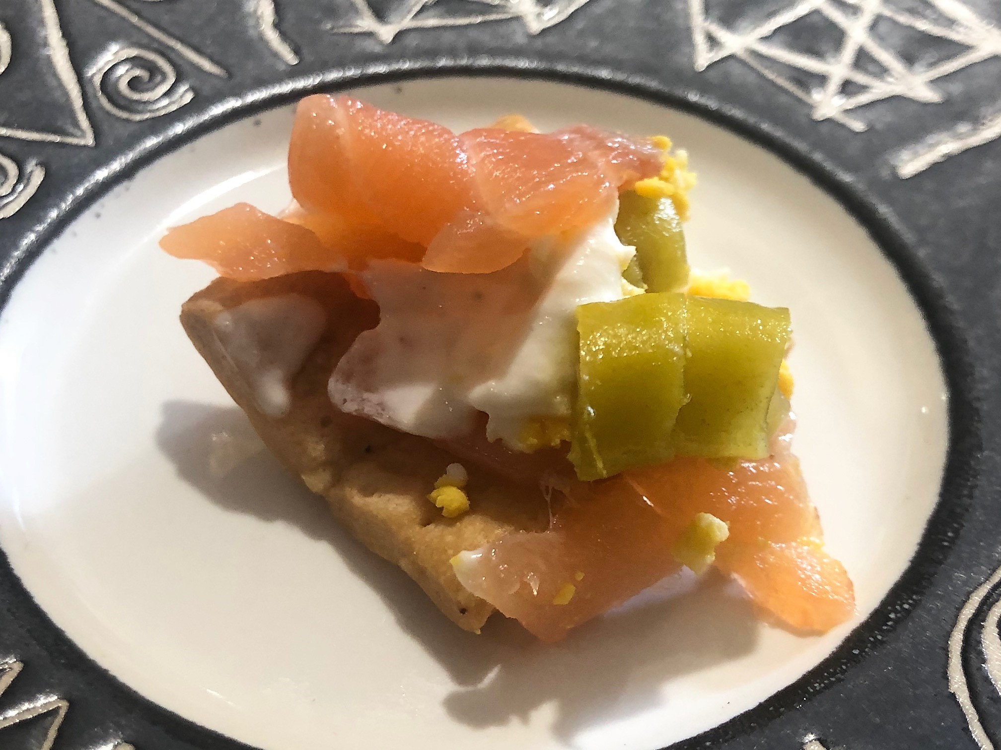 Para tomarlo en bocaditos pequeños, he puesto unas regañas, podéis hacerlo con tostadas de pan. Encima coloco el salmón, las piparras y una cucharadita de nata agria.