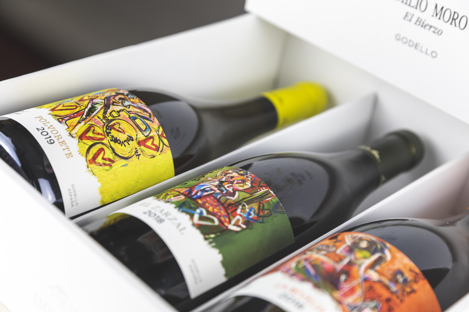 Coincidiendo con este hito para la bodega, el artista mallorquín Domingo Zapata, de renombre internacional, se ha encargado de rediseñar las etiquetas de las tres referencias. Los tres Godello (Polvorete 2019, El Zarzal 2018 y La Revelía 2018) se pueden adquirir juntos, en un maletín de lujo de edición limitada, en la tienda online de Emilio Moro, a un precio de 41,95 €.