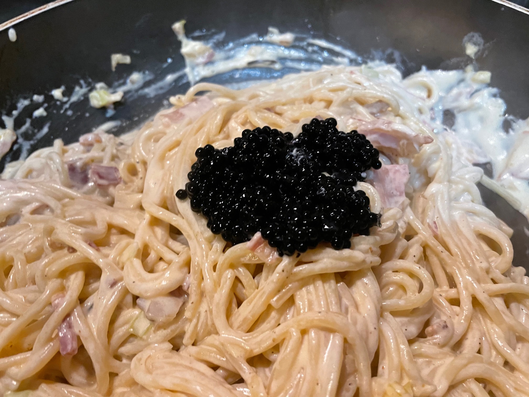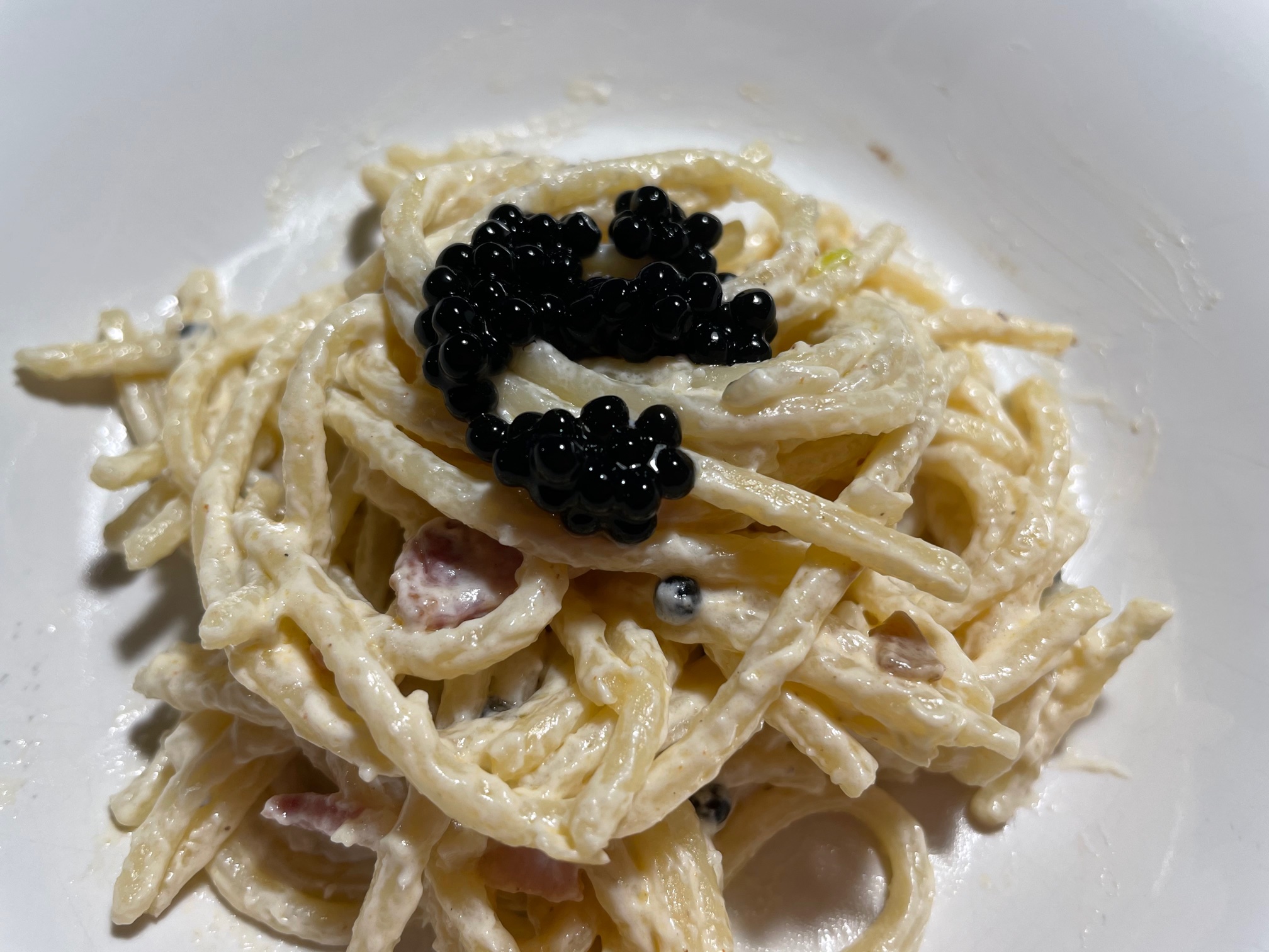 Espaguetis con panceta ahumada y sucedáneo de caviar