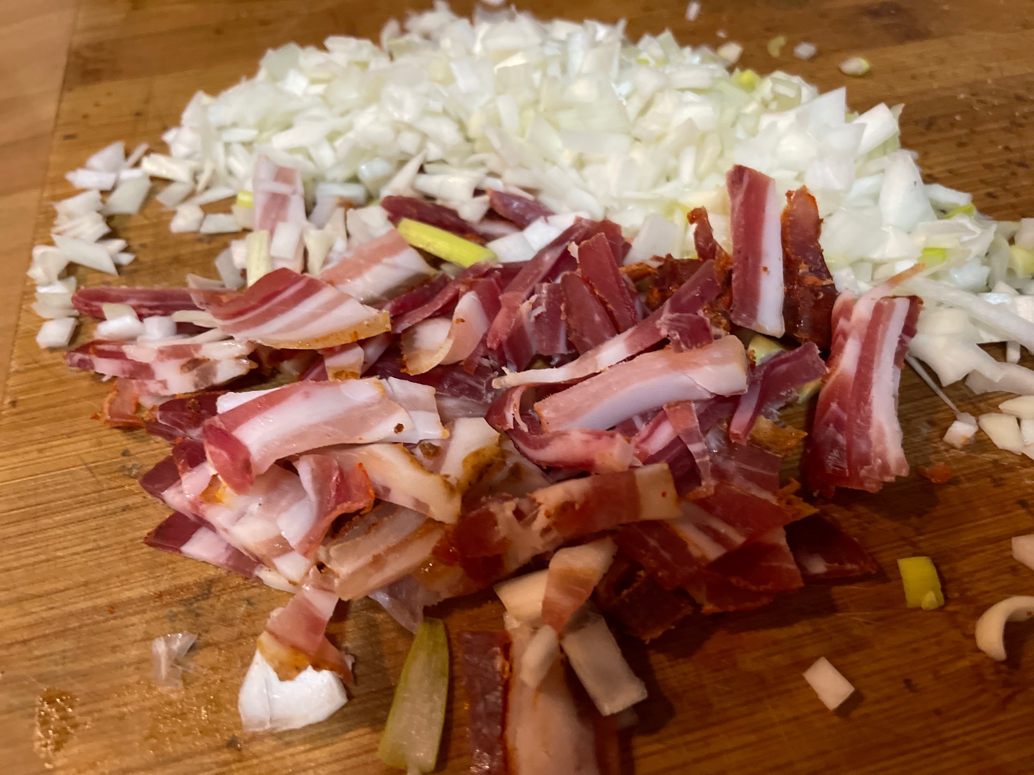 Picamos la cebolleta y la panceta ahumada y la pochamos en una sartén con un poco de aceite de oliva