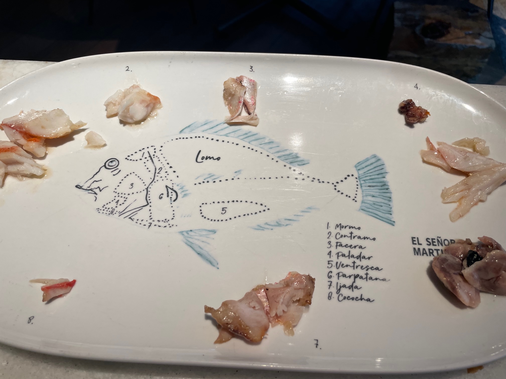 Tras este festival sensorial y gustativo, llegó lo fundamental, el fantástico Virrey elaborado a la brasa y perfecto en su punto. Ya os decía de la destreza del servicio de sala. Tras emplatar los lomos del pescado, desmenuzo la cabeza del pescado, dándonos a conocer el sinfín de posibilidades que tiene en una bandeja donde se detalla cada parte en forma de dibujo impreso en la cerámica.