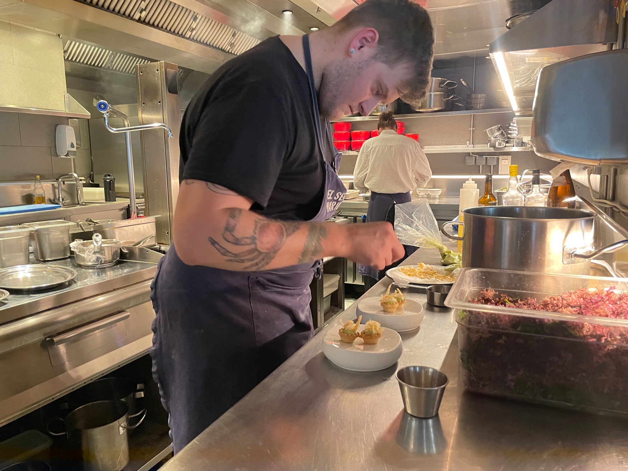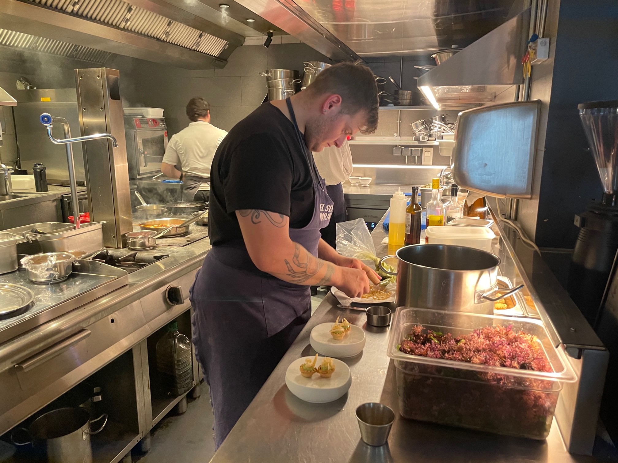 Un producto que tratan con enorme maestría en la cocina, potenciando al máximo el sabor. Quedé fascinado con los entrantes, un fantástico caldo de nécora, mejillones de Bretaña en salsa de tomate ligeramente picante, unos sublimes carabineros que se terminaban de hacer en el plato en sarmientes encendidas o unas tremendas cocochas con guisante lágrima.
