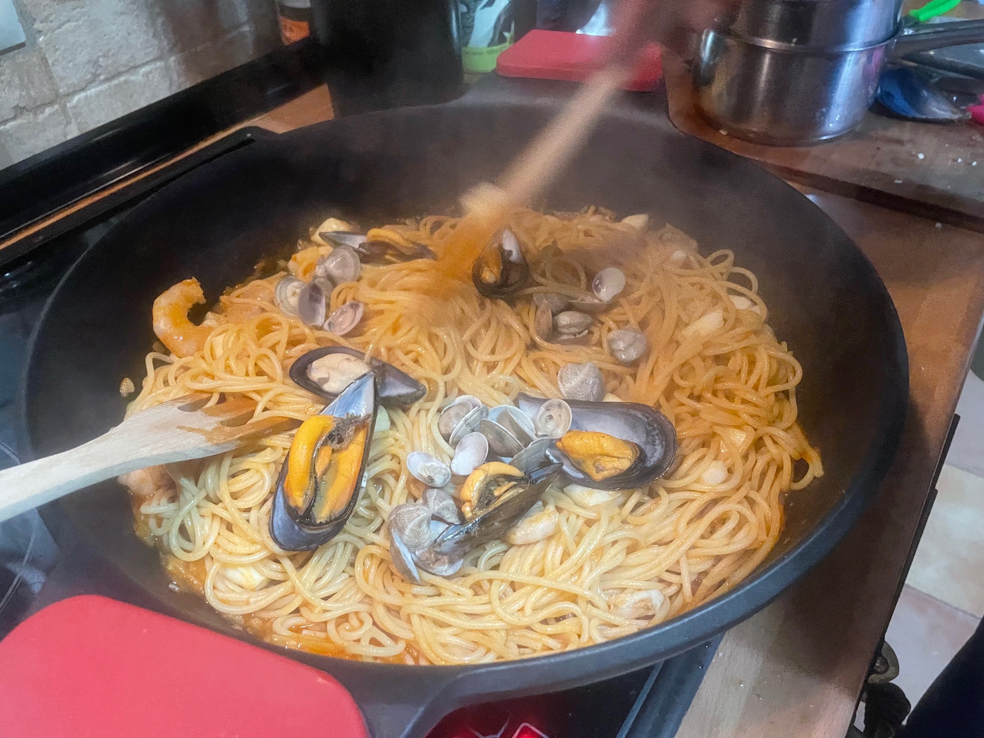 Añadimos los espaguetis a la salsa e incorporamos los mejillones, las chirlas, las gambas, los calamares y langostinos