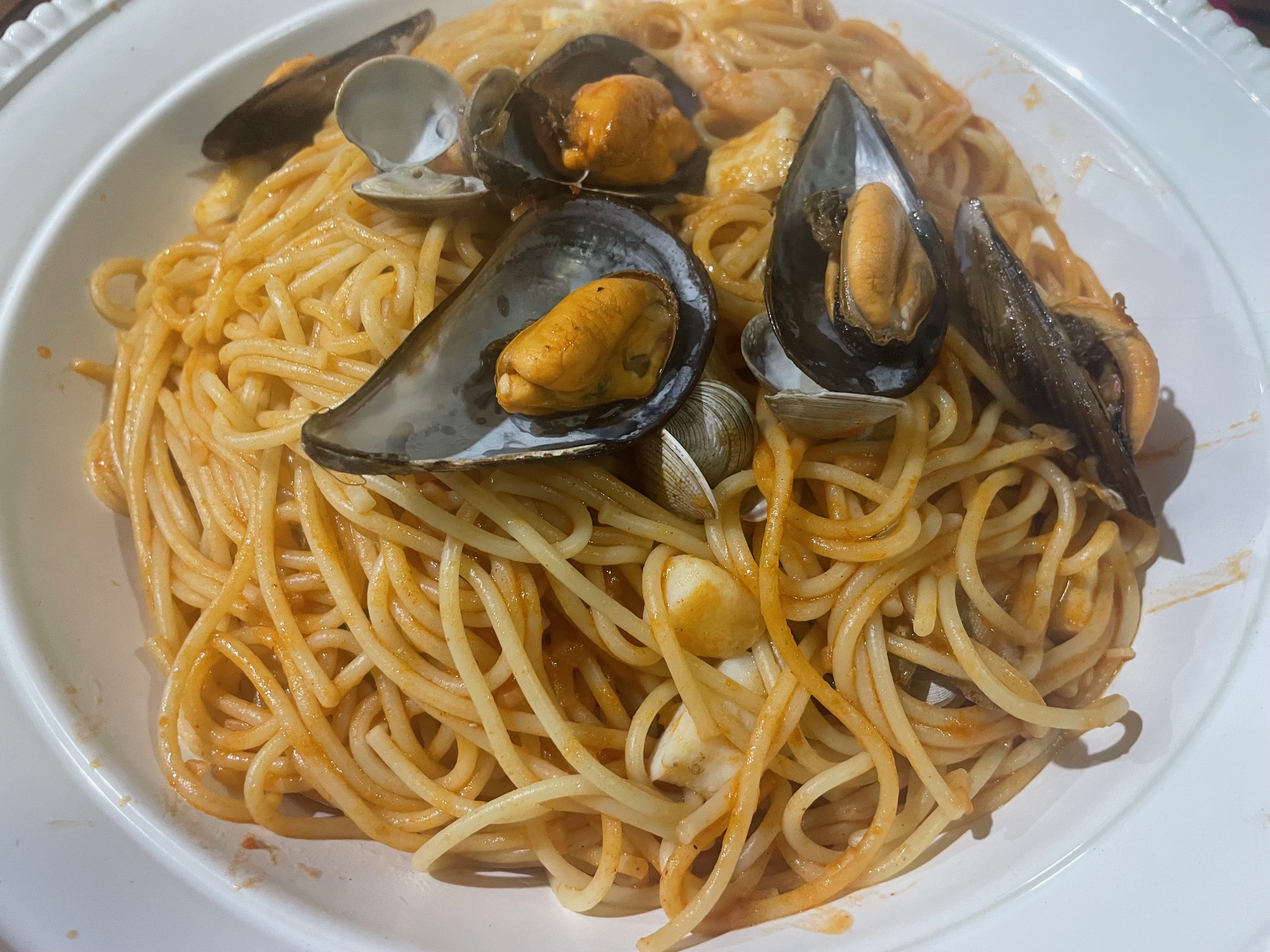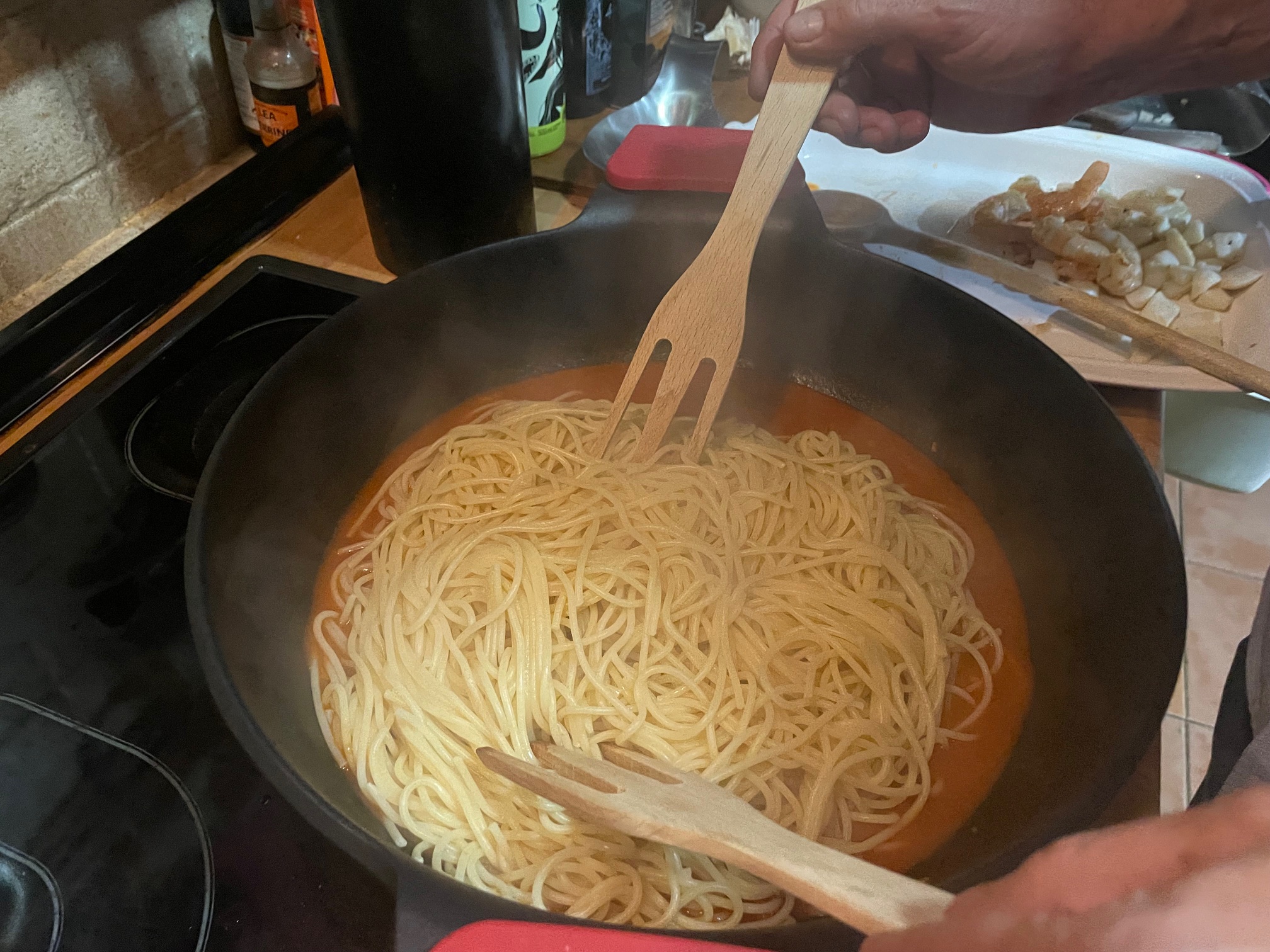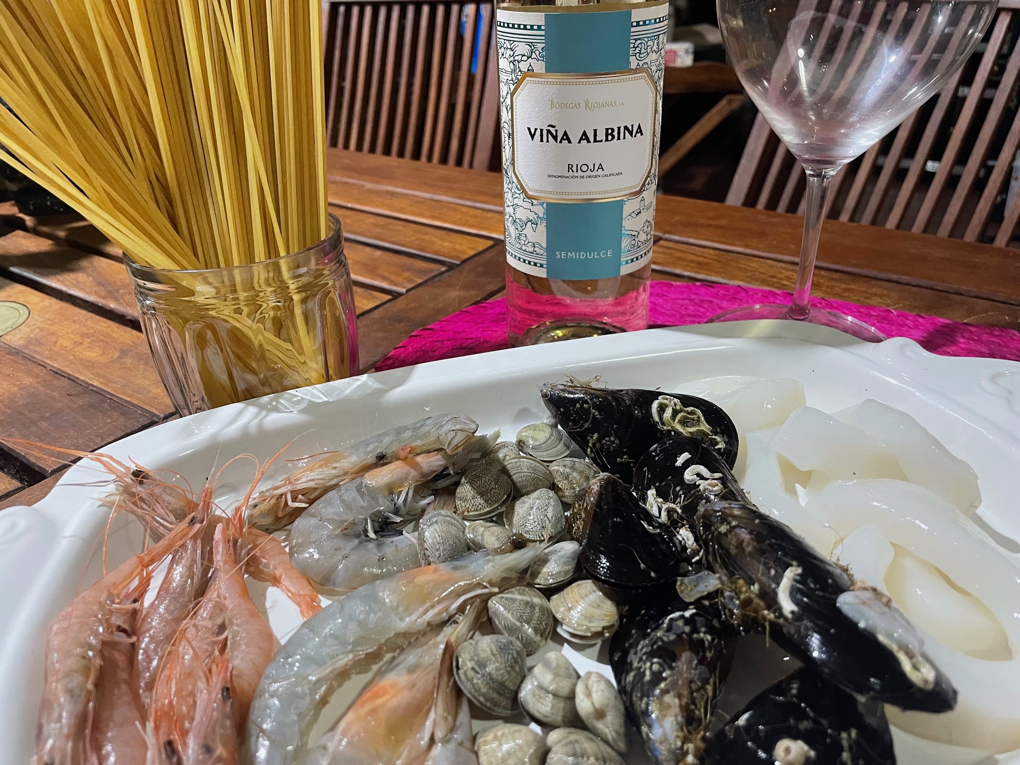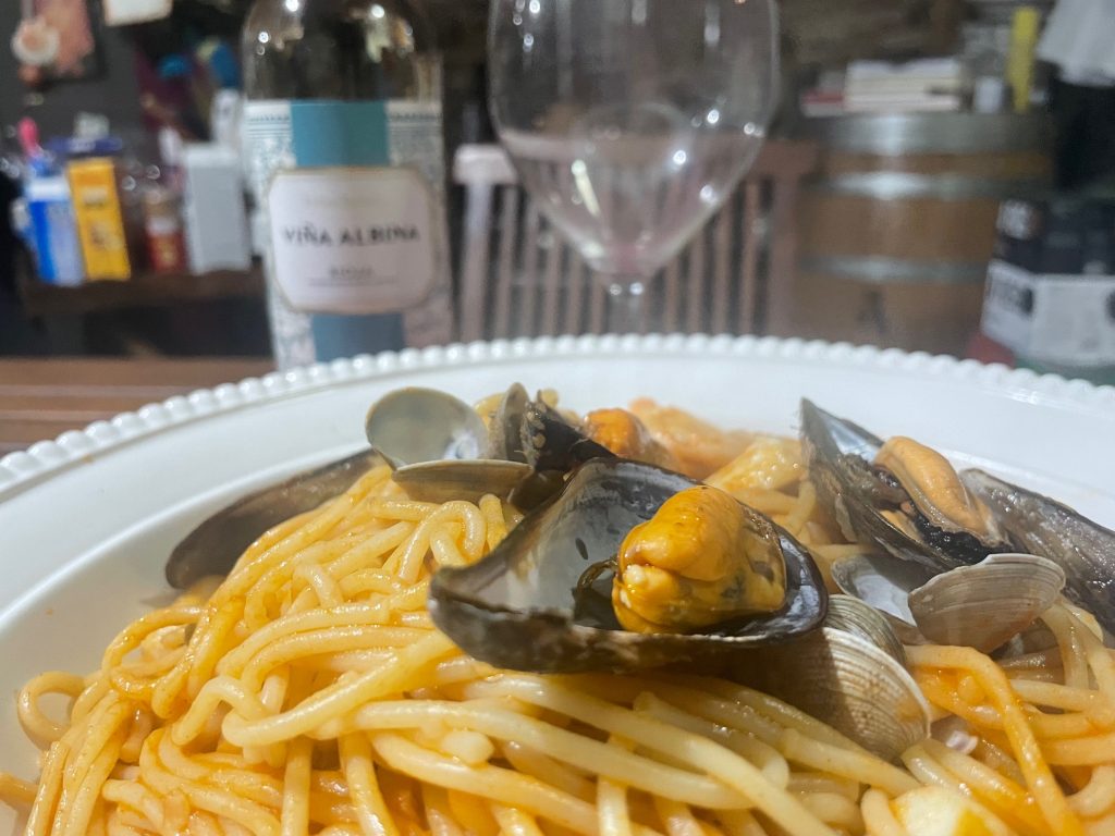 Espaguetis a mi marinera acompañados de un rioja semidulce