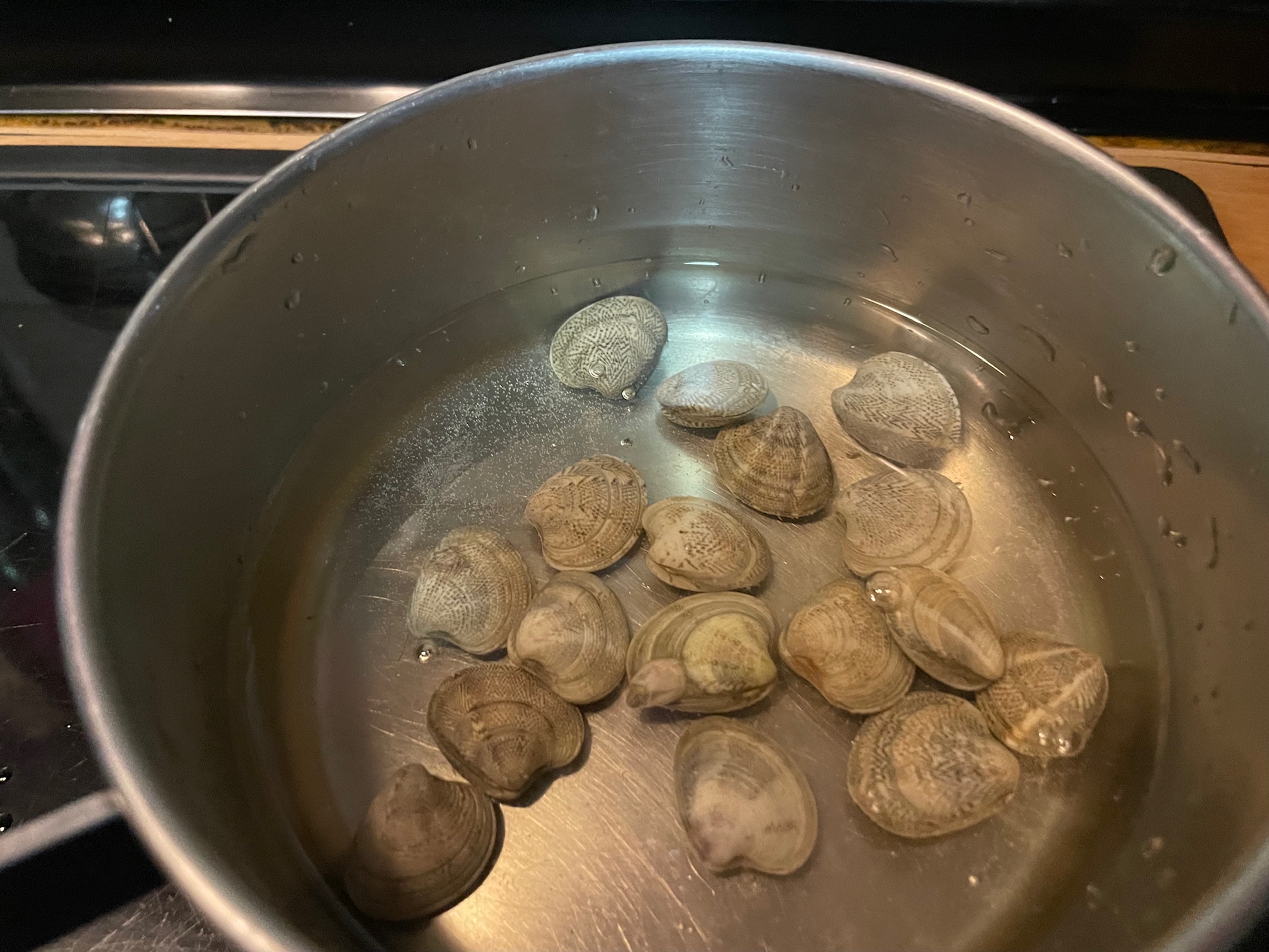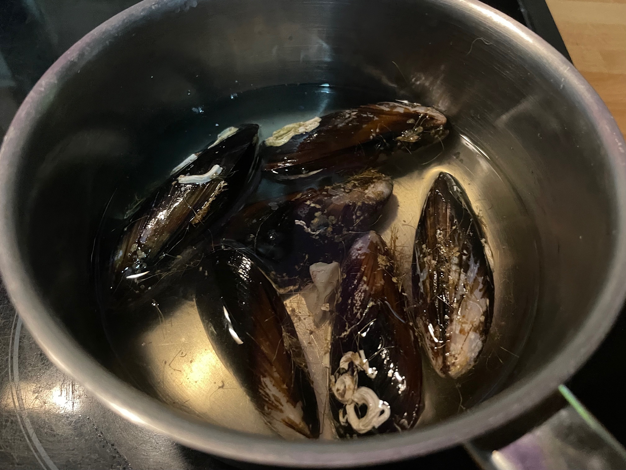 Cocemos los mejillones y las chirlas en vino blanco hasta que abran