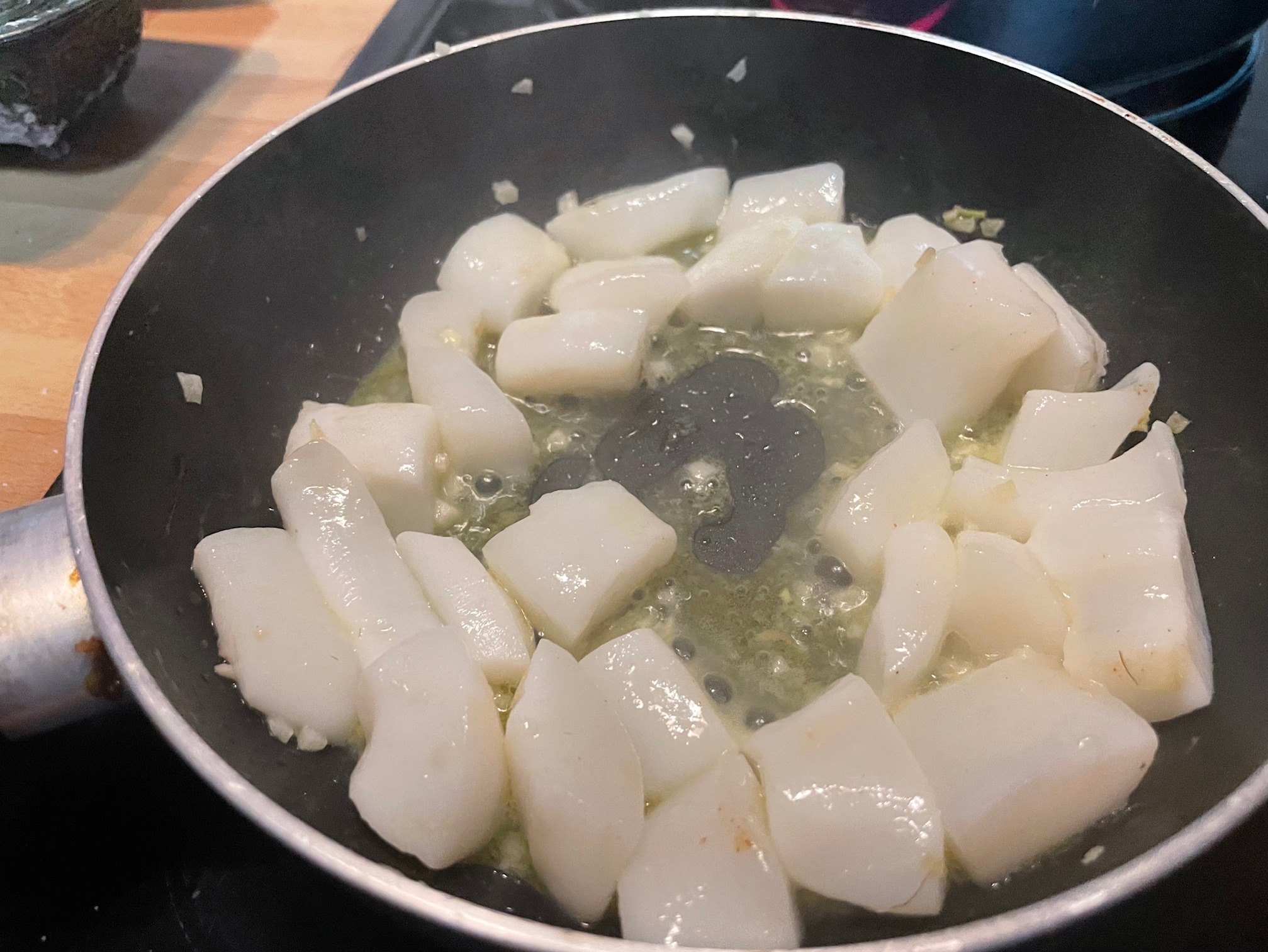 En una sartén con un diente de ajo picado hacemos las anillas de calamar