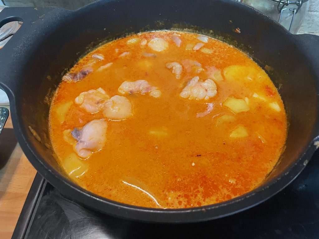 Cuando las patatas están blandas, colocamos los trozos de rape en la olla, las gambas y las chirlas 4 minutos, apagamos el fuego y dejamos que con el calor residual se integren todos los sabores.
