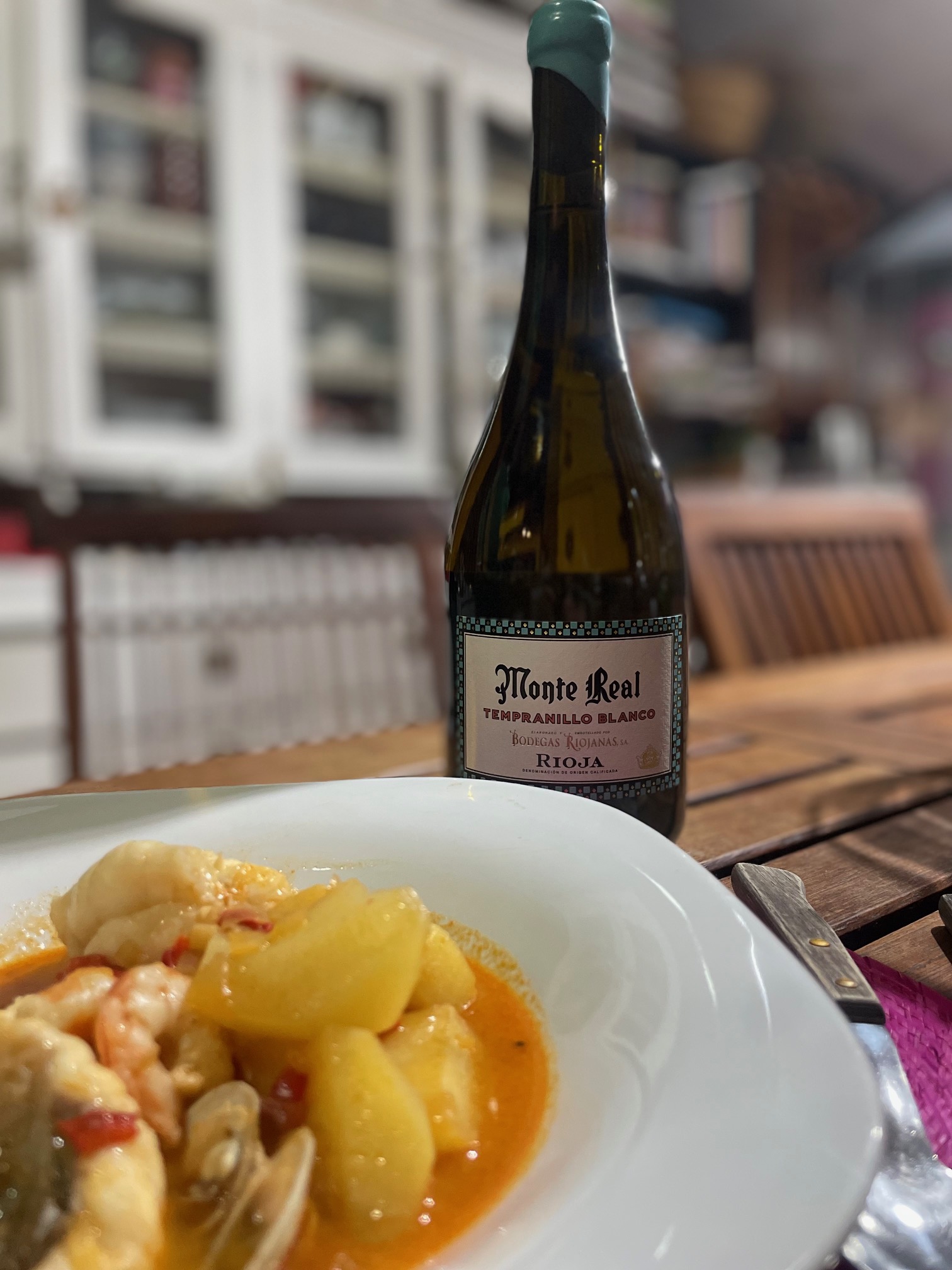 Abrimos una botella de Monte Real, rioja tempranillo blanco de Bodegas Riojanas, que tiene un color amarillo ligeramente dorado, fresco, untuoso. Un auténtico descubrimiento en constante evolución que sorprenderá a los paladares que buscan blancos complejos y singulares.
