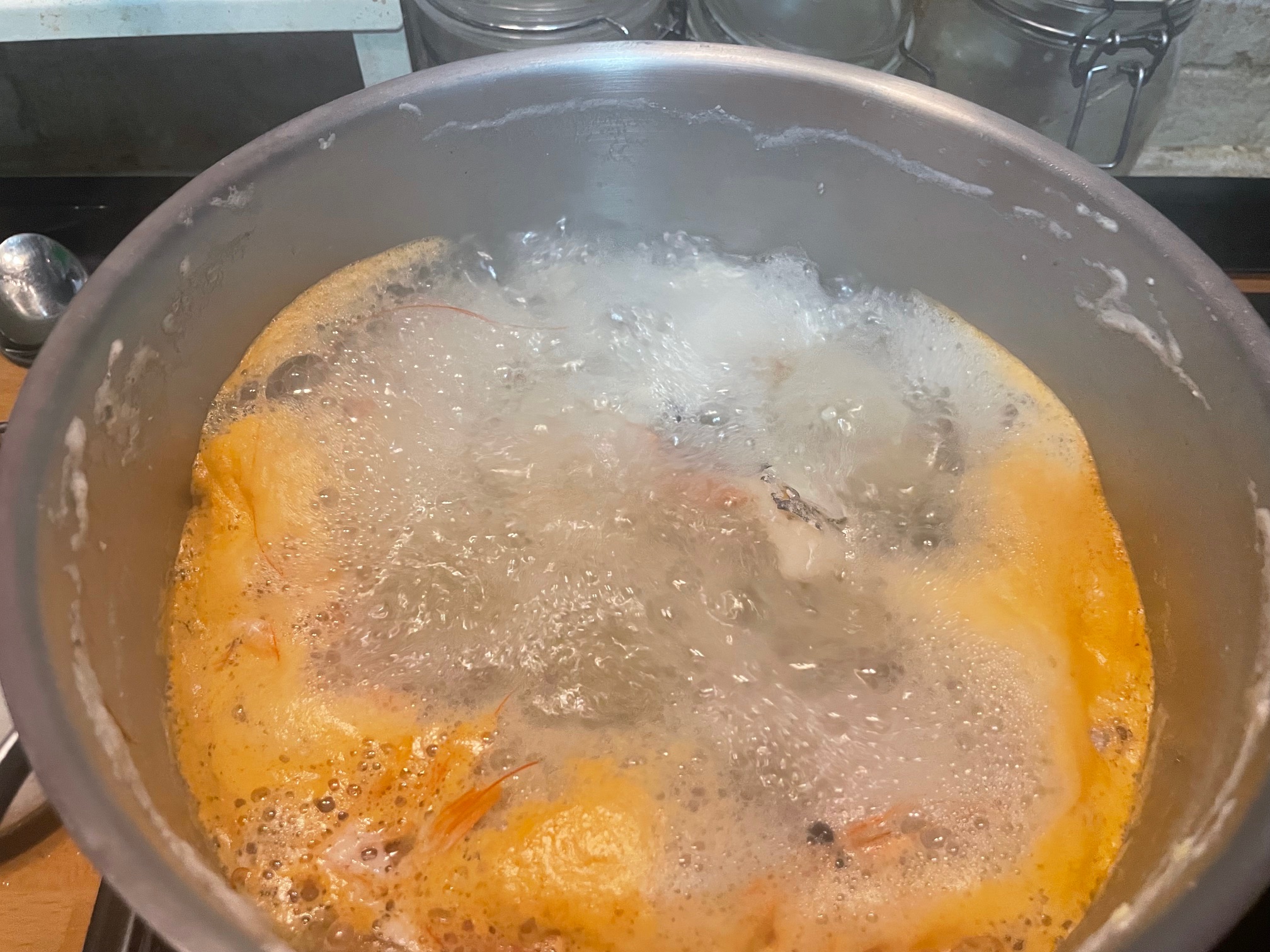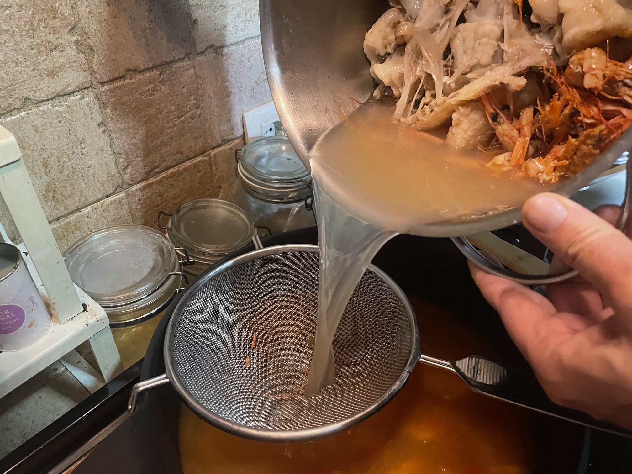 Para preparar nuestro caldo (que es la base del sabor de nuestro guiso) Cocemos los huesos de rape, las cabezas y peladuras de las gambas y añadimos el caldo de las chirlas y reservamos