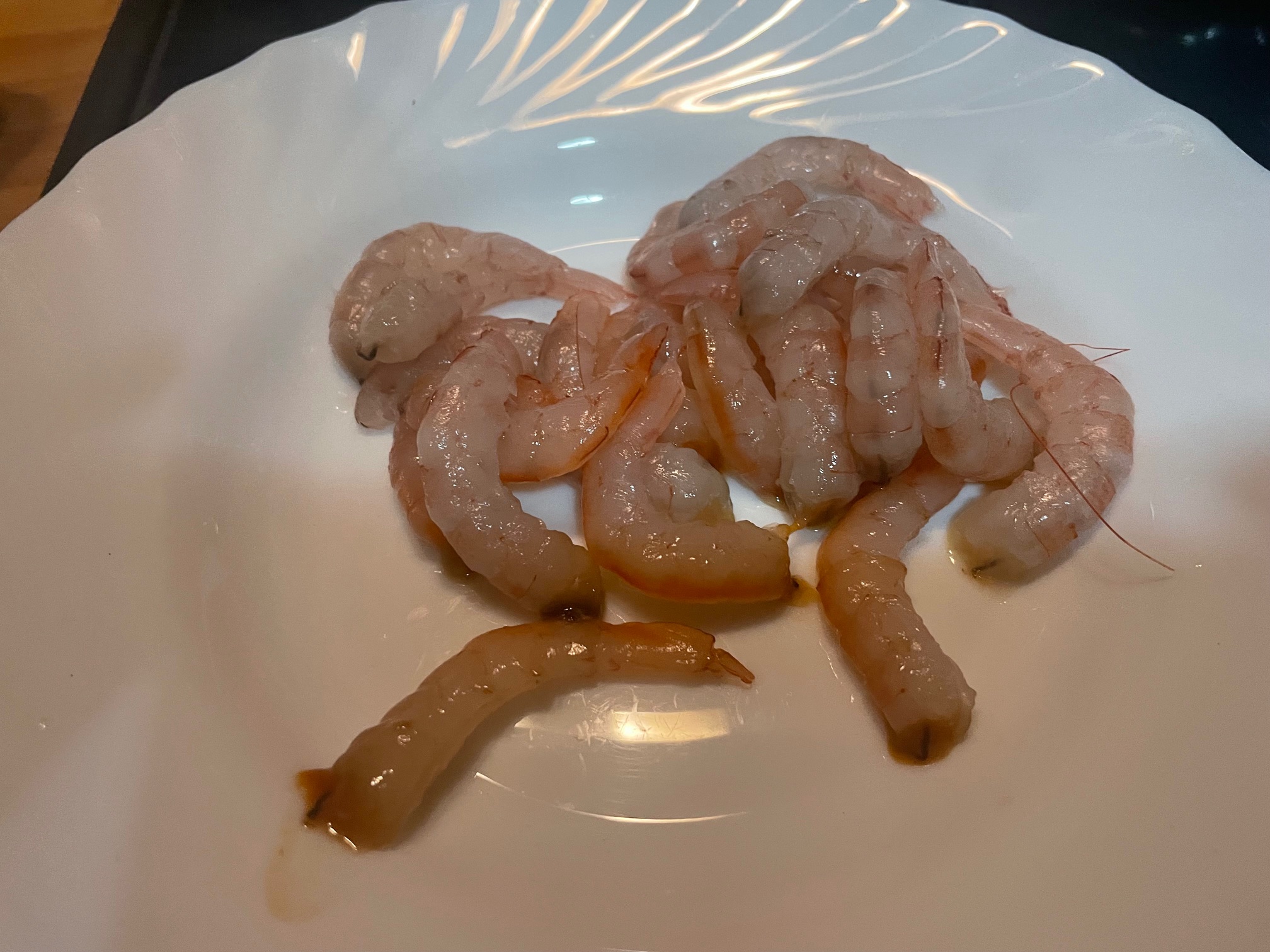 Pelamos las gambas y cocemos las chirlas en vino blanco