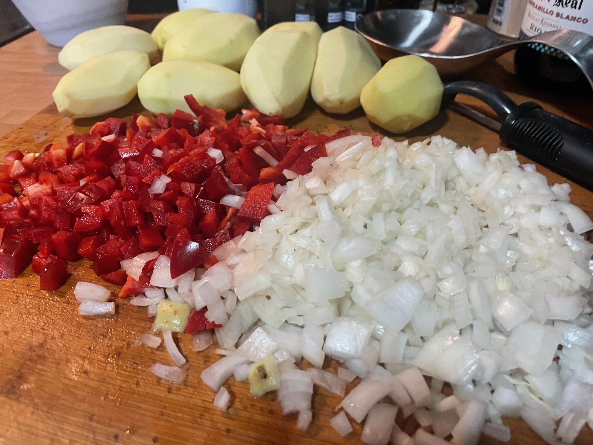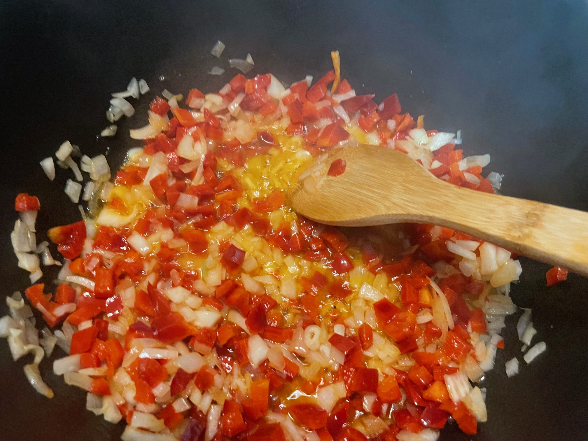 Picamos el pimiento rojo y la cebolla y pochamos en la olla con un poco de aceite