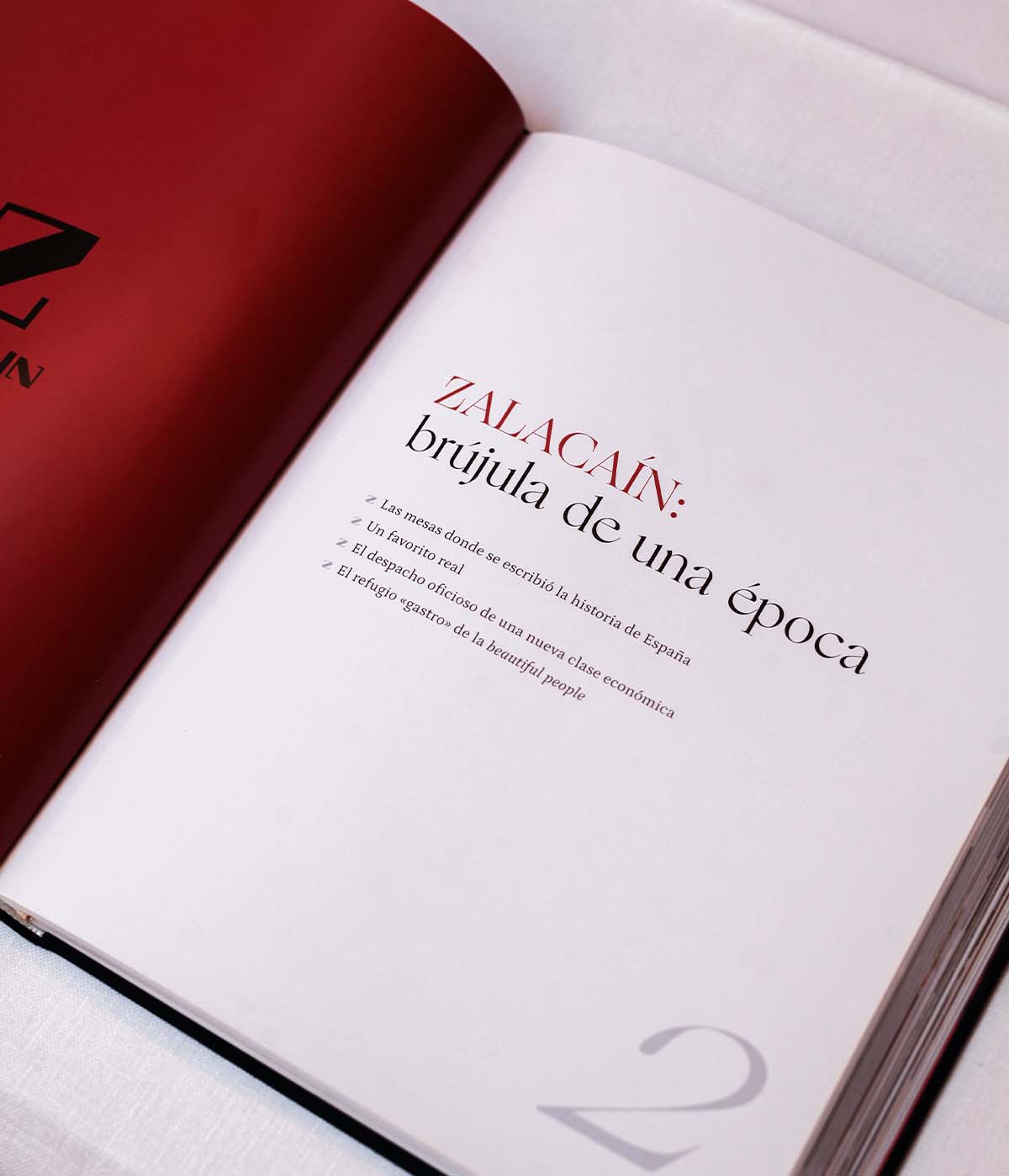 Con una exquisita encuadernación y diseño “Zalacaín 50 Años. Escenario Gastronómico del S.XXI” cuenta con seis capítulos en los que se compila un repaso a su historia desde su fundación en 1973, su destacado papel como restaurante de referencia de la alta sociedad y clase política en la sociedad española, sus clientes más célebres, los miembros de la familia Zalacaín y, por su puesto, su gastronomía y su bodega. Así, el primer capítulo se titula: “Zalacaín: así se gestó un clásico”, el segundo: “Zalacaín: brújula de una época”, el tercero: “Los fogones de Zalacaín: inspiración y evolución”, el cuarto, “La familia Zalacaín”, el quinto: “La experiencia Zalacaín: más allá del paladar”, y el sexto y último: “Zalacaín: la nueva vida de un gran clásico”.