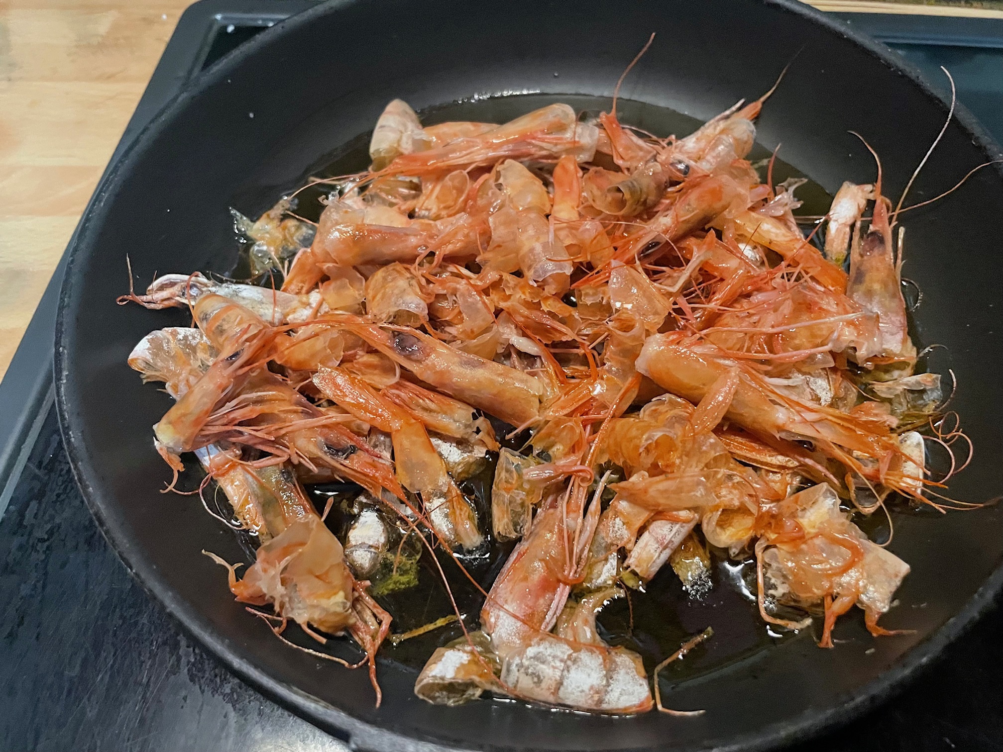 Pelamos las gambas y colocamos cascaras y cabezas en la sartén con un buen aceite de oliva