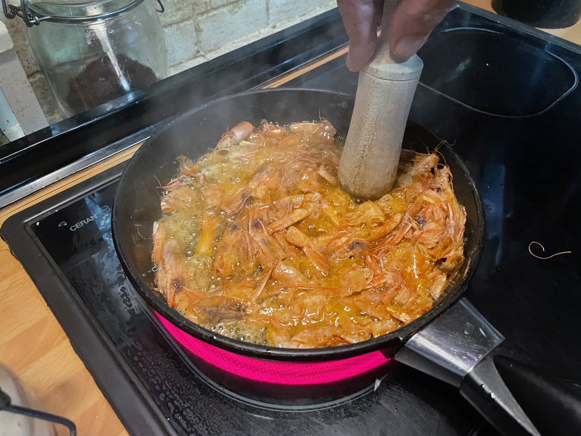 Introducimos las gambas, tapamos la sartén y retiramos